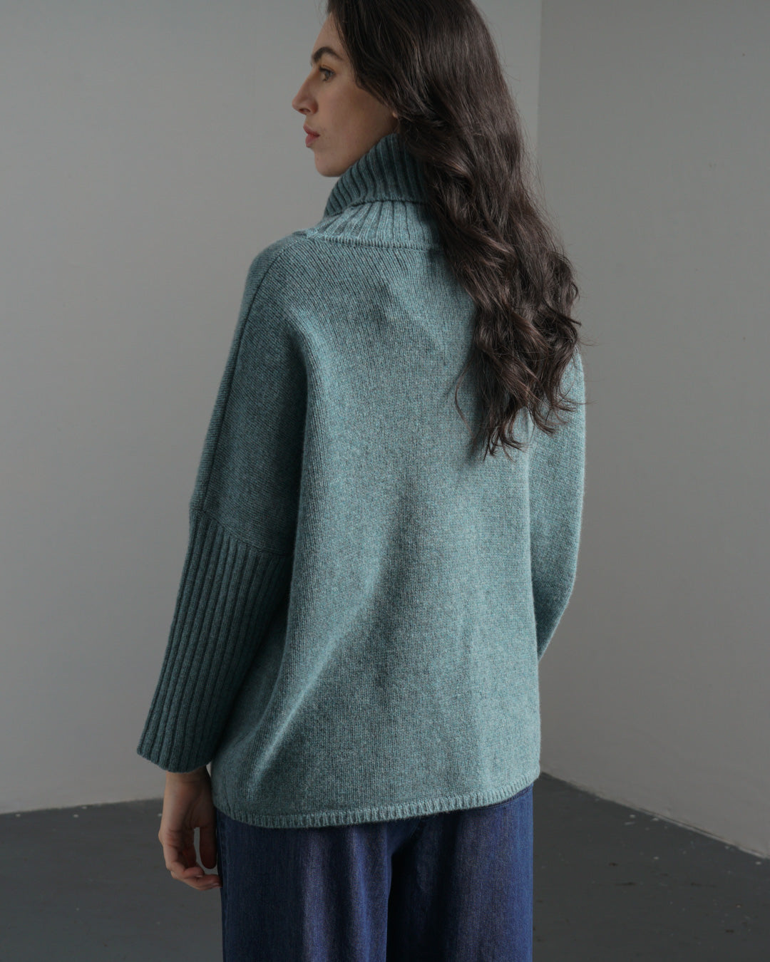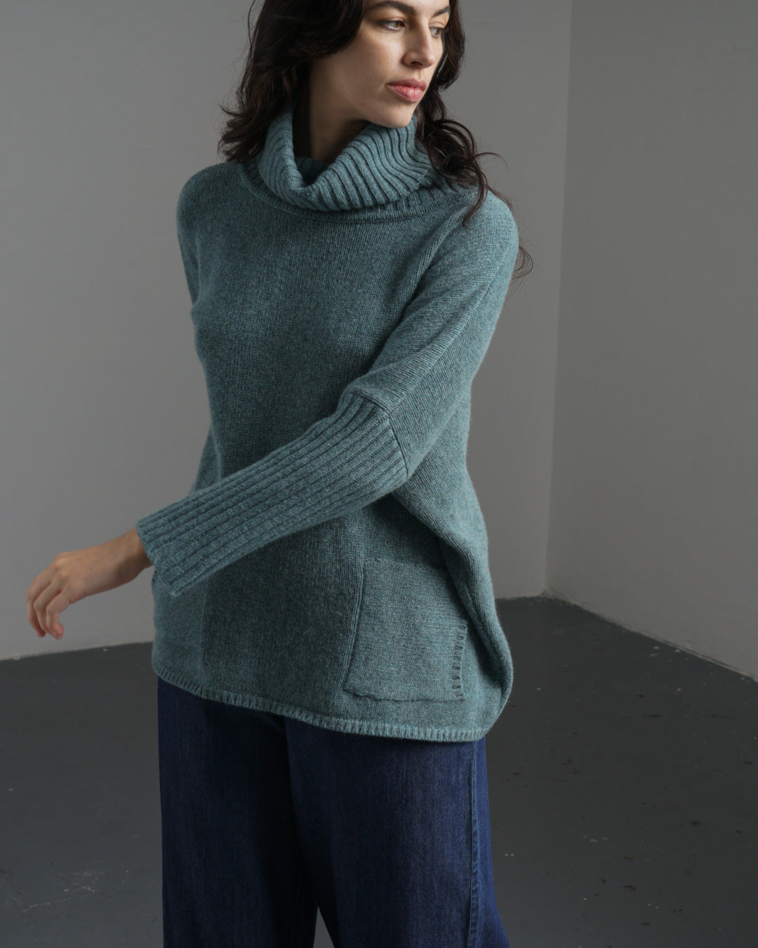 Our Pure lambswool turtleneck jumper is extra roomy and cosy—a heavyweight knit with a loose cocooning fit that feels like a warm hug. Designed with comfort and wearability in mind, it features a wide ribbed roll neck, batwing sleeves with long, slim ribbed cuffs, and two front patch pockets to keep your hands cosy, all in a smoky blue.