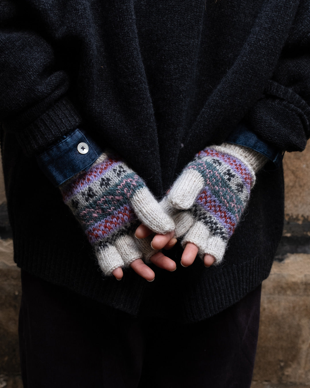 Warm, cosy fingerless gloves with a fair isle pattern. Turn these Fingerless gloves into mittens with the simple fold flap. 100% Wool.