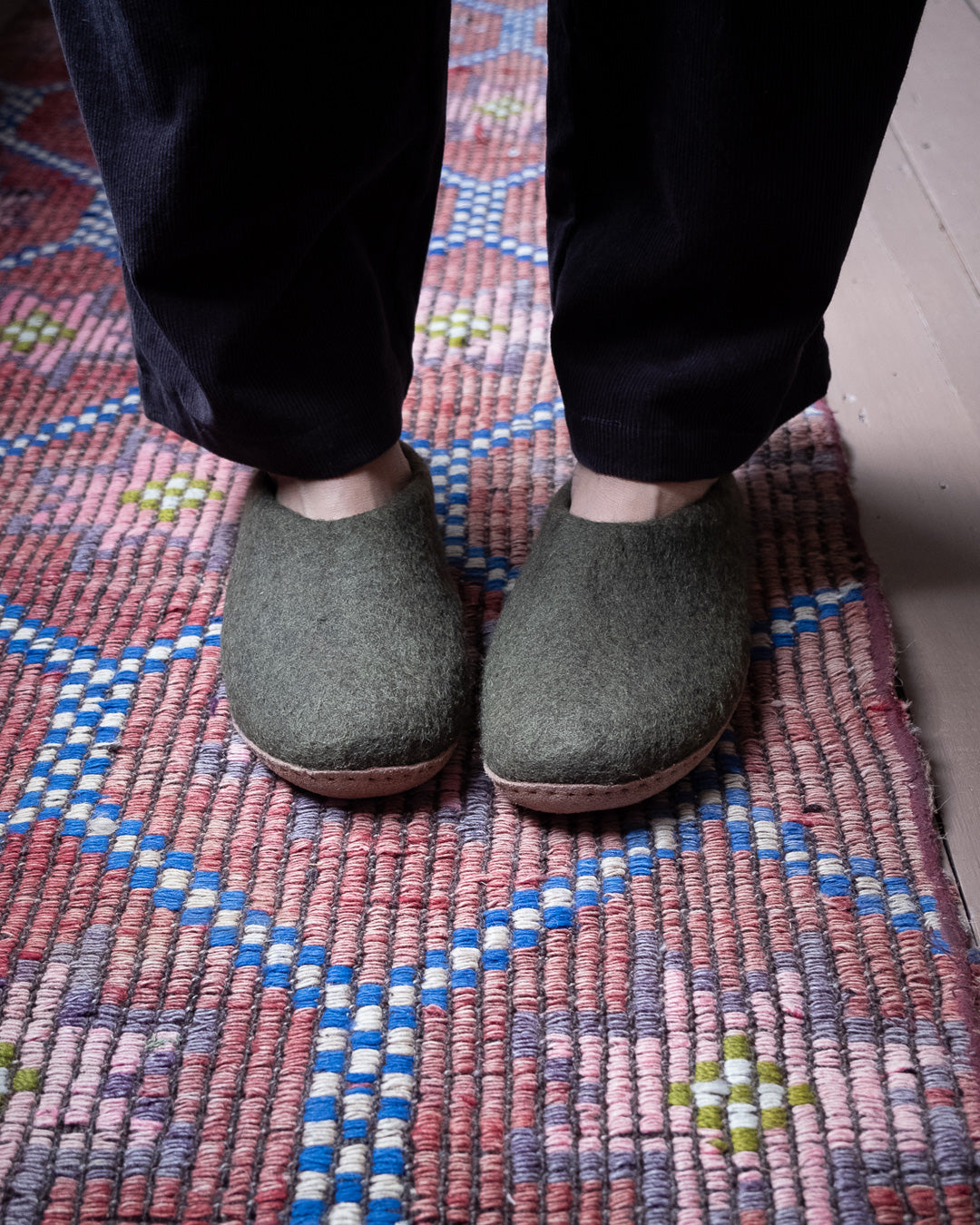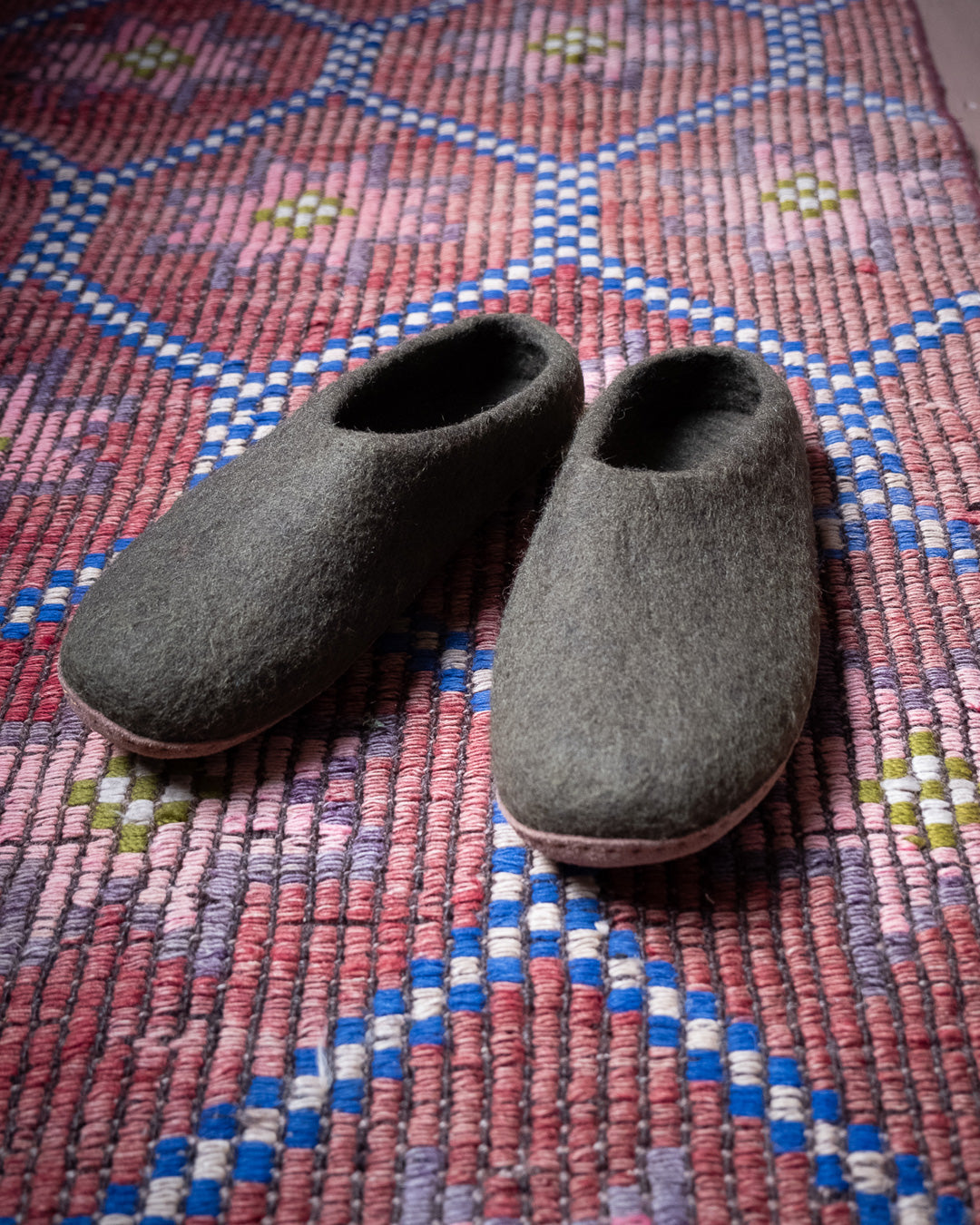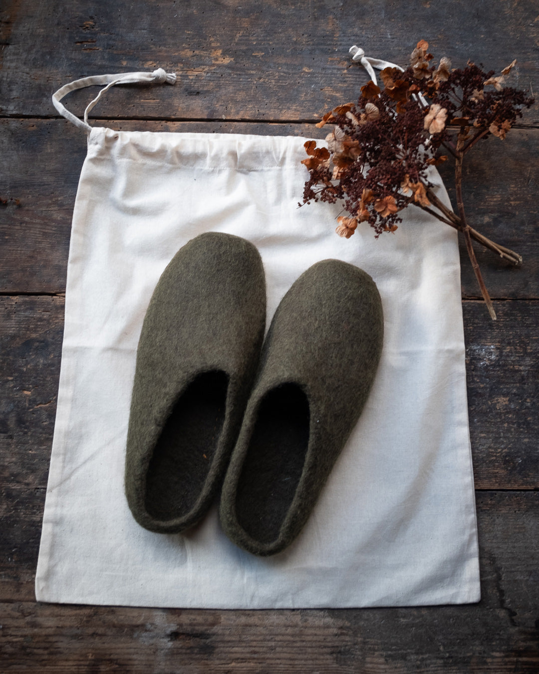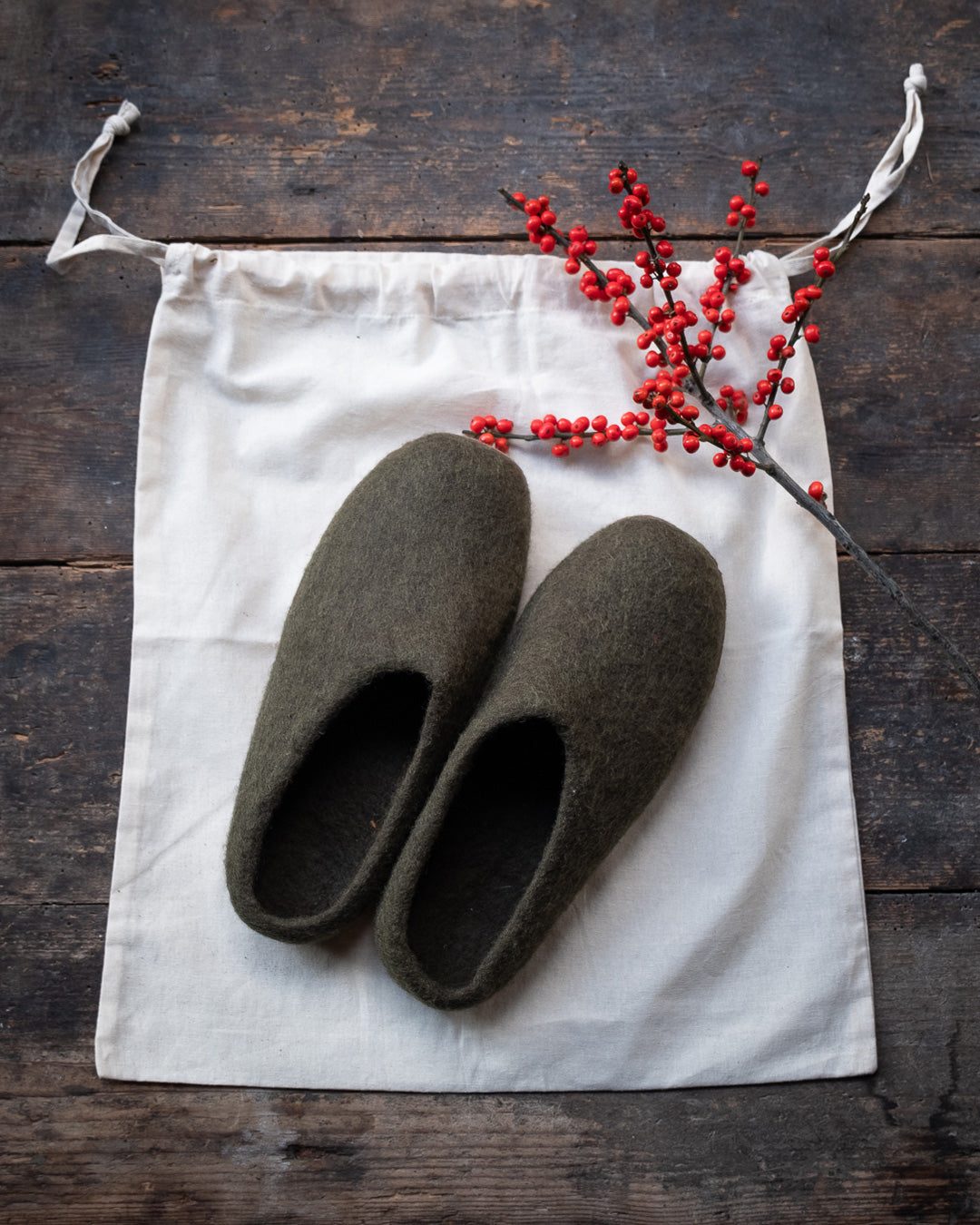 The Greta handmade slip-on mule slippers are individually handcrafted using 100% sheep wool felt. Inside sole padding for extra comfort with a hard-wearing suede sole. Soft, cosy & light. Our best-selling felted wool slippers are the ultimate home accessory and come with a drawstring cotton bag, making them the perfect gift.