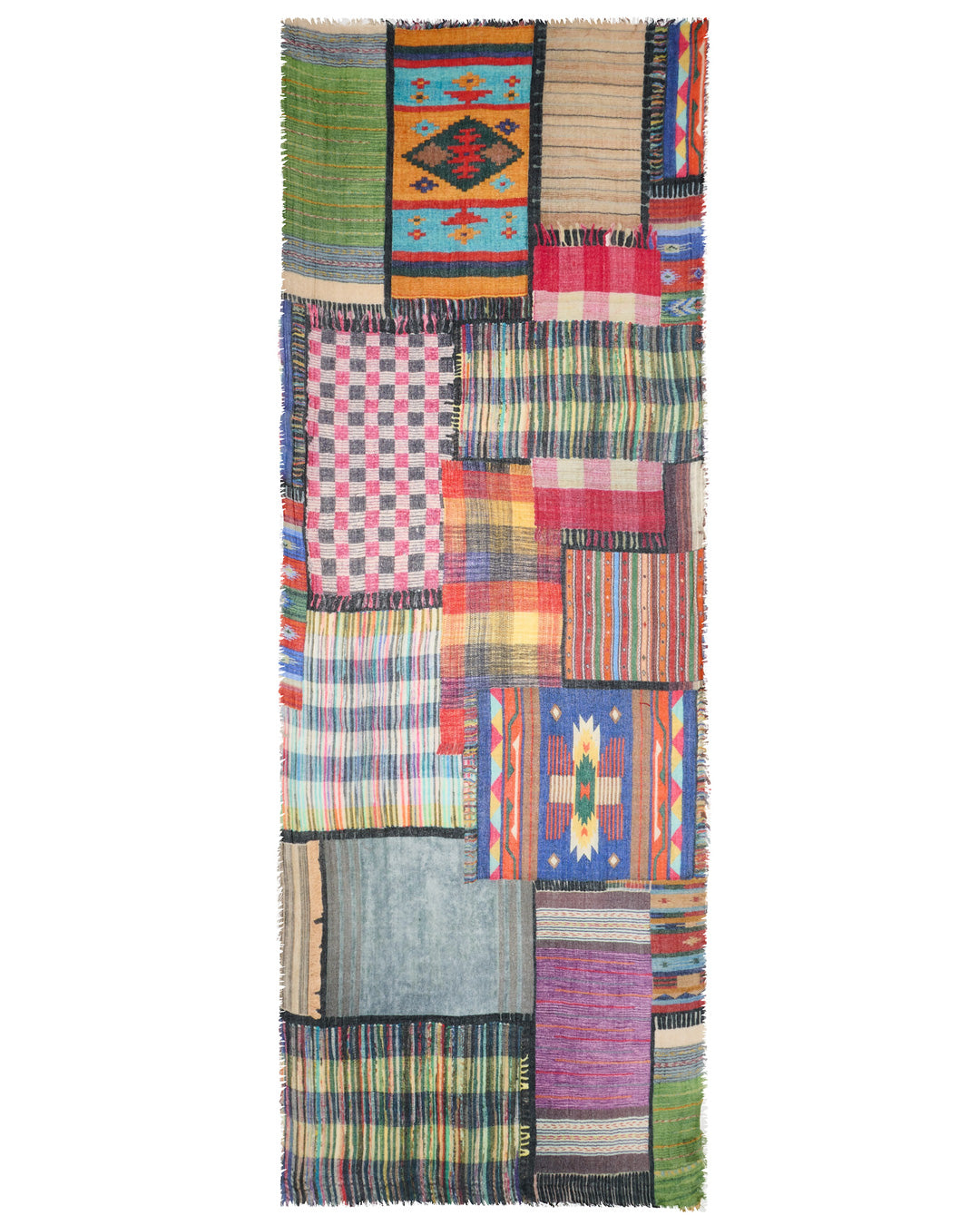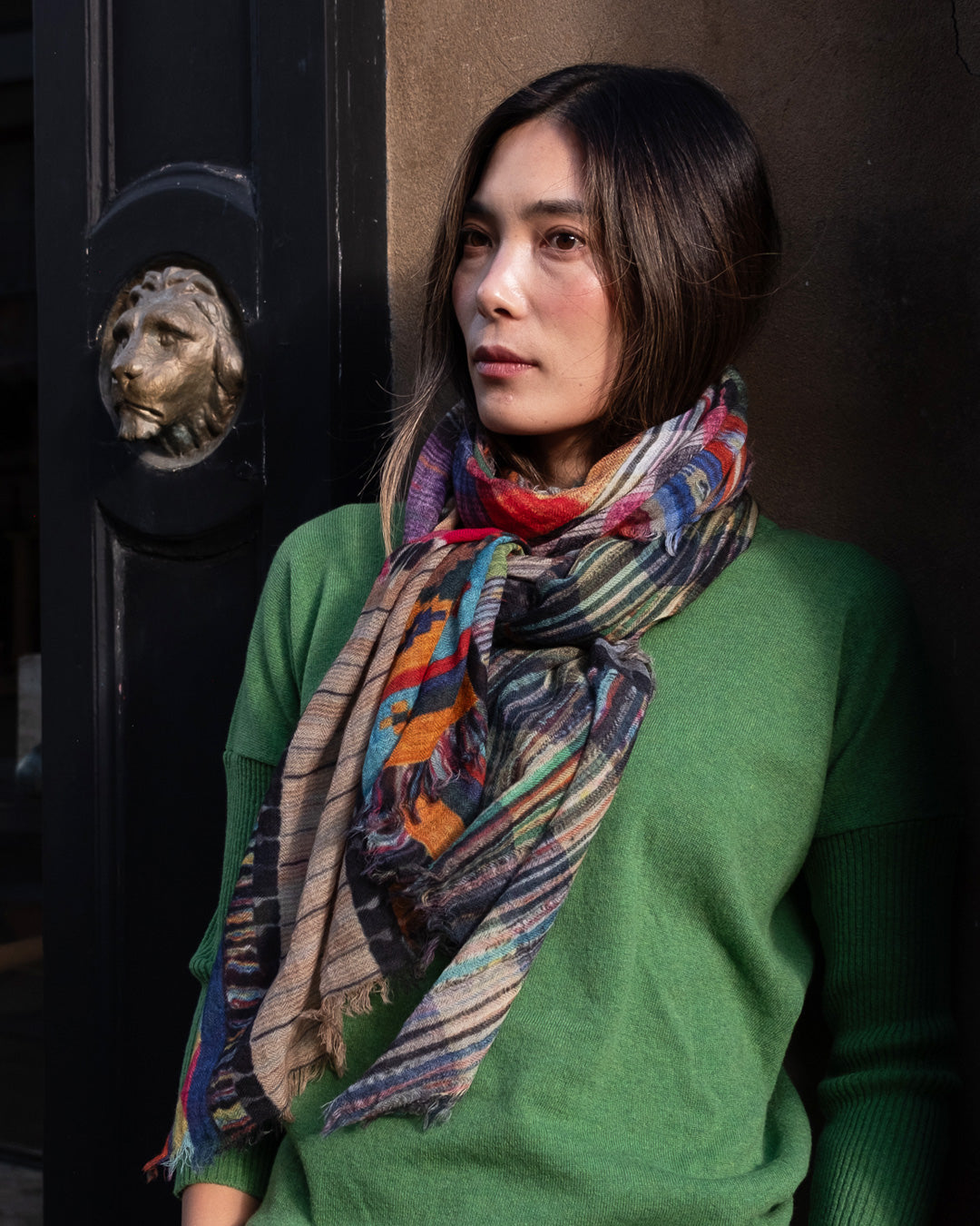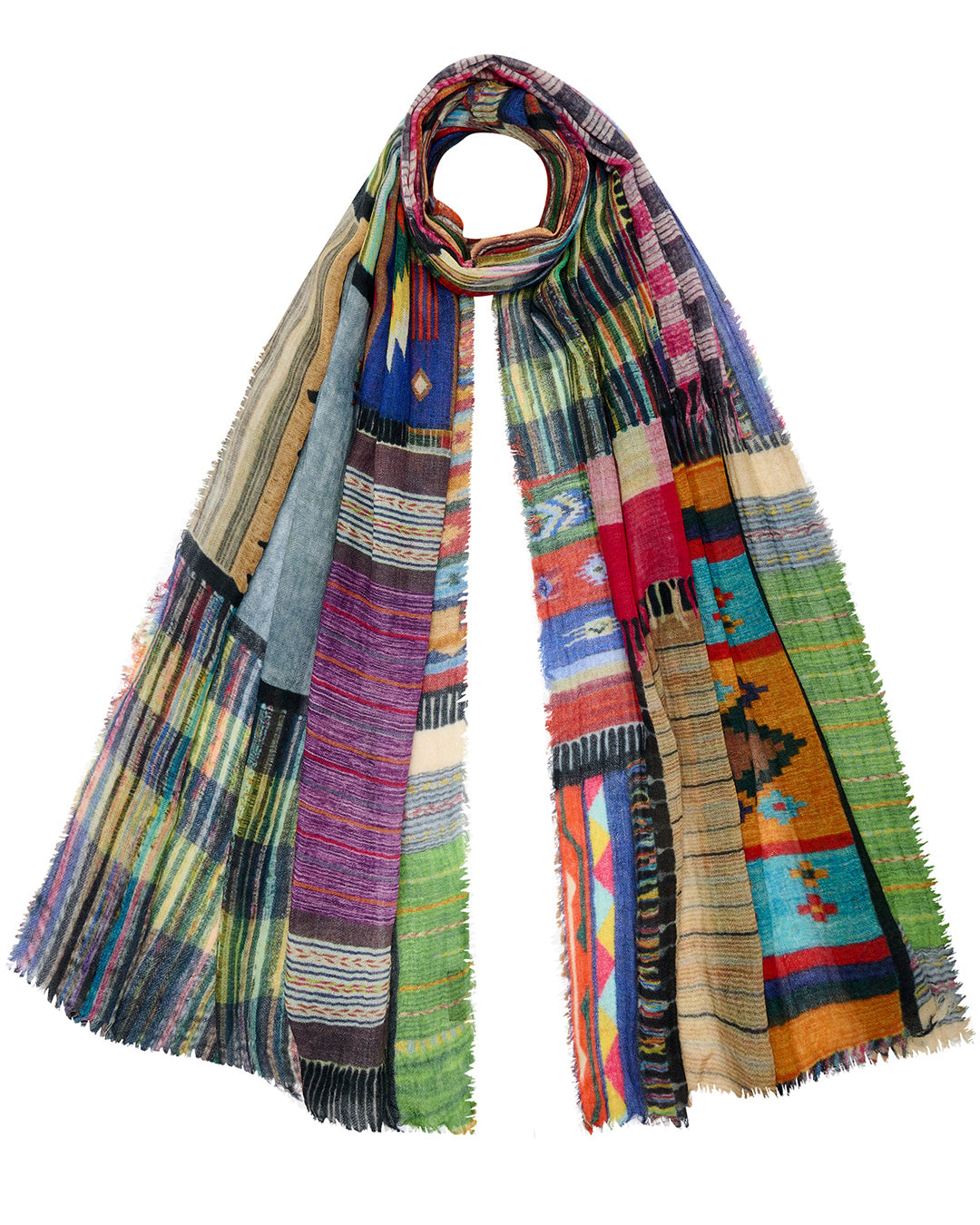 Lightweight and luxuriously soft wool scarf with an exciting collage of prints layered over one another - bright stripes, plaids and Ikat motifs - in a multicoloured palette.It's lovely and long, so you can wear it in lots of different ways; And easy way to add colour and extra cosiness to any look .An unfinished and faded edge gives this scarf a raw feel.