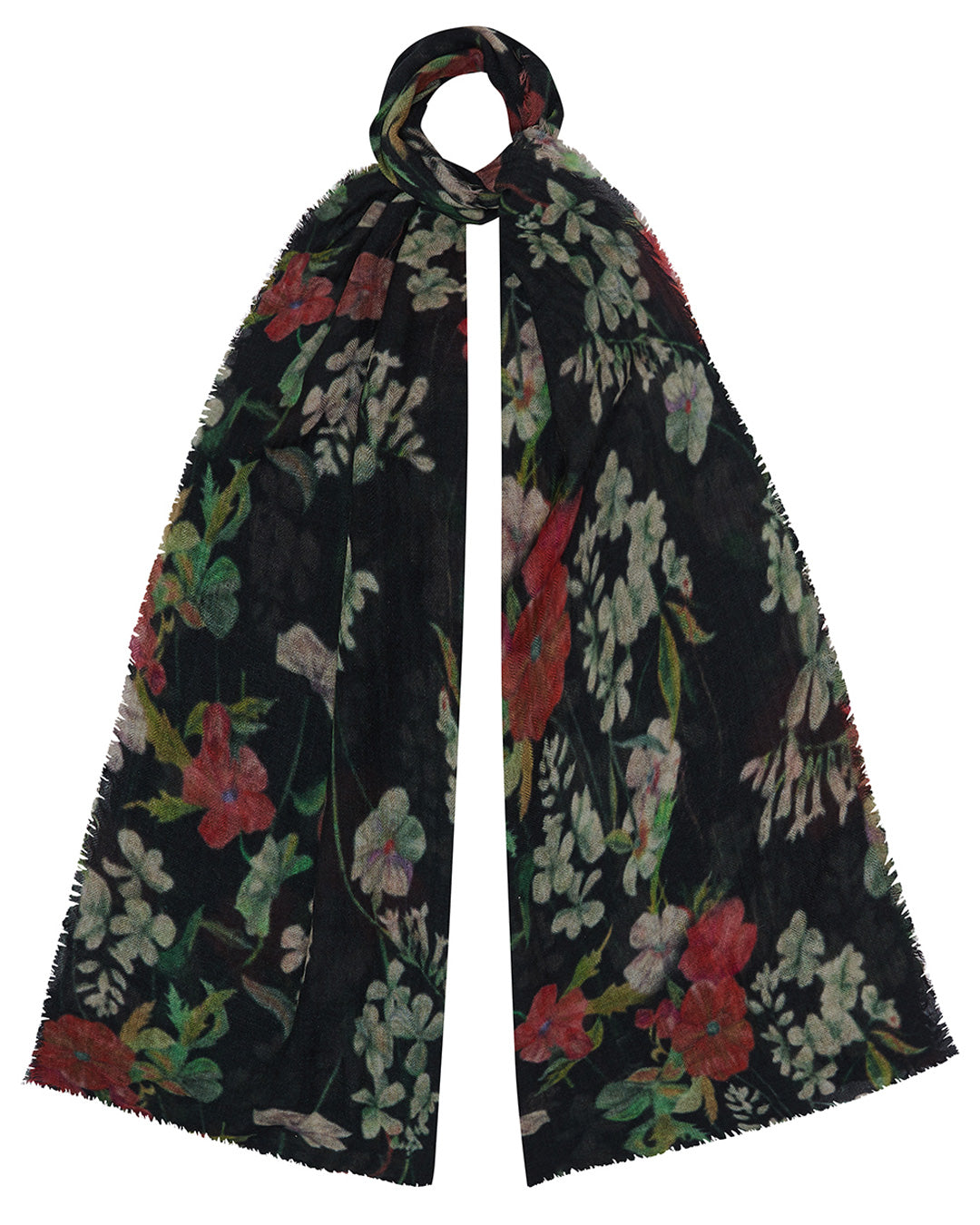 Lightweight and luxuriously soft wool scarf with mystical black floral print.It's lovely and long, so you can wear it in lots of different ways; And easy way to add colour and extra cosiness to any look .An unfinished and faded edge gives this scarf a raw feel.
