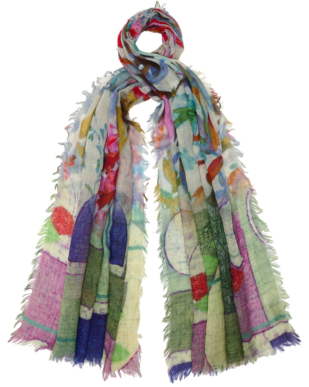 Lightweight and luxuriously soft wool scarf with a array of vibrant flowers and shapes.It's lovely and long, so you can wear it in lots of different ways; And easy way to add colour and extra cosiness to any look .An unfinished and faded edge gives this scarf a raw feel.
