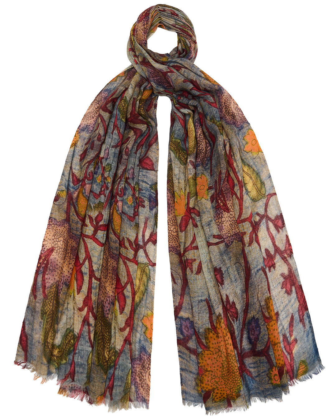 Lightweight and luxuriously soft wool scarf with a warming and mystical floral print .It's lovely and long, so you can wear it in lots of different ways; And easy way to add colour and extra cosiness to any look .An unfinished and faded edge gives this scarf a raw feel.