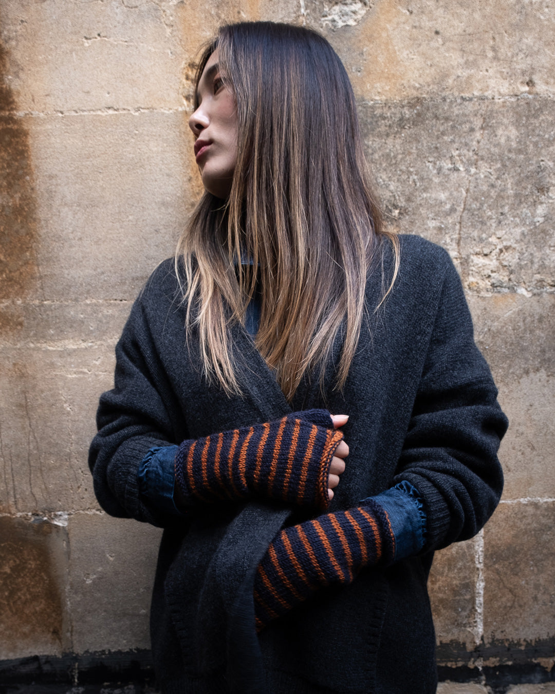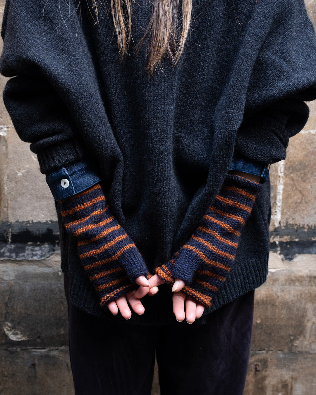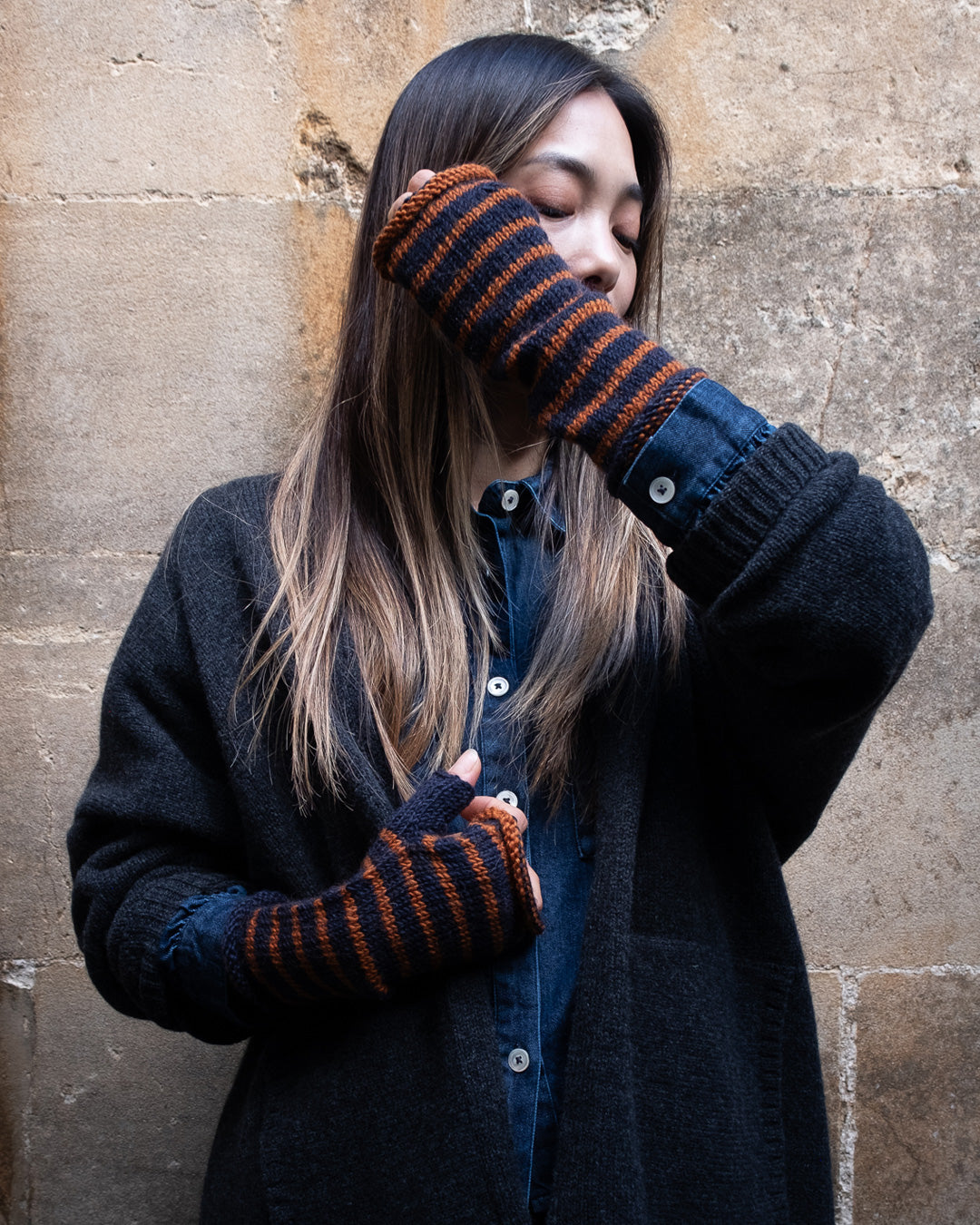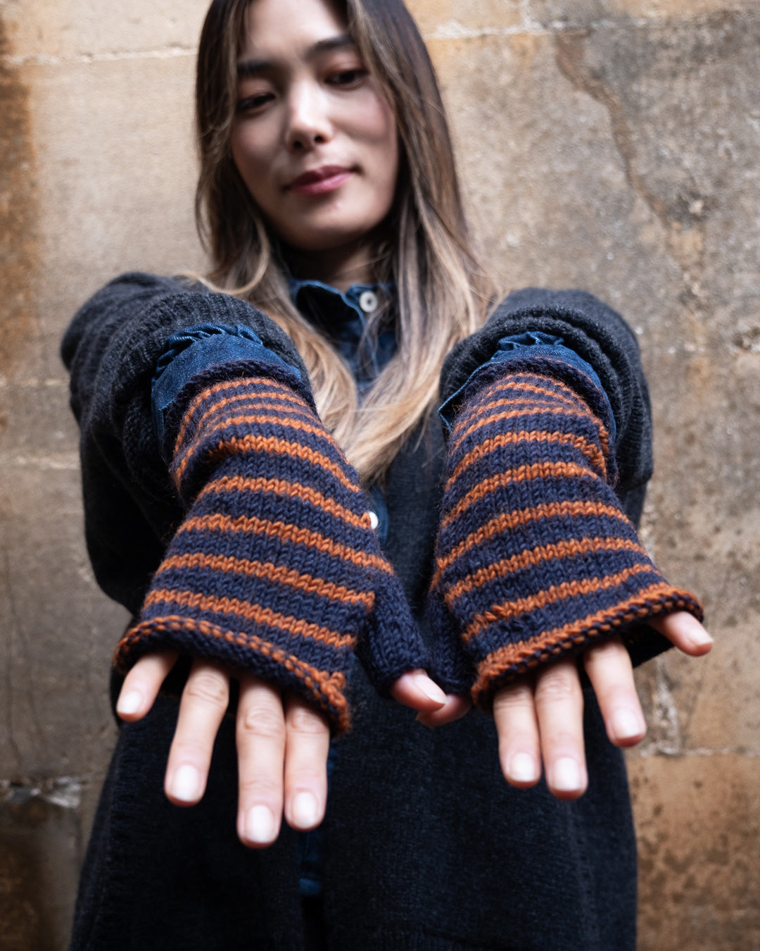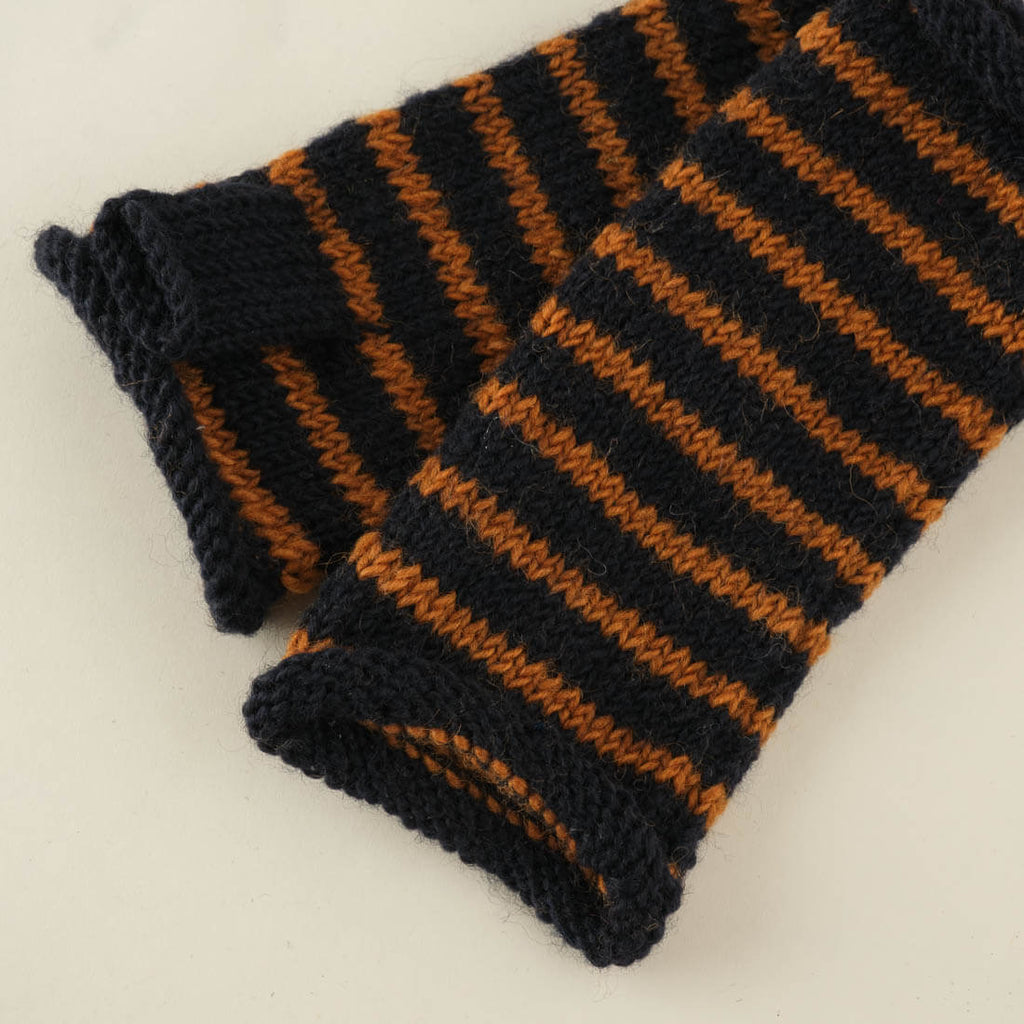 Long and cosy fingerless gloves with an contrast stripe. Roll edge at cuffs and fingers opening. Hand knitted in a ladies cooperative in Nepal. 25cm long. 100% Wool.