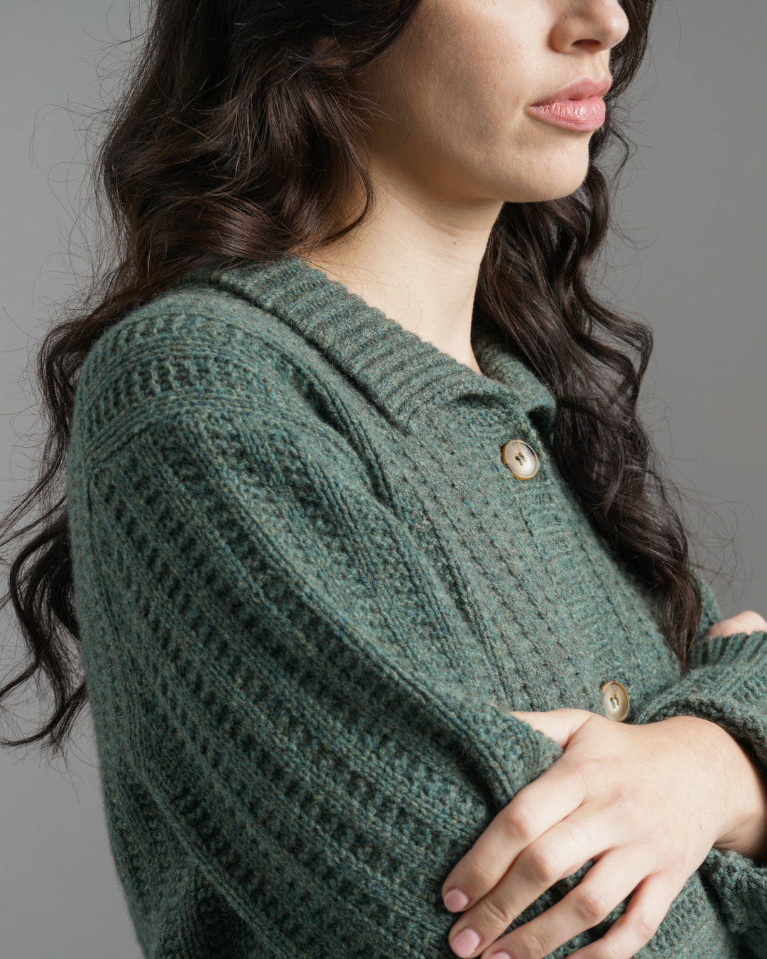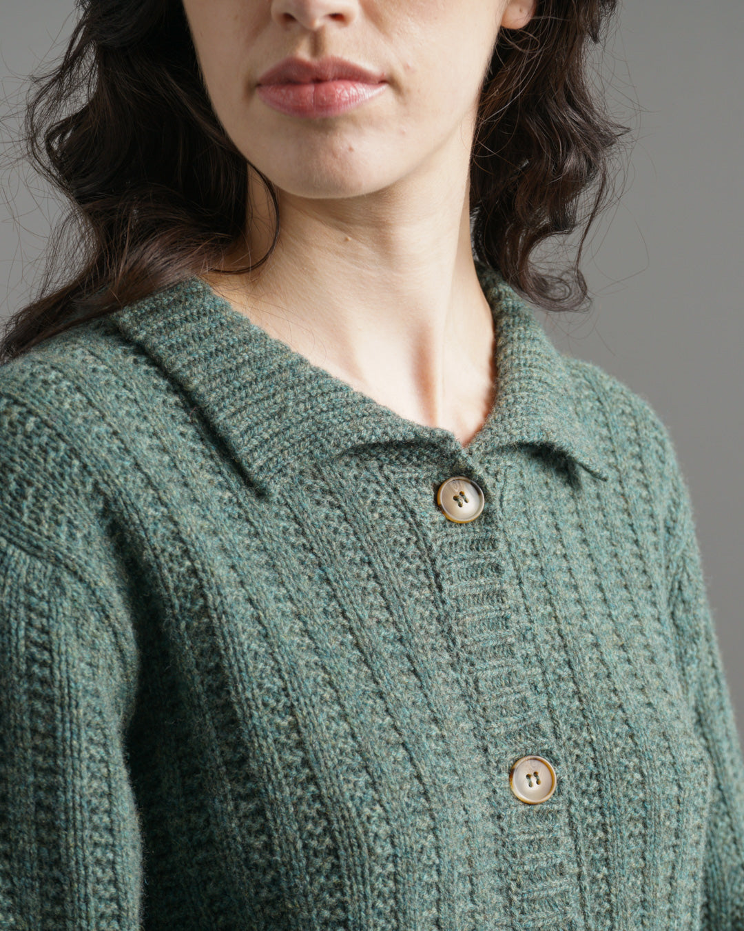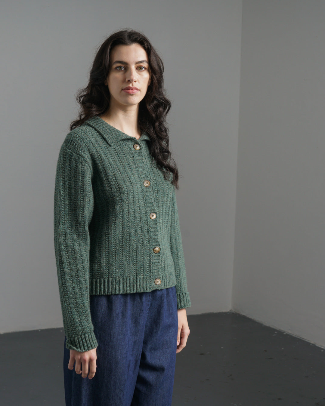 The yarn is spun at a mill in Yorkshire that is dedicated to producing high-quality yarn in bold, unique colours. This wool is loved for its softness, extra warmth, and durability; it also holds its shape well (learn more about the wool we use and its qualities here). This cardigan is a rich peacock green-blue.