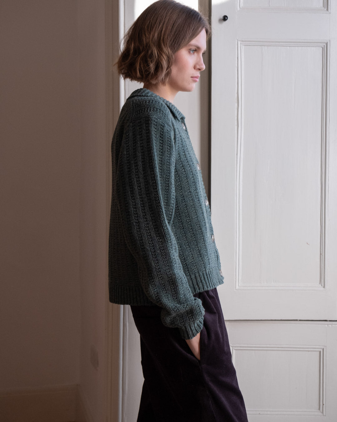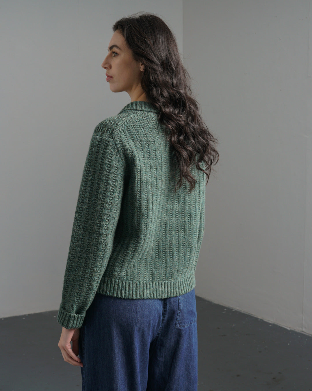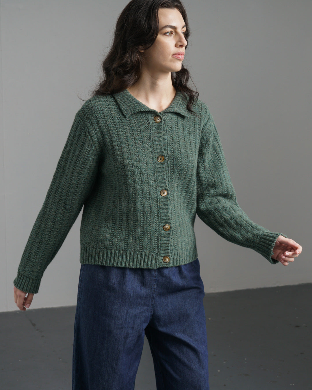 The yarn is spun at a mill in Yorkshire that is dedicated to producing high-quality yarn in bold, unique colours. This wool is loved for its softness, extra warmth, and durability; it also holds its shape well (learn more about the wool we use and its qualities here). This cardigan is a rich peacock green-blue.