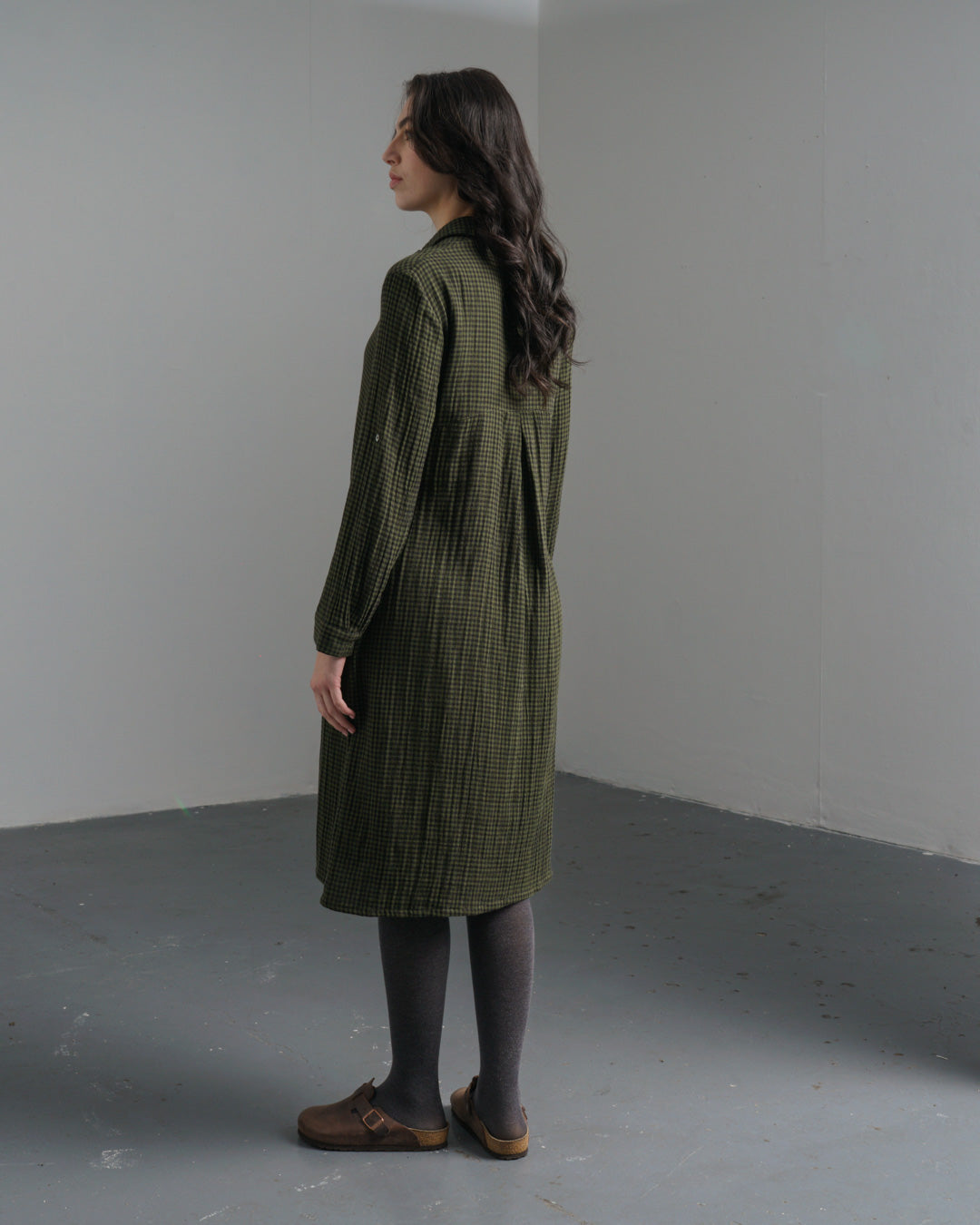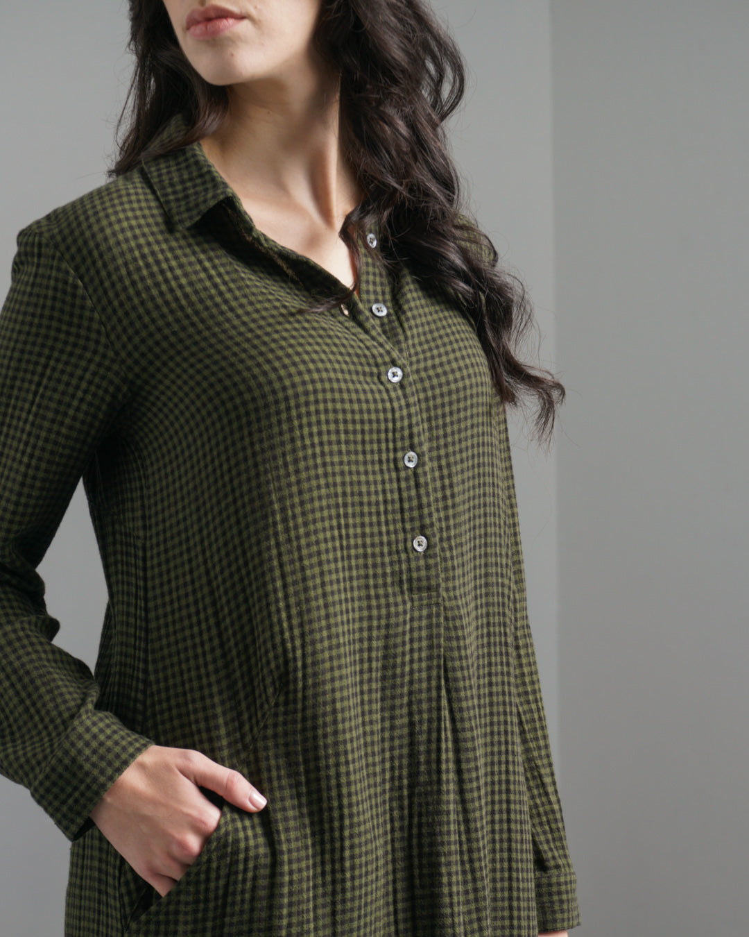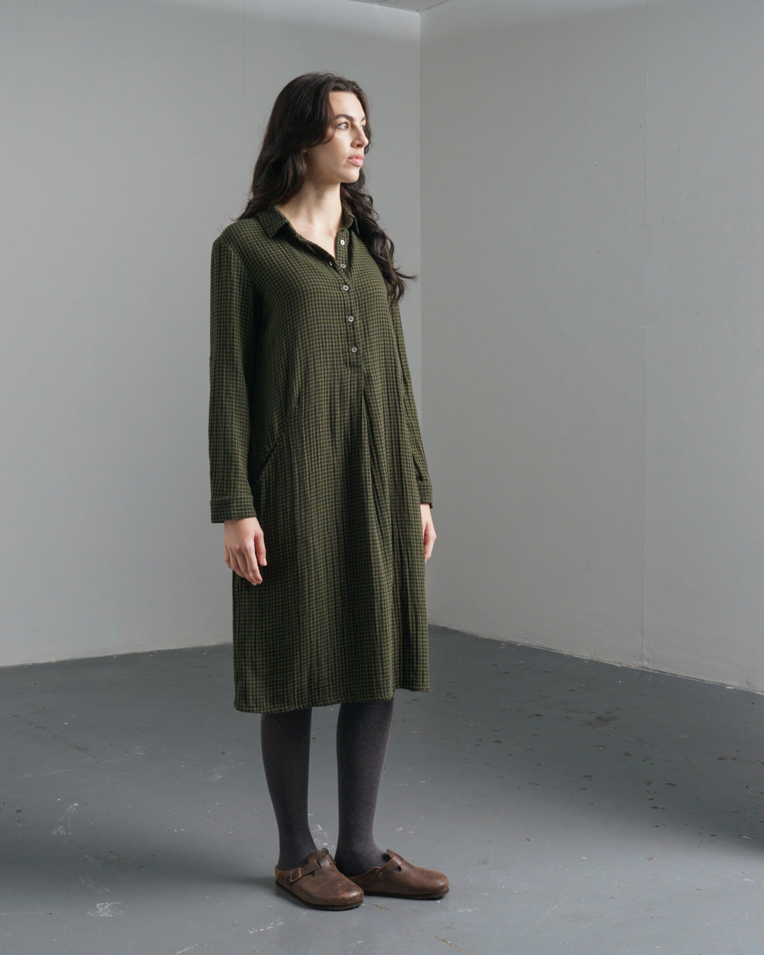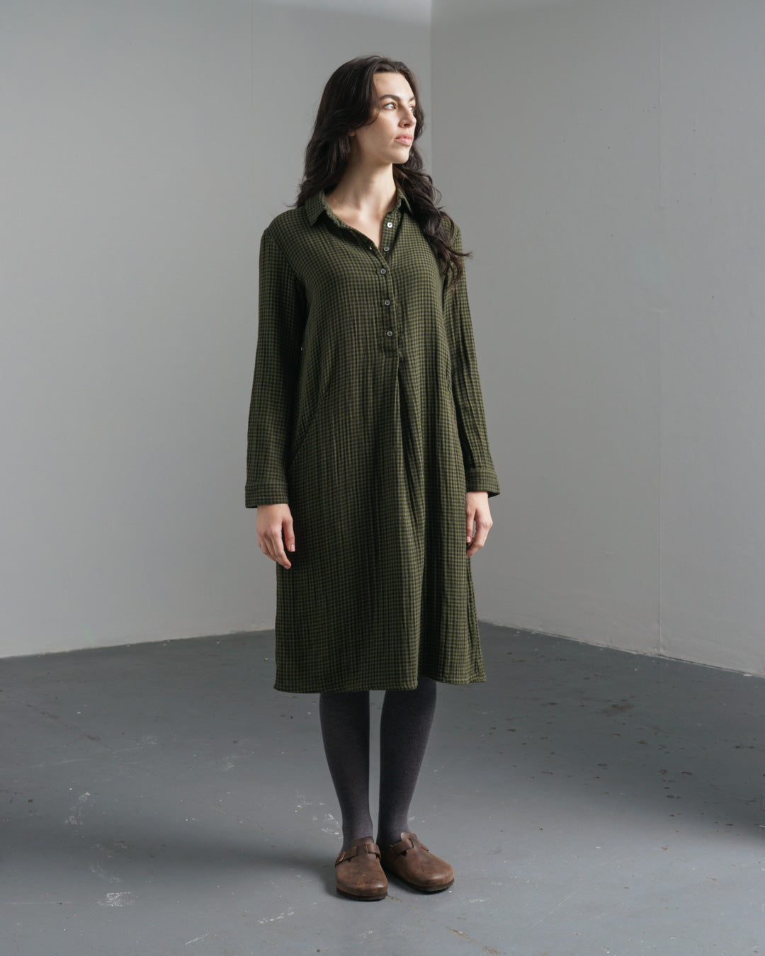 A much-loved BIBICO classic, reimagined this season in a soft, cosy, double gauze cotton in olive green/black small check. The deep green tones and gentle texture make it the perfect dress for cooler days. With its relaxed fit and just the right amount of structure, it offers warmth and comfort. An easy, everyday piece you’ll reach for again and again. Designed with a neat shirt collar, imitation shell buttons, and deep side pockets. Made from 100% cotton—natural, breathable, and crafted to last. An effortless wardrobe staple, made with care.