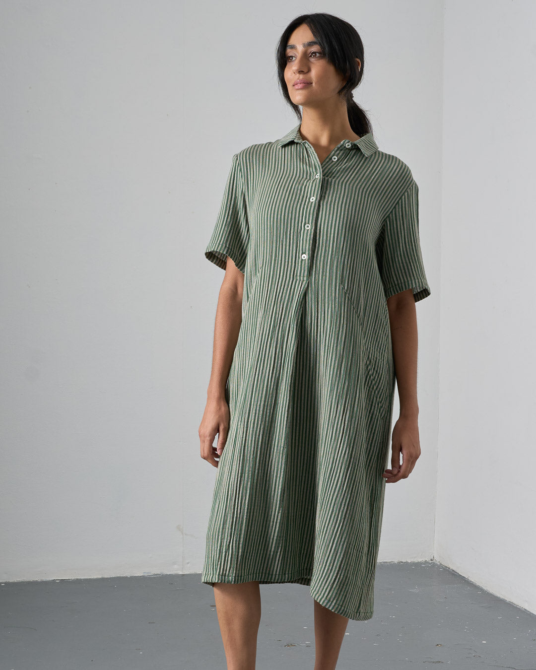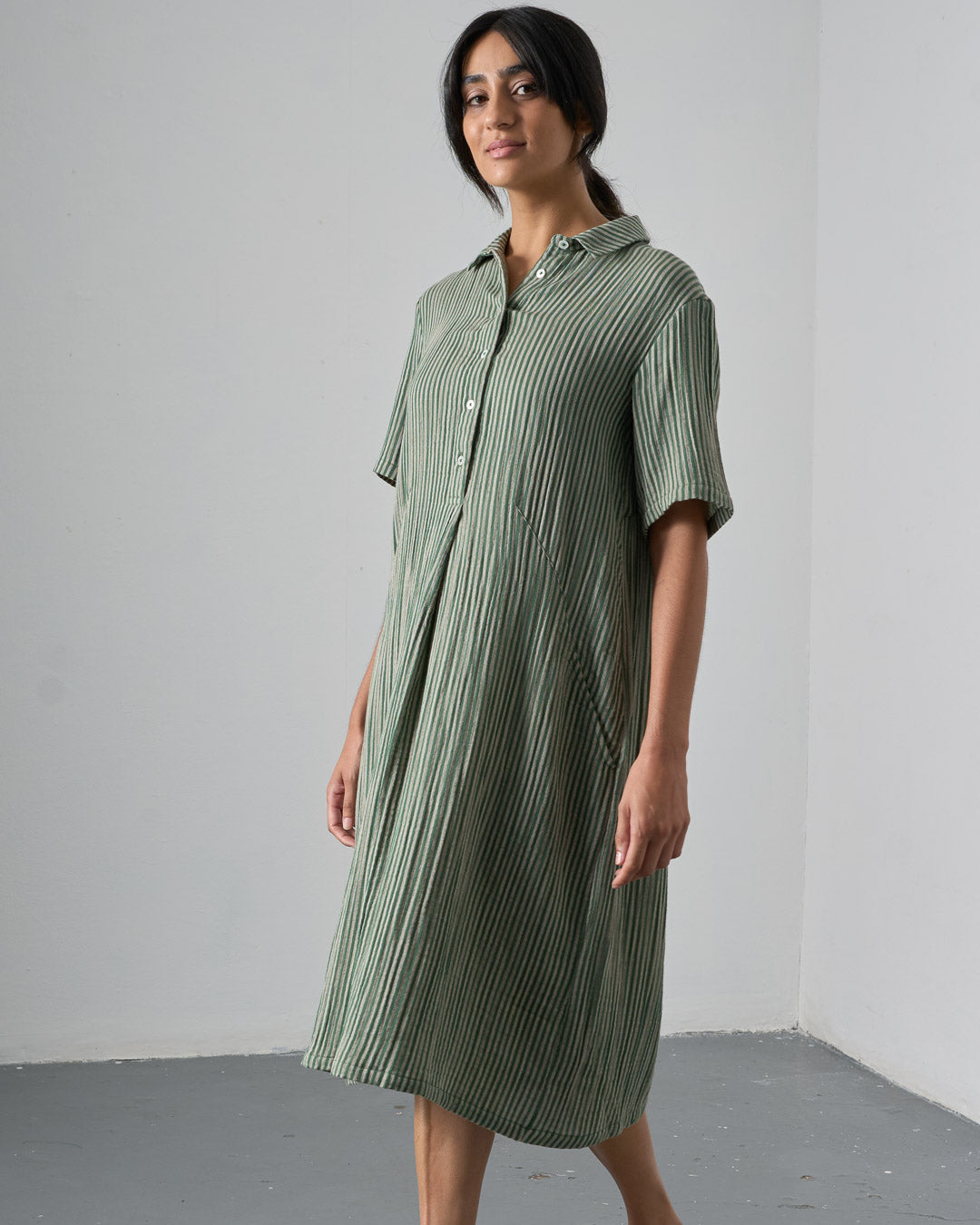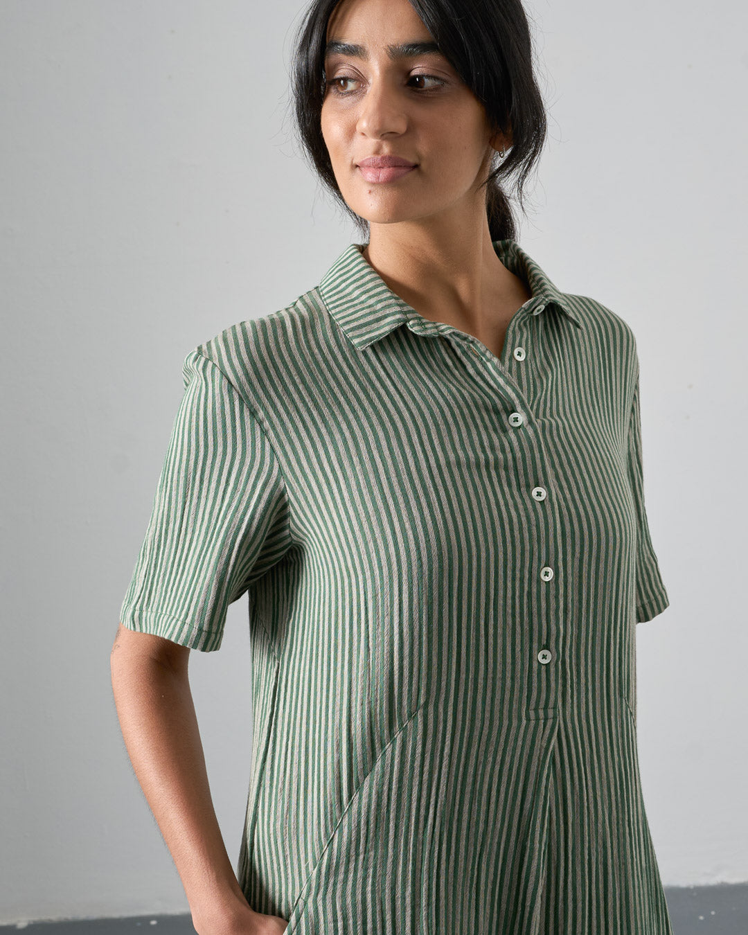 Cotton double gauze shirt dress with a green and ecru stripe. Softly textured and light to wear. Relaxed, straight shape, falling just below the knee. Shirt collar, half-buttoned placket, deep, practical side pockets. Soft, light, and easy to wear day to day.