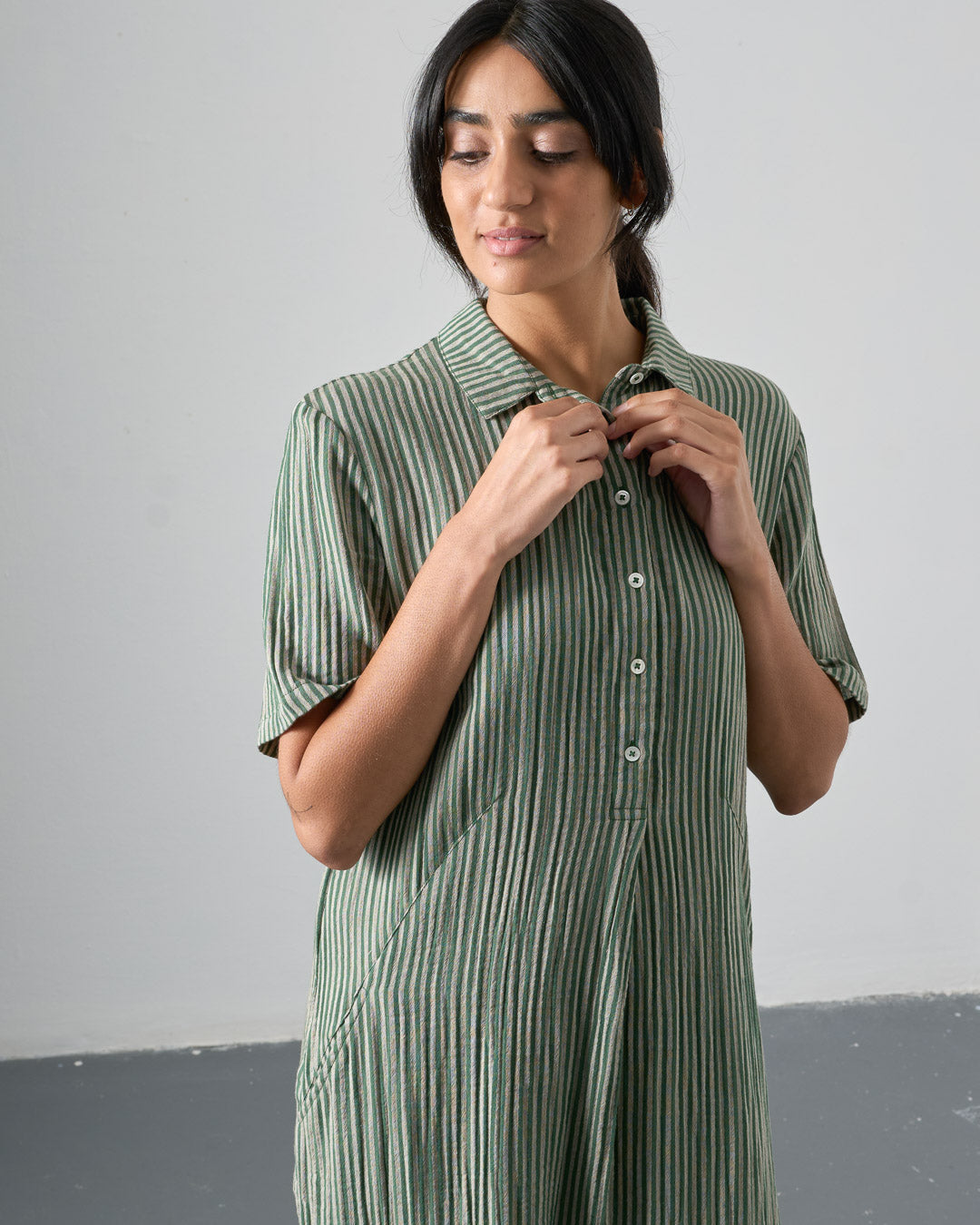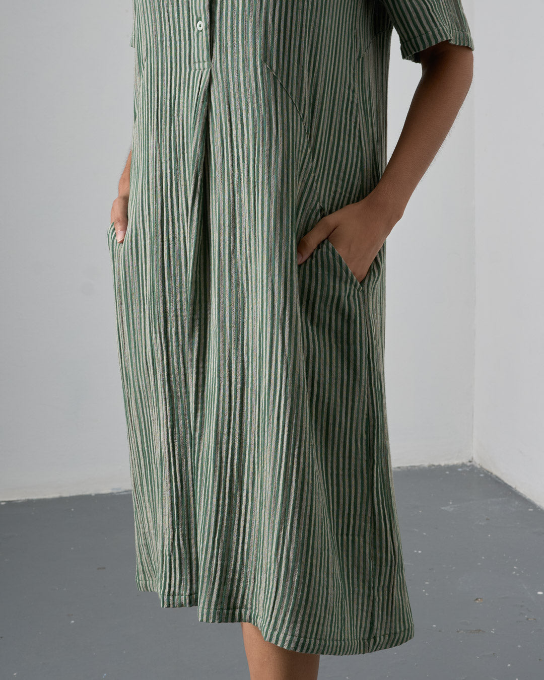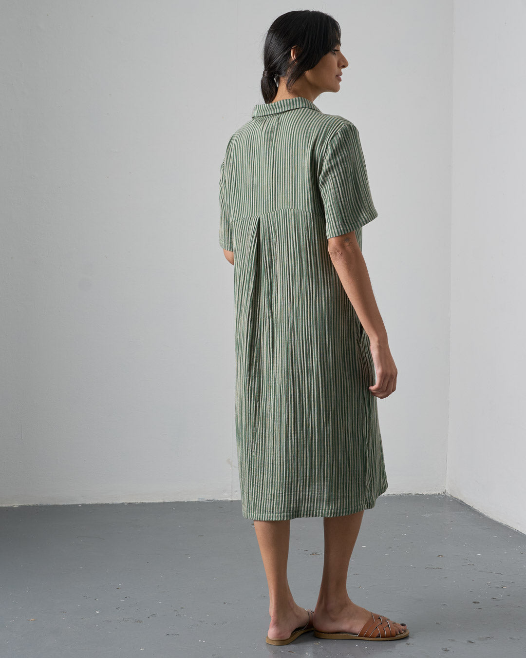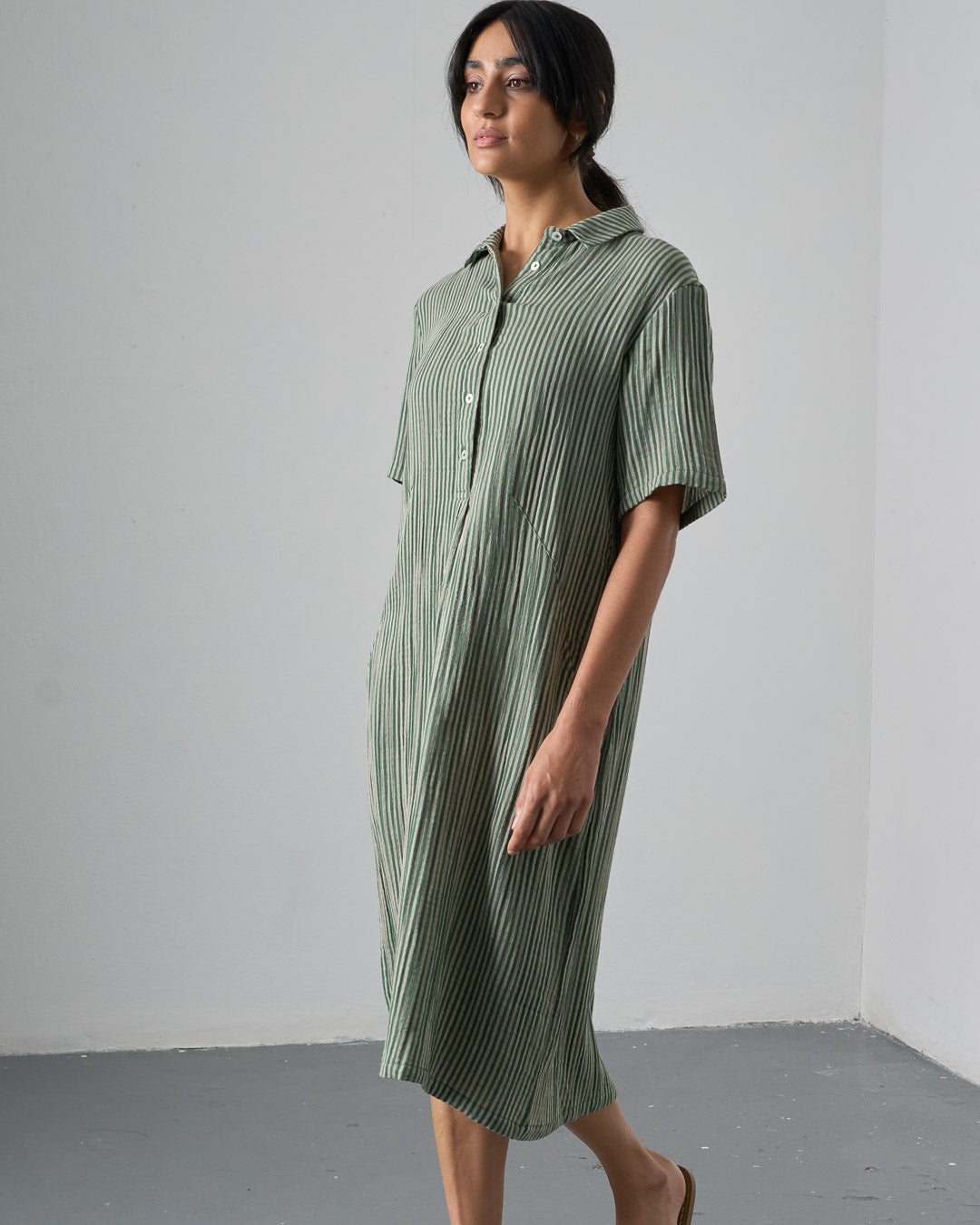 Cotton double gauze shirt dress with a green and ecru stripe. Softly textured and light to wear. Relaxed, straight shape, falling just below the knee. Shirt collar, half-buttoned placket, deep, practical side pockets. Soft, light, and easy to wear day to day.