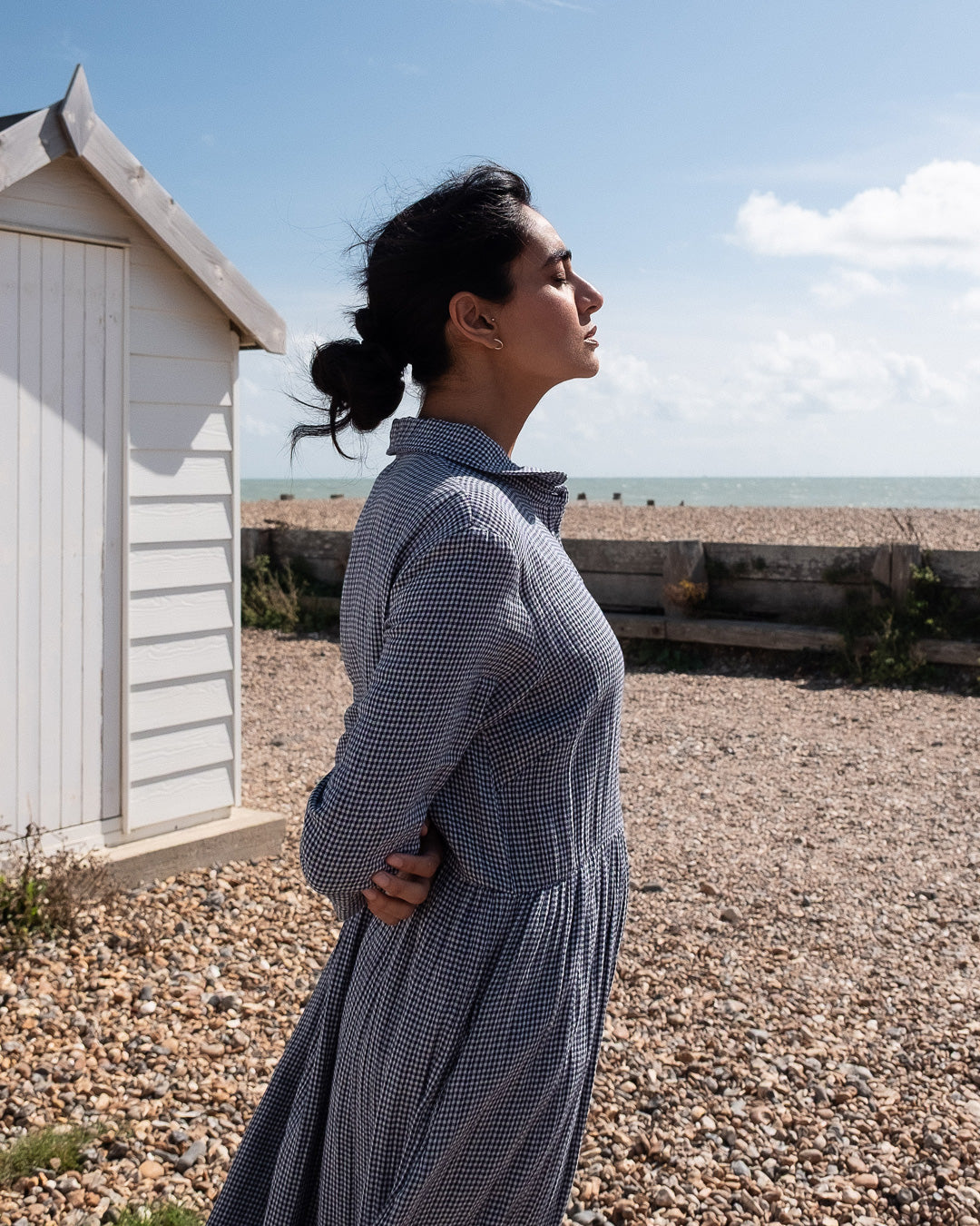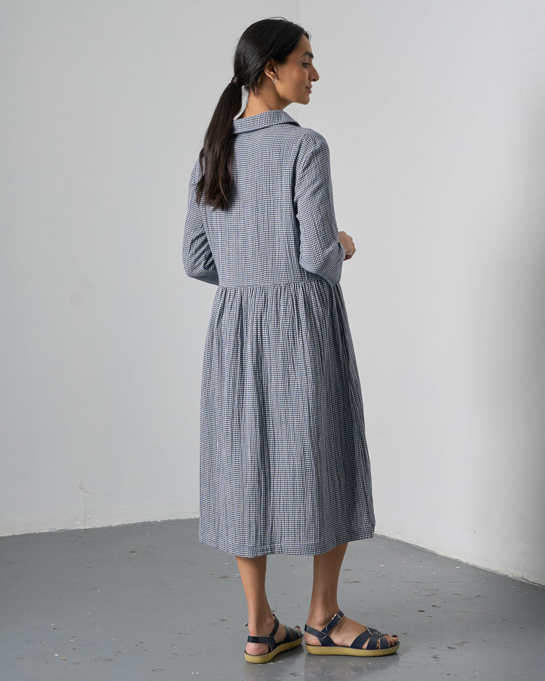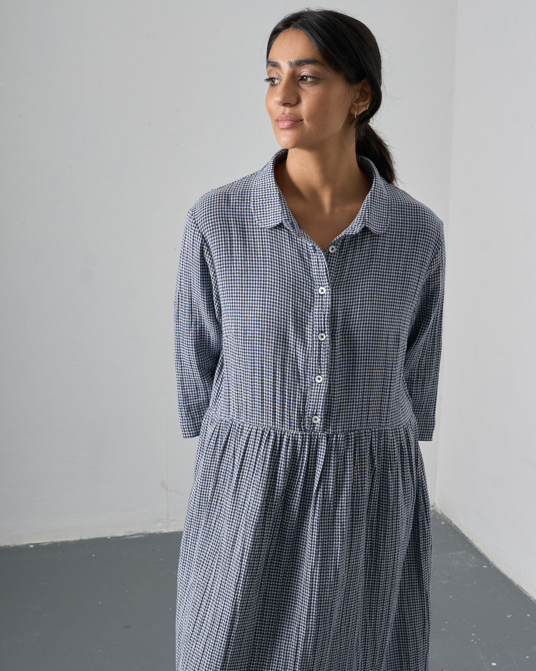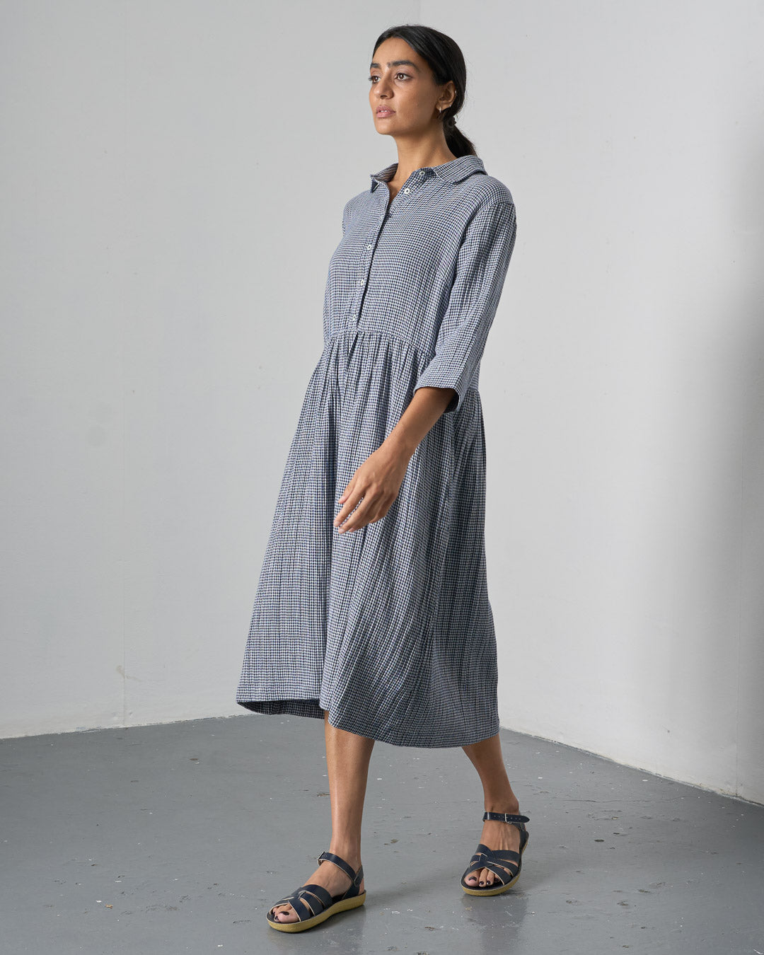 Cotton double gauze dress with a navy and ecru little check. Softly textured, with a gentle feel against the skin. Relaxed shape, gently gathered skirt and rounded collar. Button-through placket, three-quarter sleeves, practical side pockets. Easy to wear through the seasons.