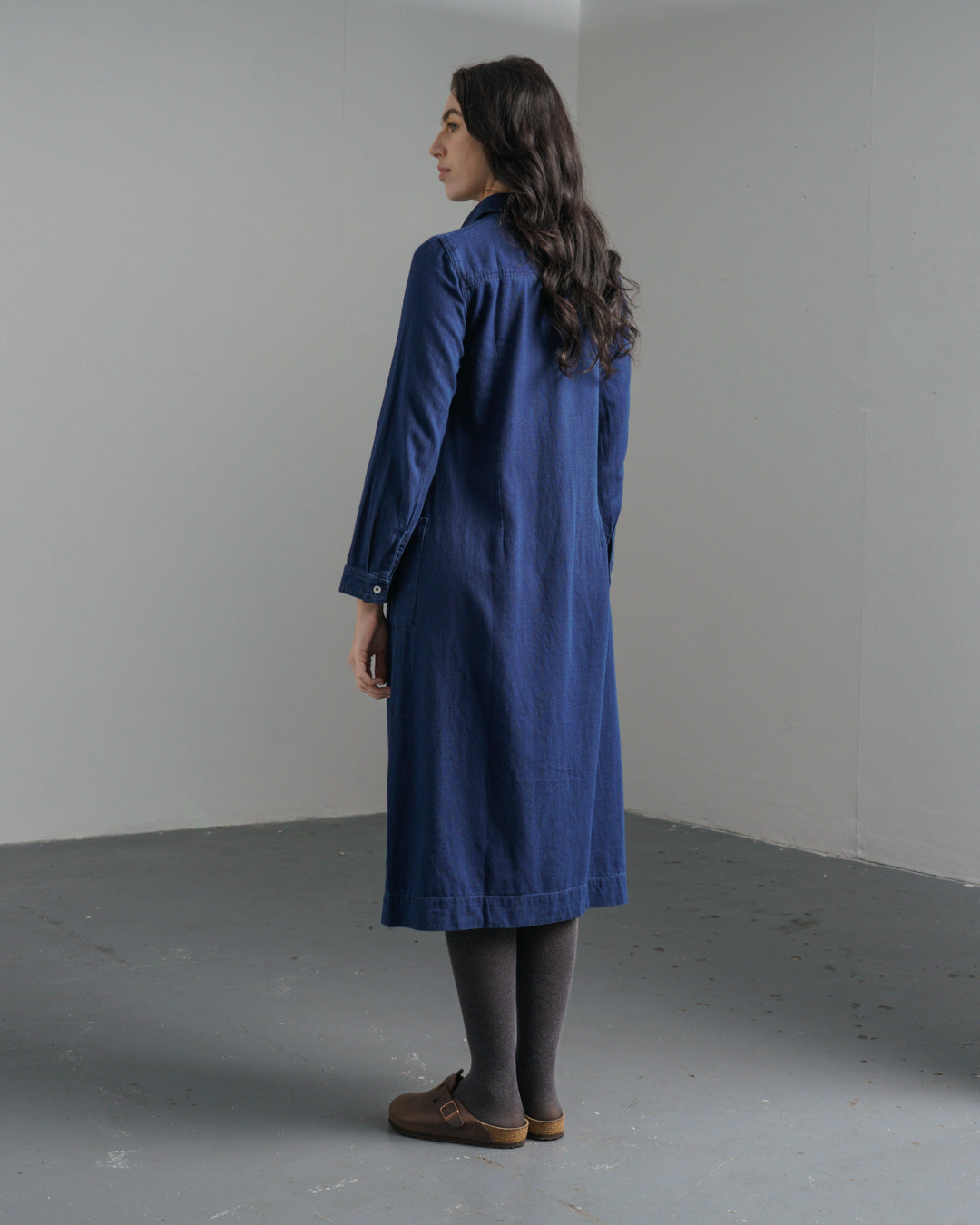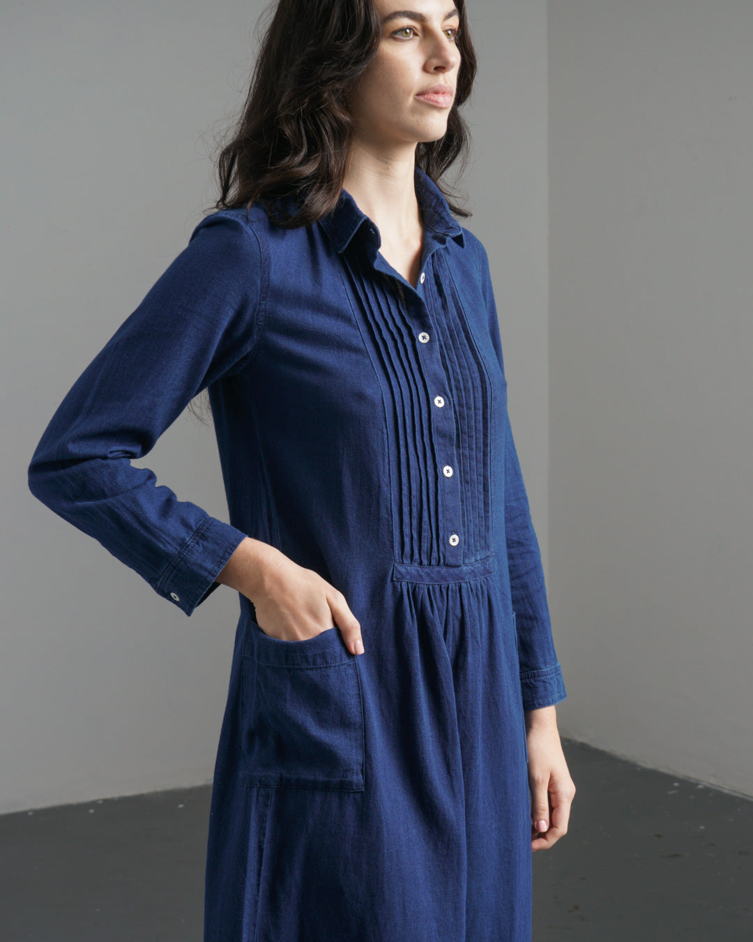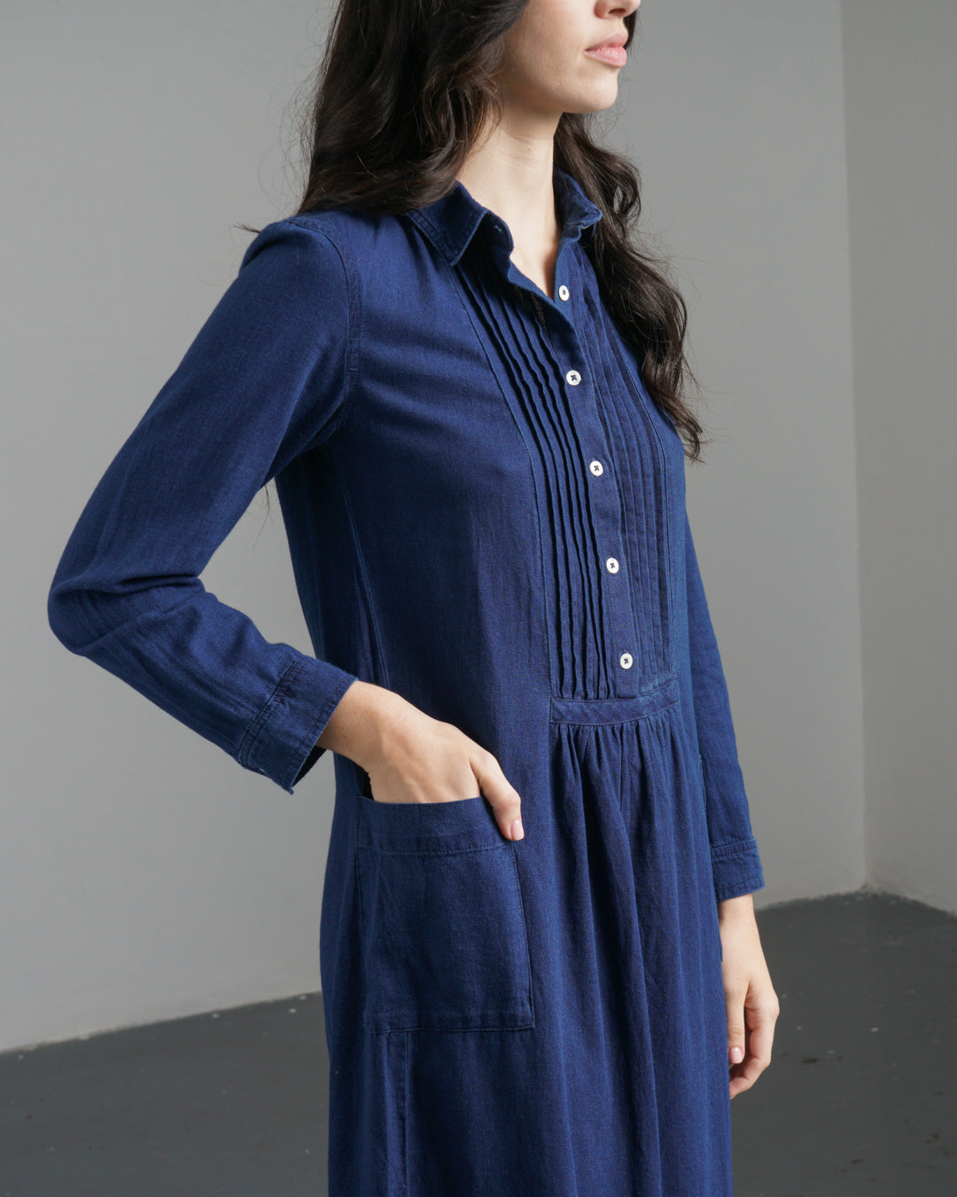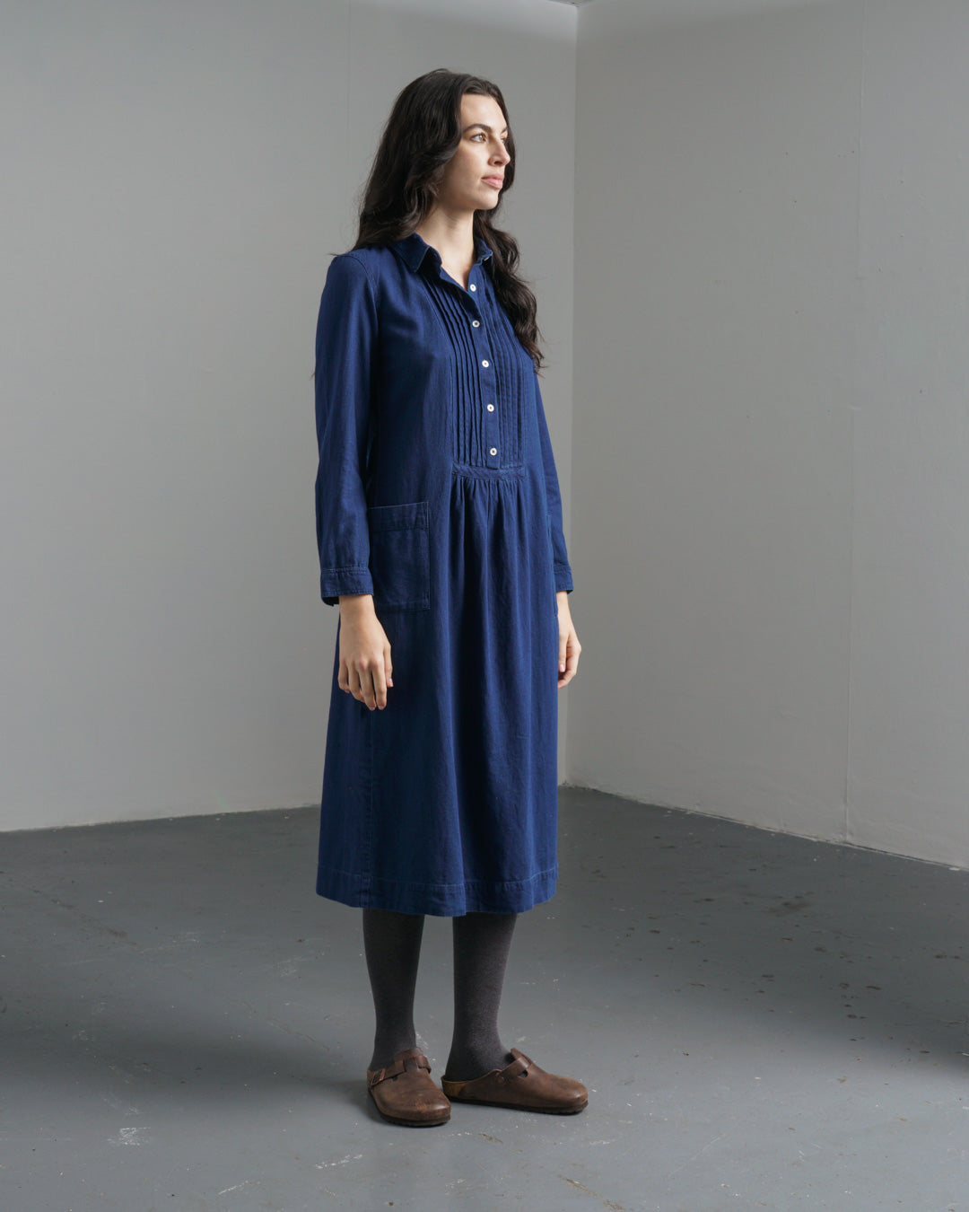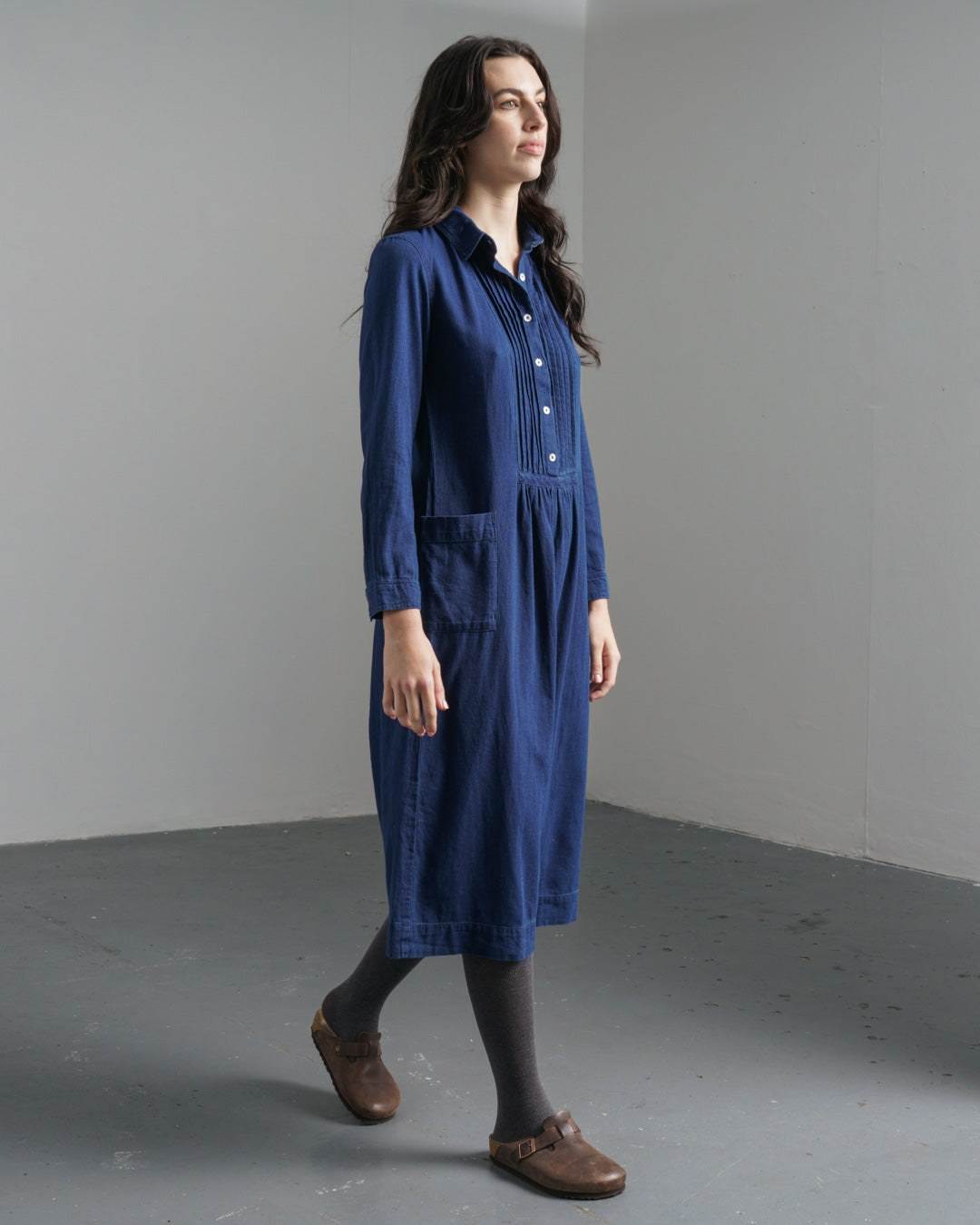 A timeless day dress crafted in our beautifully soft, midweight indigo denim. Designed for everyday ease, this long-sleeved style features a gently pleated bib front with a neat shirt collar and a half placket finished with imitation shell buttons. Carefully washed for a soft handfeel and to highlight the subtle texture of the fabric. Thoughtful details include two handy patch pockets and full-length sleeves with buttoned cuffs. Falls to a flattering mid-calf length. A classic piece to wear on repeat.