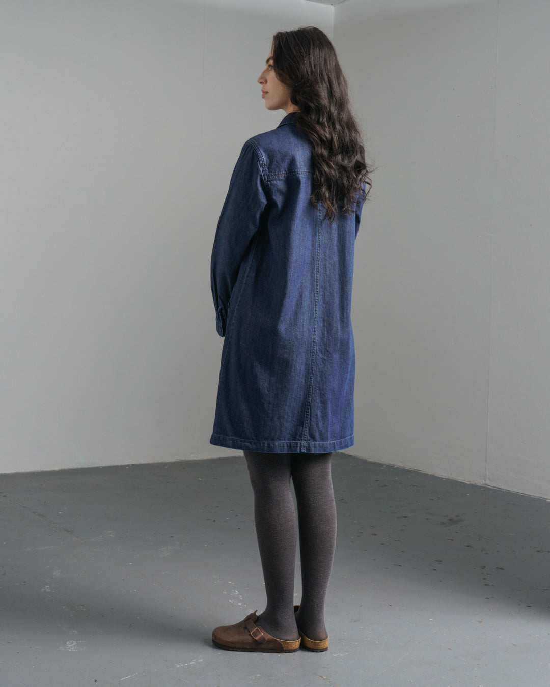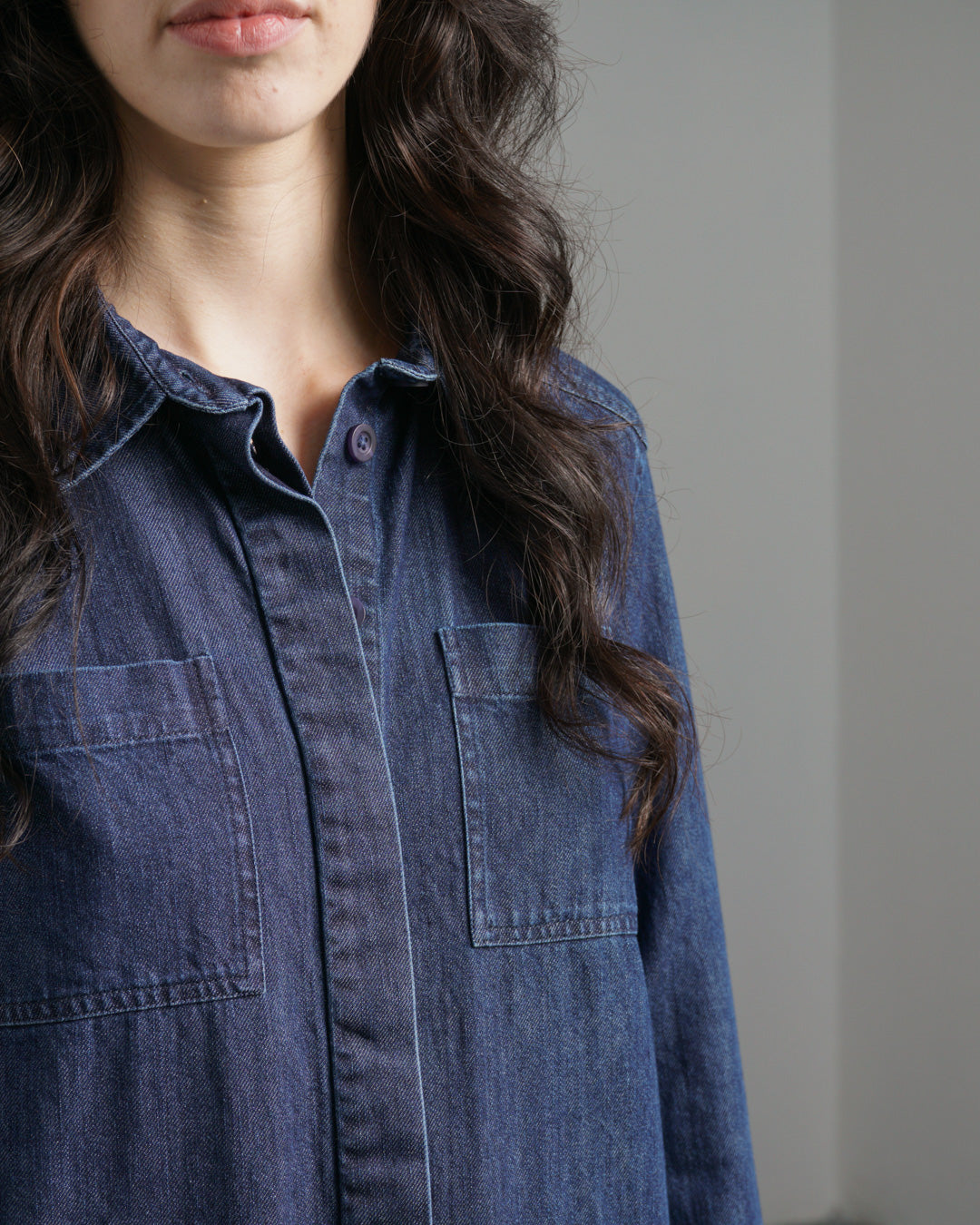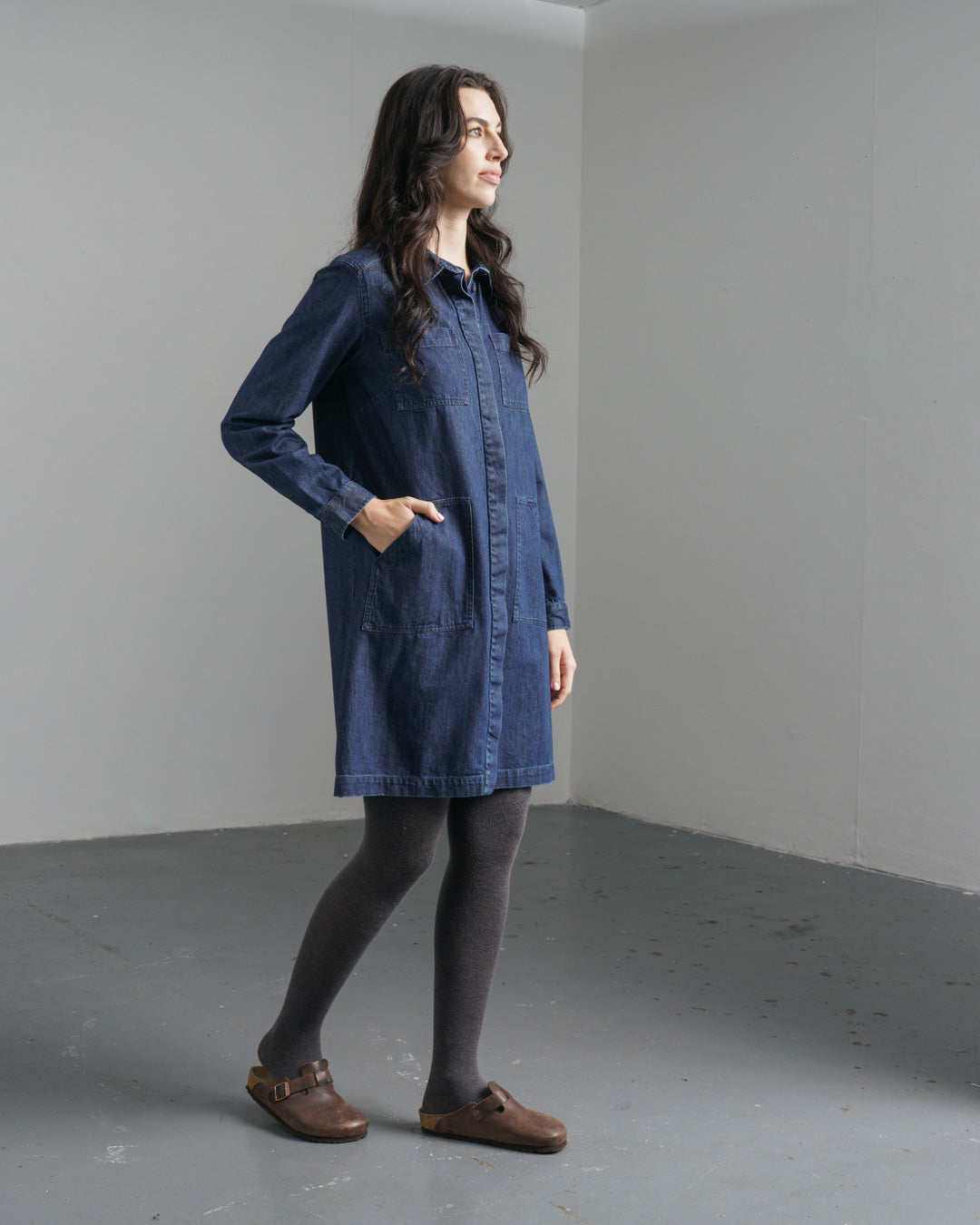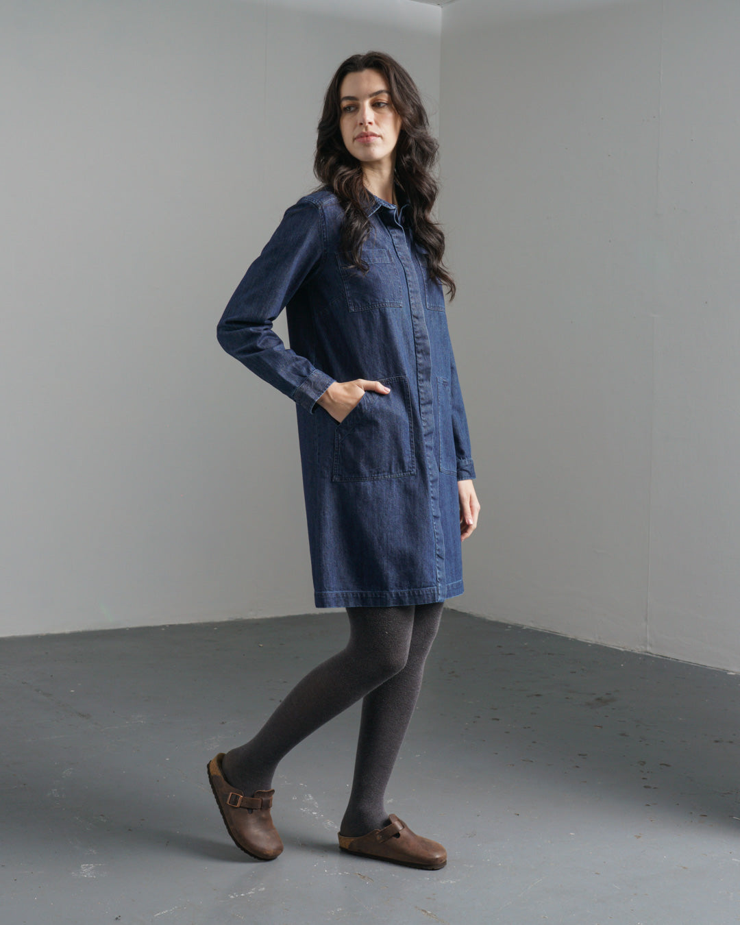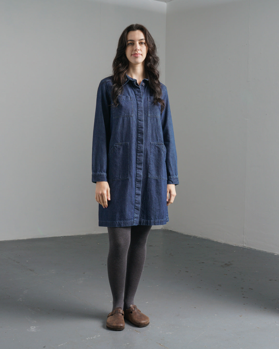 Effortless and versatile. This shorter shirt dress is cut from midweight blue cotton denim with just the right amount of structure. Its loose, boxy silhouette gives it a workwear feel—wear it as a dress, layer it as a tunic, or throw it on open over your favourite fine knit or jersey cotton top as a jacket or overshirt. Deep carpenter-style patch pockets and small chest pockets add a utilitarian touch, complemented by a concealed button placket. Full-length sleeves with buttoned cuffs. Falls just above the knee. A versatile wardrobe staple designed for everyday wear throughout the year.