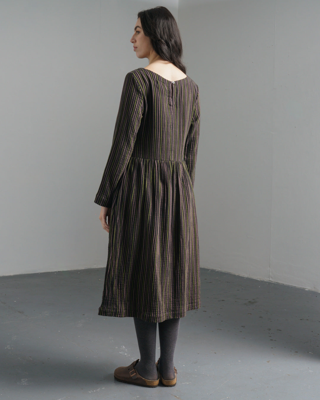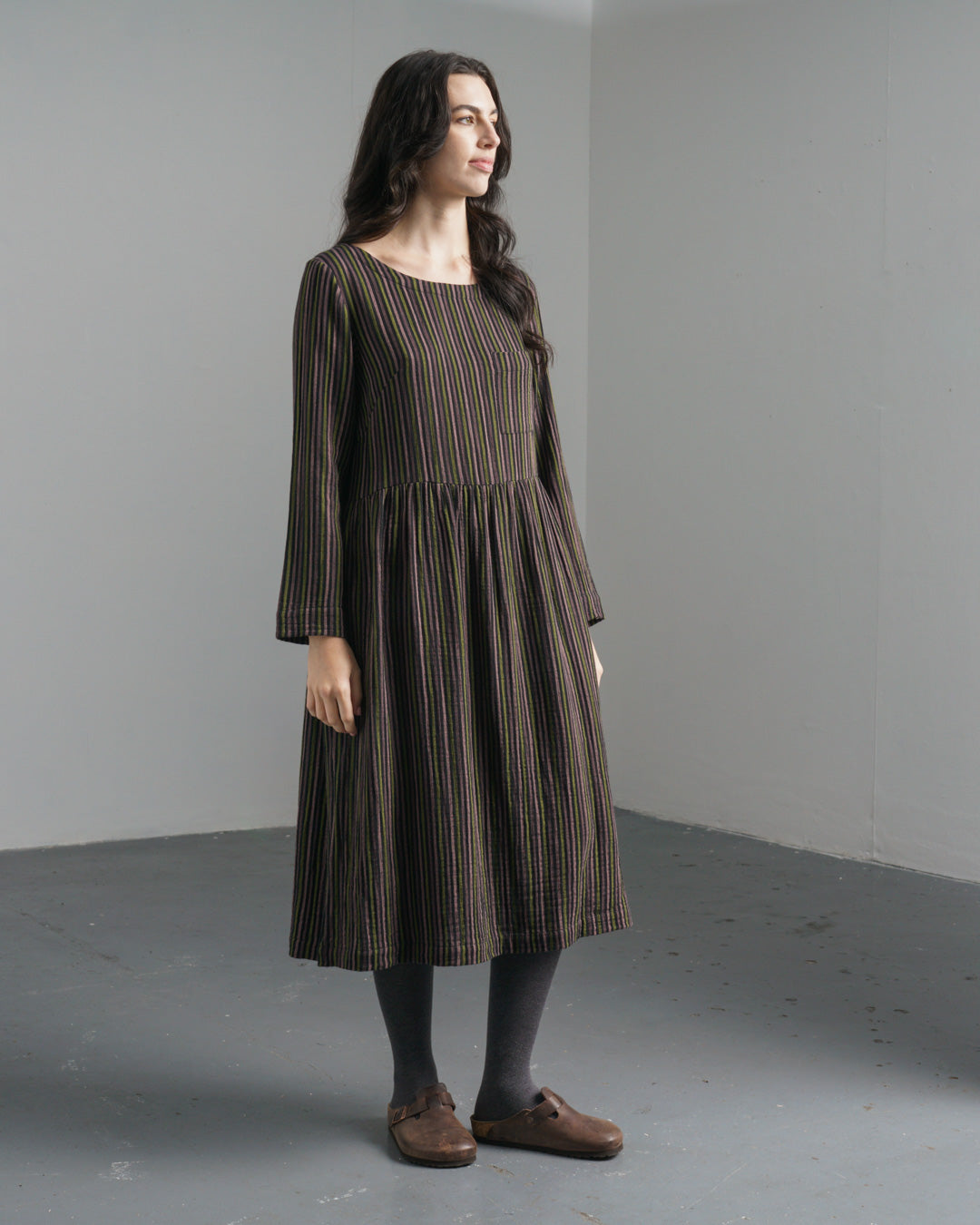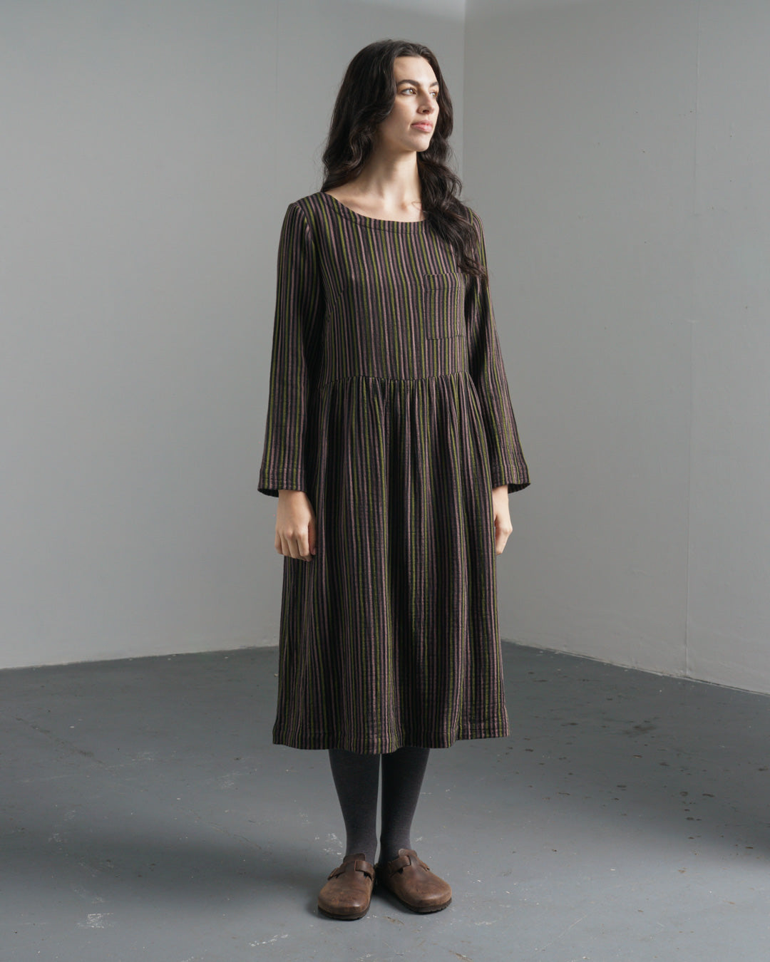 The Orla Dress is made from soft, cosy double-gauze cotton in black, woven with stripes in pistachio, pale pink and prune. The silhouette is simple and easy to wear - timeless, comfortable, and designed for trans-seasonal wear. Layer it with a chunky knit and tights when the temperature drops, or wear it solo on milder days. The dress gathers below the waist and has full-length sleeves. Finished with a round boat neckline, a buttoned keyhole at the back, a small patched pocket on the chest and two practical in-seam side pockets.