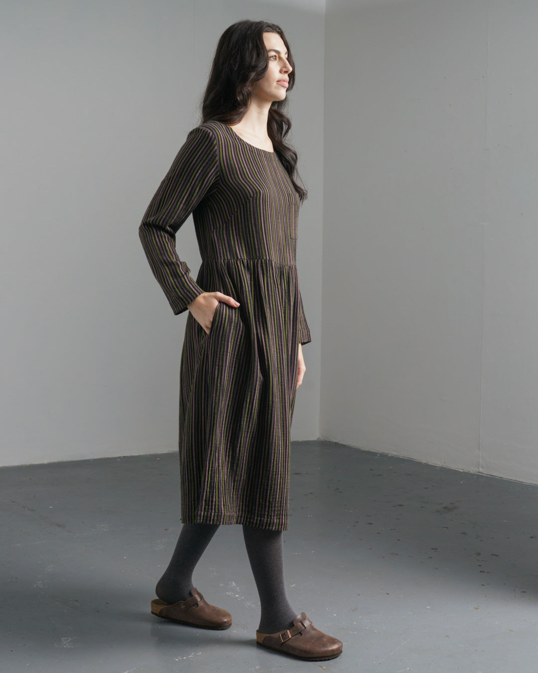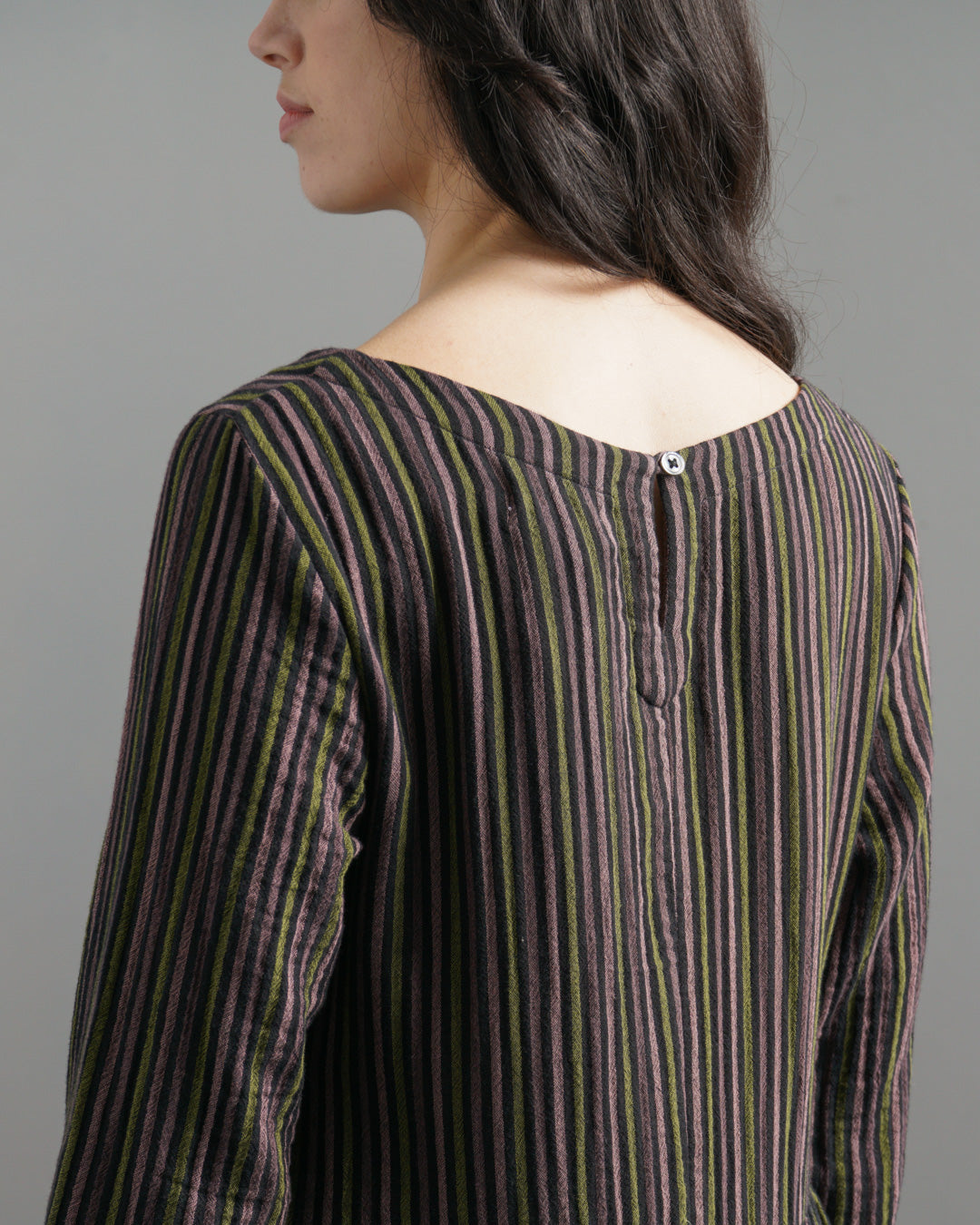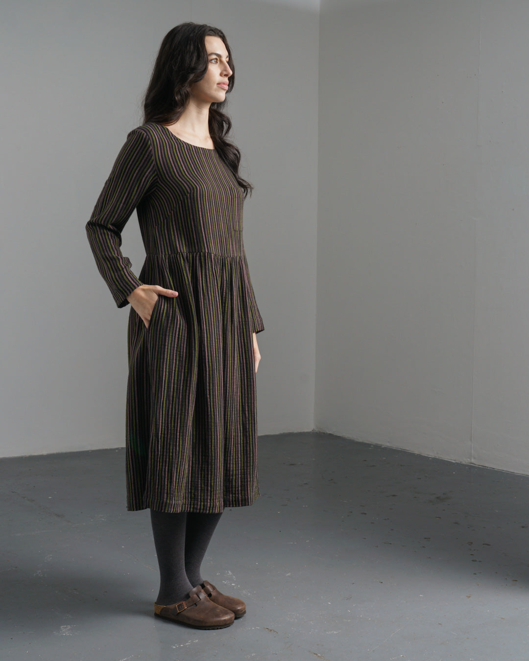The Orla Dress is made from soft, cosy double-gauze cotton in black, woven with stripes in pistachio, pale pink and prune. The silhouette is simple and easy to wear - timeless, comfortable, and designed for trans-seasonal wear. Layer it with a chunky knit and tights when the temperature drops, or wear it solo on milder days. The dress gathers below the waist and has full-length sleeves. Finished with a round boat neckline, a buttoned keyhole at the back, a small patched pocket on the chest and two practical in-seam side pockets.