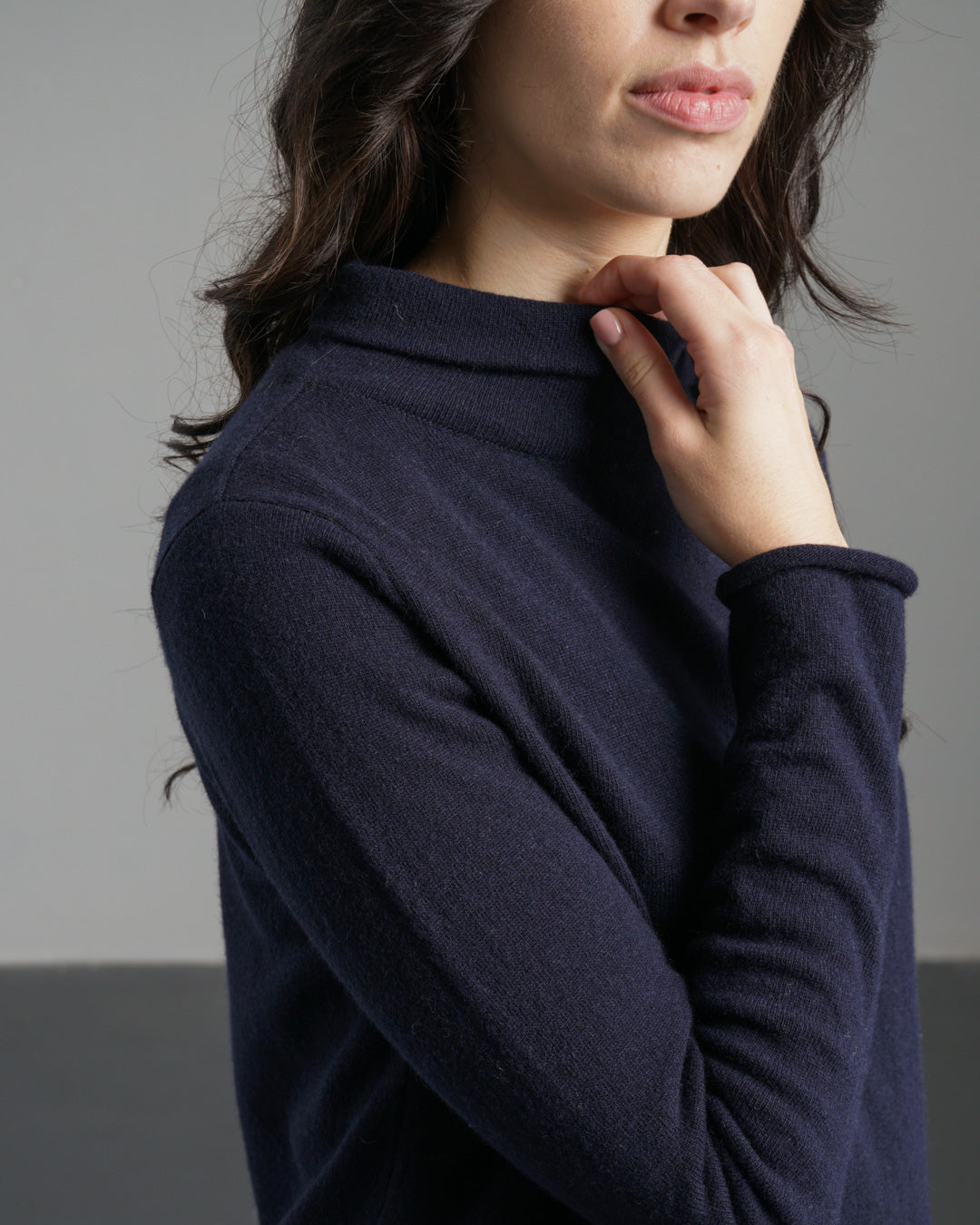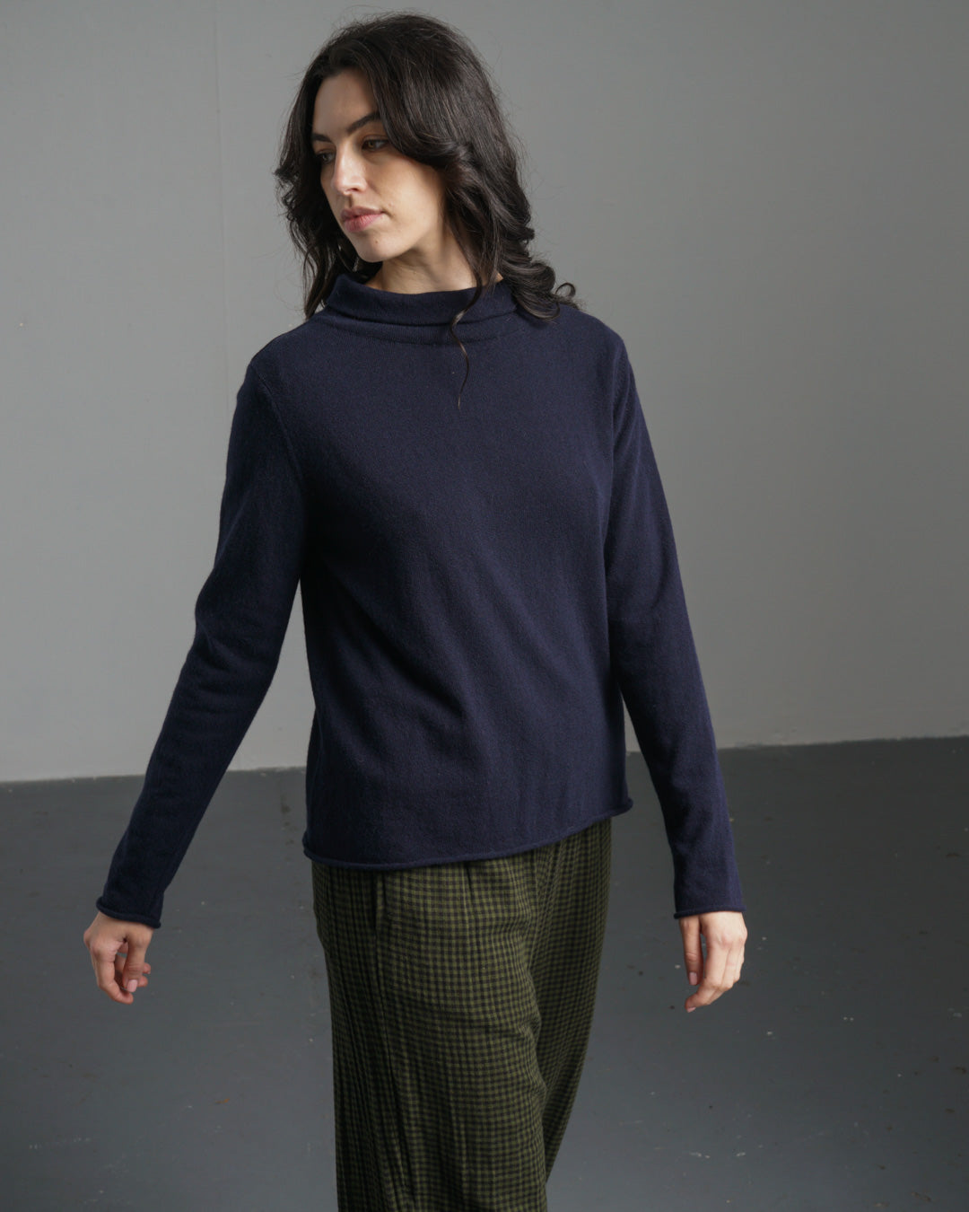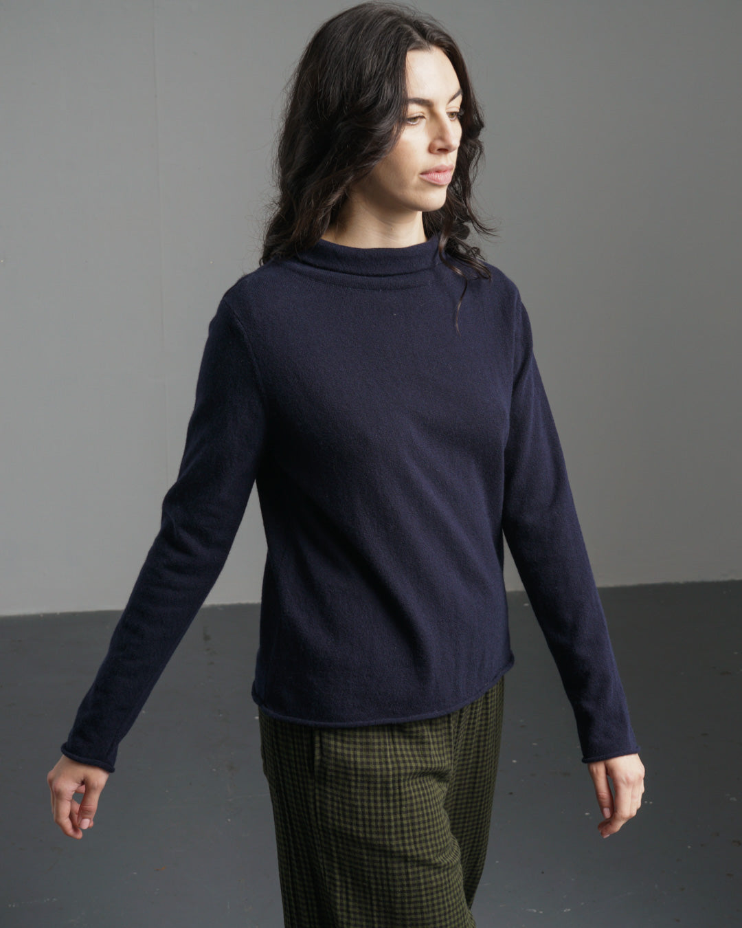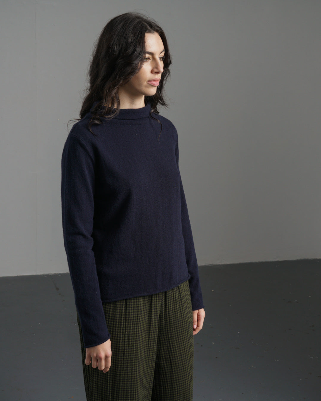 A soft, fine knit roll-neck jumper made from pure Merino wool. One of the lighter-weight pieces in the collection, it still offers plenty of warmth. Designed with a timeless boat neck and a short, roll-up collar, it sits neatly on the shoulders with a subtle A-line shape for a flattering, easy fit. Finished with rolled cuffs and hem for a simple, relaxed look. Soft enough to wear next to the skin or layered as the seasons shift. One of our most loved styles, available in a selection of rich, timeless shades—this one is a rich navy.