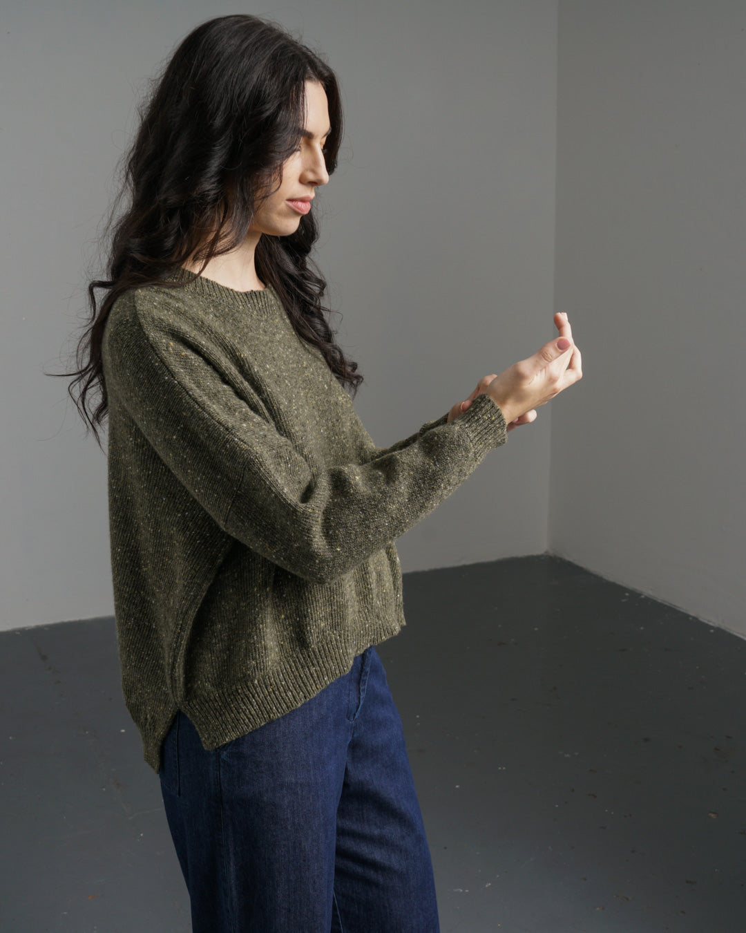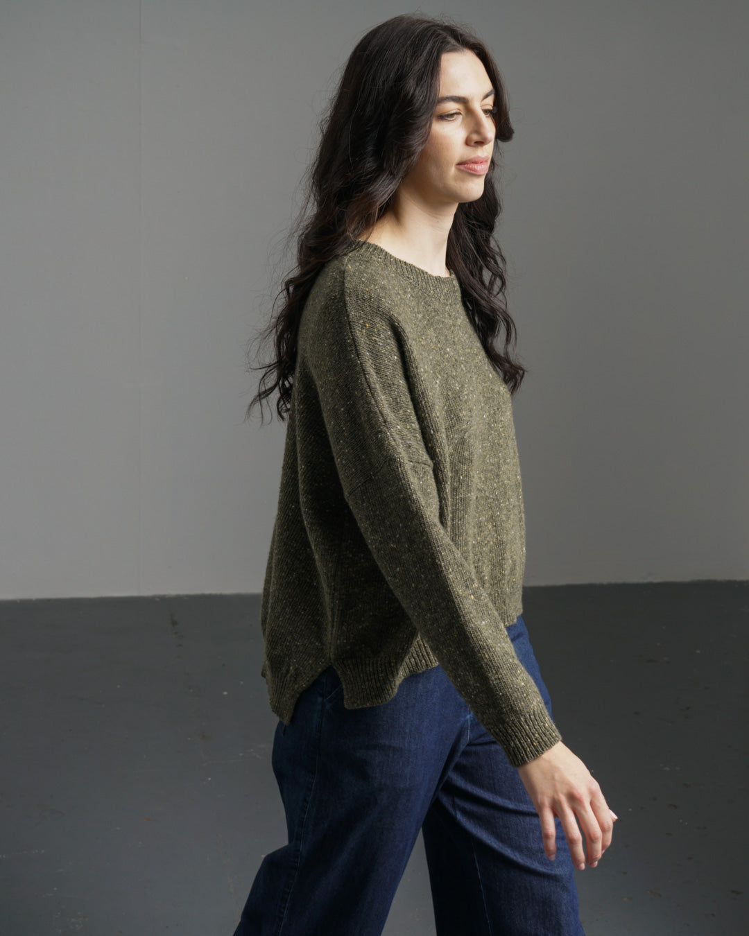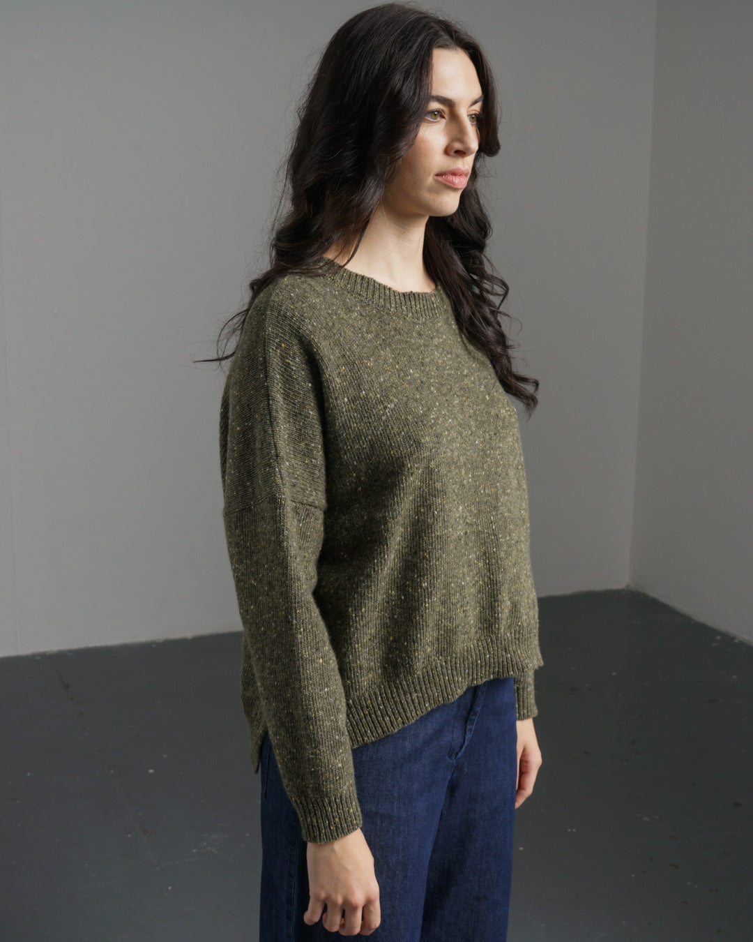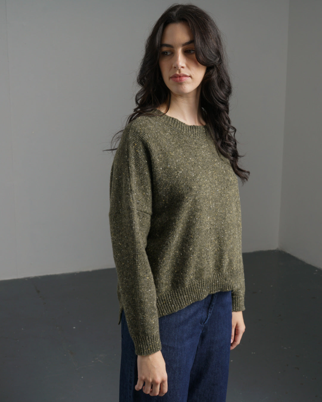 The simple style of the jumper, with its classic round neck, drop shoulders, and relaxed fit,shows off this beautiful yarn. It features rib knit detailing and side splits at the hem. Made in a selection of colours. This one is a rich moss green with flecks of white, cream and dark green.