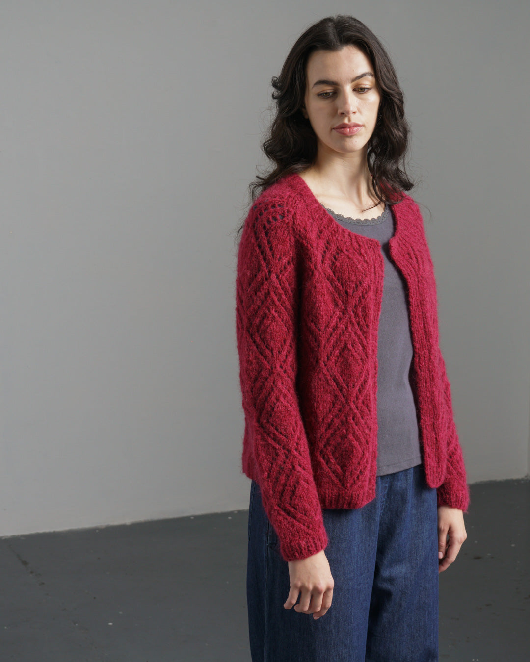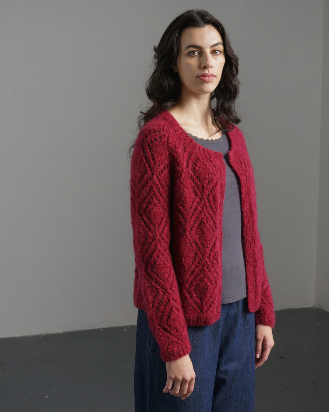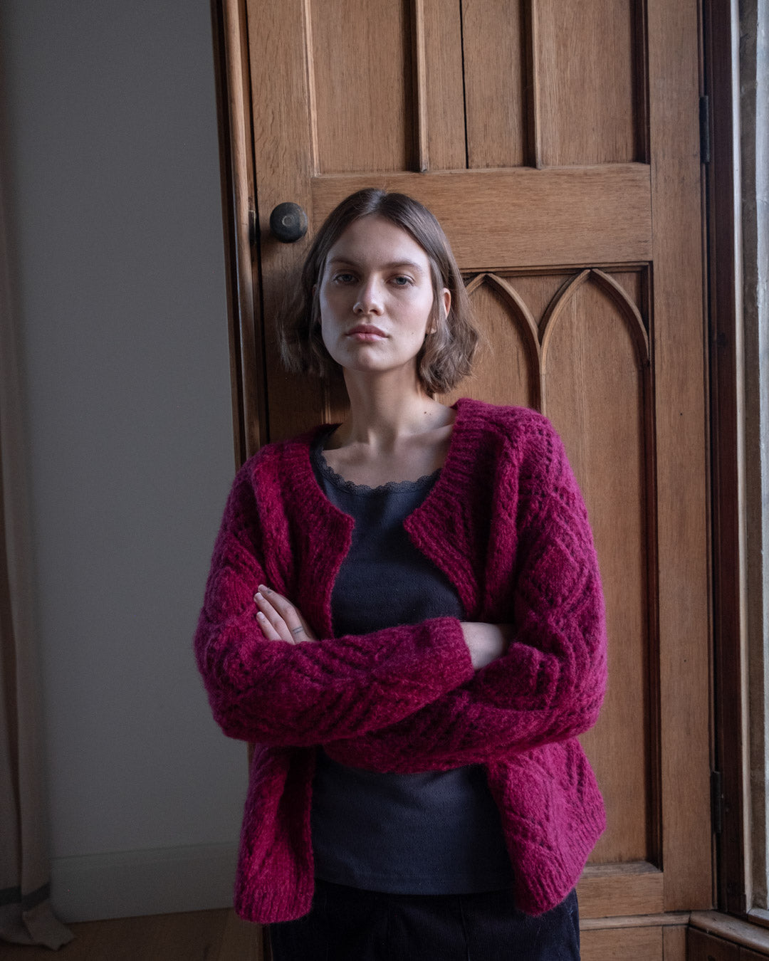 A beautifully hand-knitted open cardigan made from our soft mohair wool. This special piece features intricate lace stitching front and back, adding delicate texture to a cosy, winter-ready layer. The yarn is hand-spun, hand-dyed, and made from non-mulesed wool—a resilient fibre that softens and shapes gently with time. Designed with a boxy fit, raglan sleeves, and ribbed trims for a relaxed silhouette. Available in rich mulberry and a soft, smoky blue — both timeless hues to lift your cold-weather wardrobe.