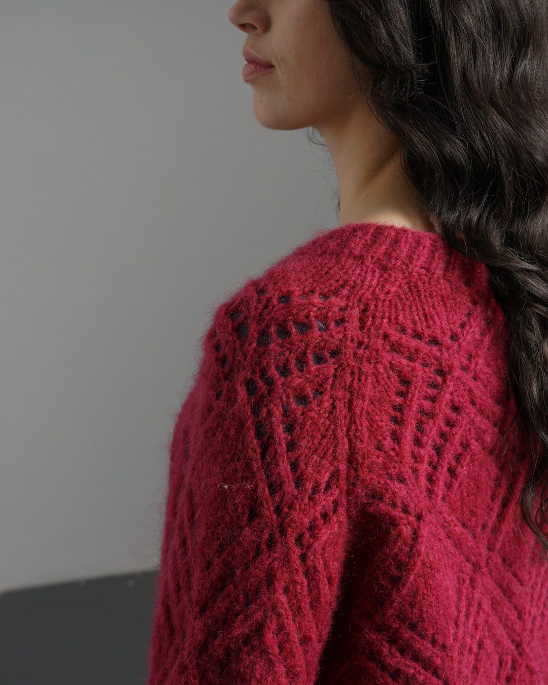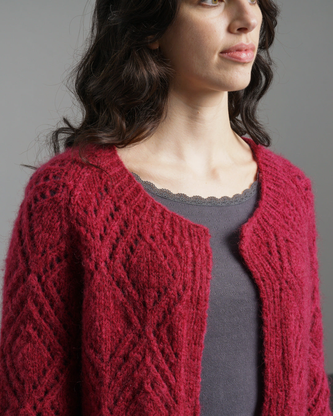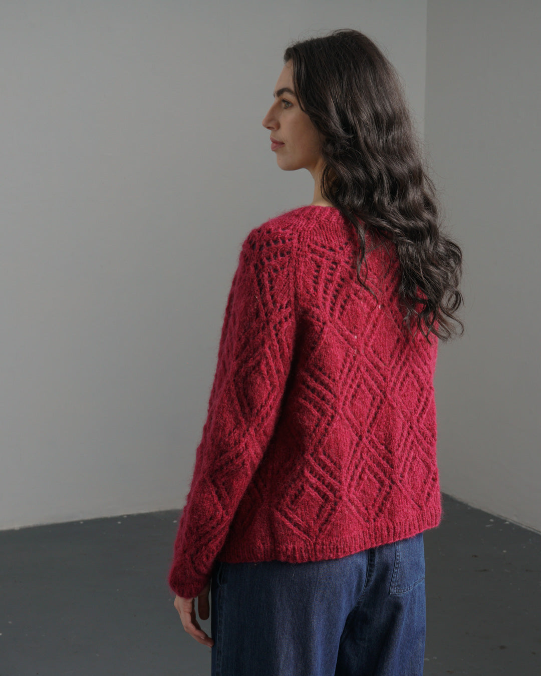 A beautifully hand-knitted open cardigan made from our soft mohair wool. This special piece features intricate lace stitching front and back, adding delicate texture to a cosy, winter-ready layer. The yarn is hand-spun, hand-dyed, and made from non-mulesed wool—a resilient fibre that softens and shapes gently with time. Designed with a boxy fit, raglan sleeves, and ribbed trims for a relaxed silhouette. Available in rich mulberry and a soft, smoky blue — both timeless hues to lift your cold-weather wardrobe.