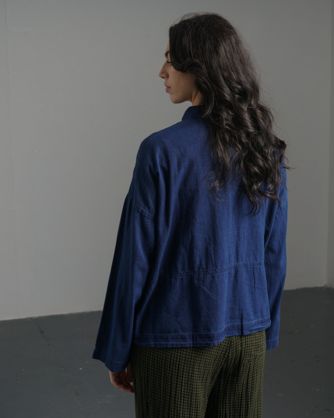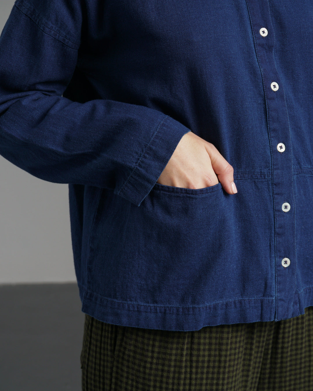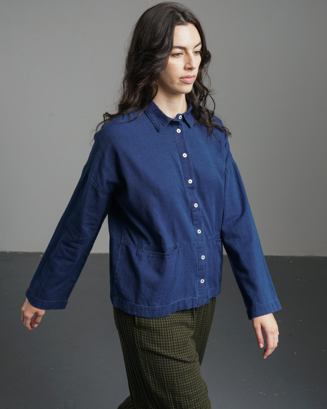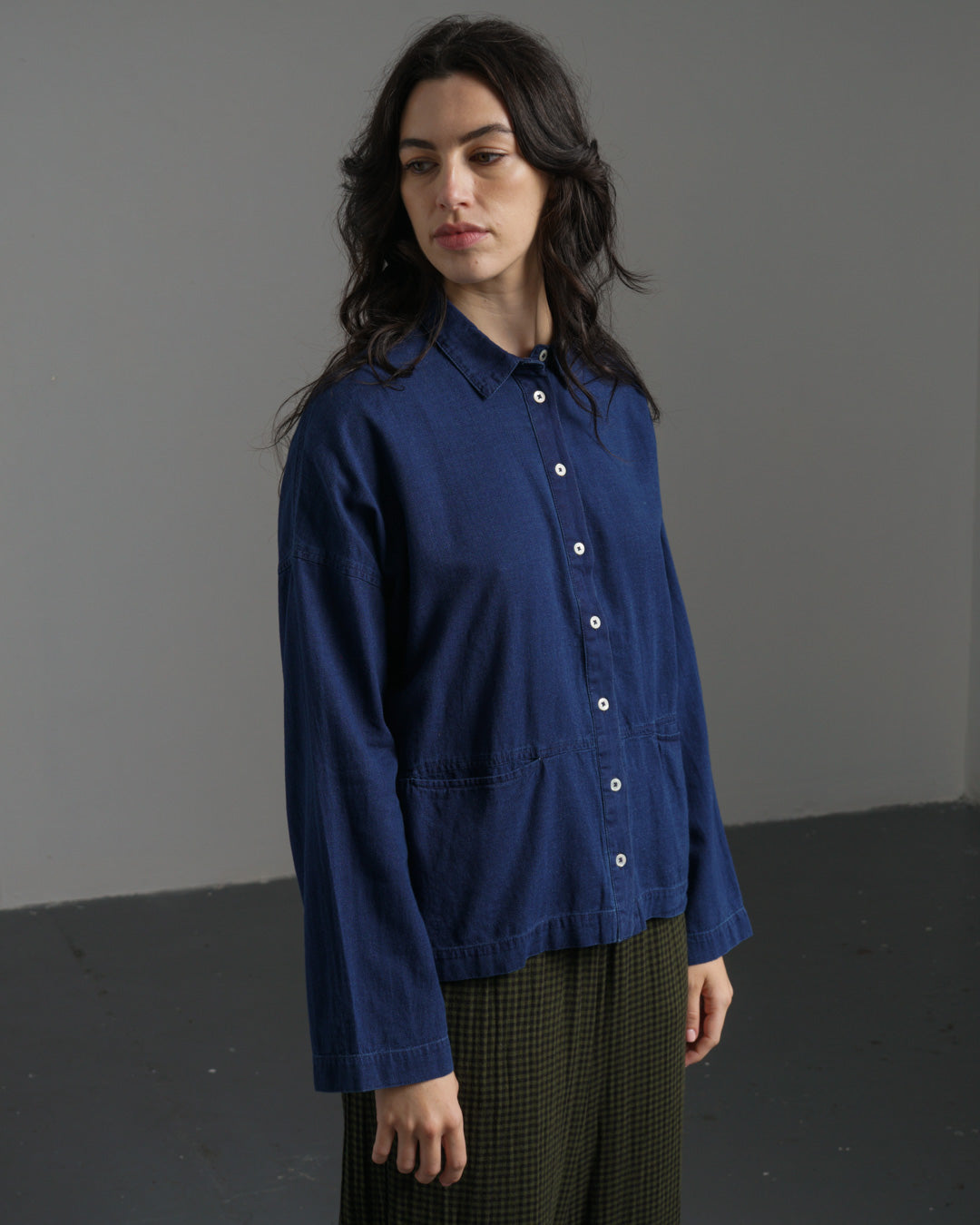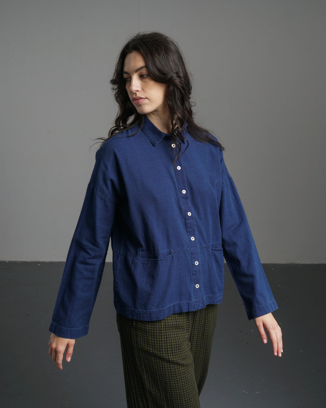 A modern update to the painter’s blouse, made in our iconic soft and supple textured blue denim. Relaxed fit, drop shoulders, and oversized sleeves give it an easy, laid-back shape. Wear it buttoned up straight on the skin, or over a cotton tee like an overshirt or jacket. Finished with practical patch pockets and imitation shell buttons — simple, functional, and endlessly versatile.