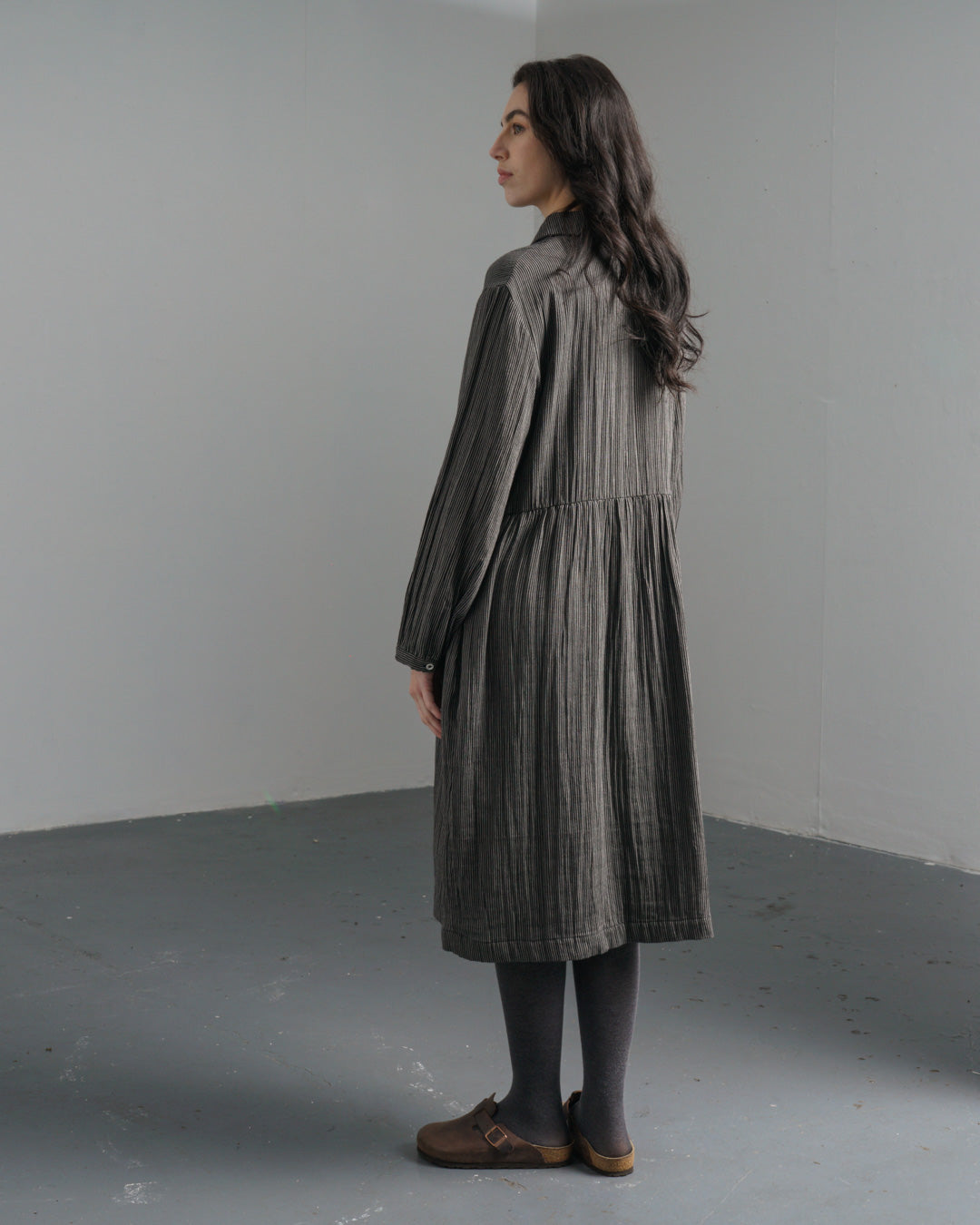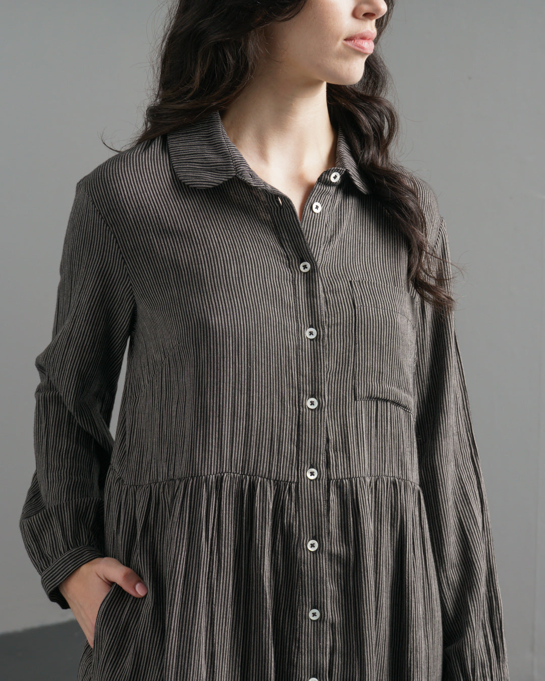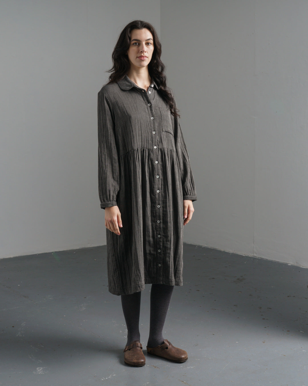 A laid-back classic in soft, cosy double gauze cotton, this dress is black with a skinny grey pinstripe. Pairing comfort with style, it is cut in a relaxed silhouette that feels effortless to wear. Lightweight yet warm, the breathable fabric makes it a go-to through changing seasons. Finished with a button-down front, simple shirt collar, and discreet in-seam pockets. Layer with a cotton tee and chunky knit when the weather cools. An easy, everyday dress with timeless appeal.