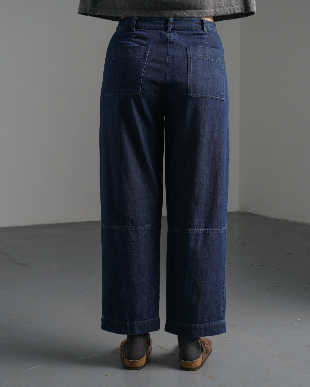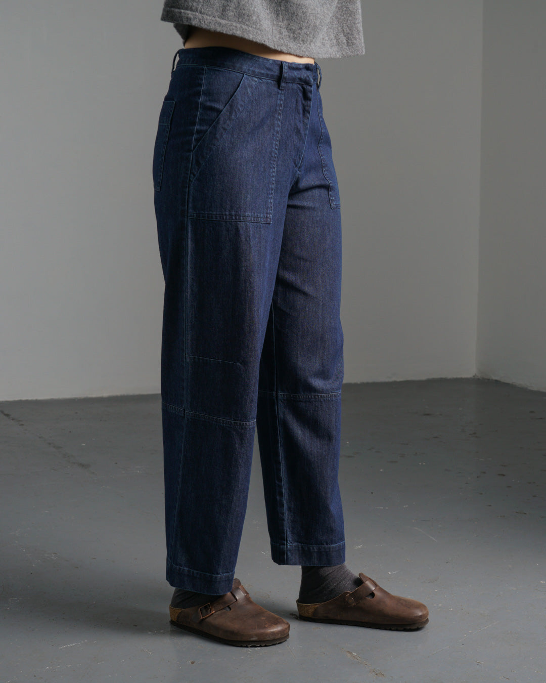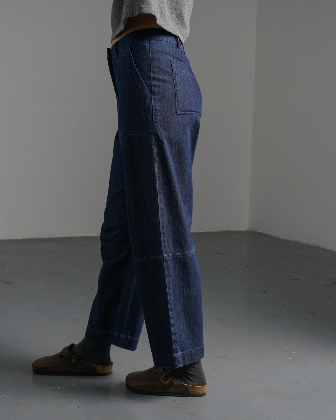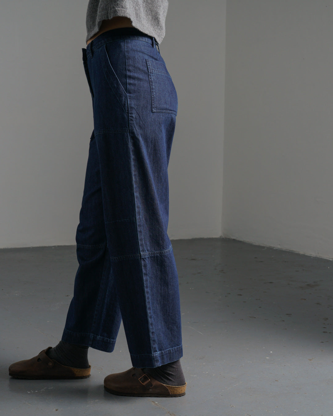 Our most tailored trousers, made from mid-weight blue denim with a clean, structured finish. Designed with a flat front, mid-rise waist, and full-length, gently tapered legs. Twin-needle stitching adds subtle detail, while the hook-and-bar fastening and zip fly keep the look neat. Finished with two deep side pockets and belt loops for styling versatility. A smart yet easy-to-wear piece that works across the seasons. For a more relaxed fit, we recommend checking the size guide and sizing up. A hardworking wardrobe staple you'll reach for again and again.