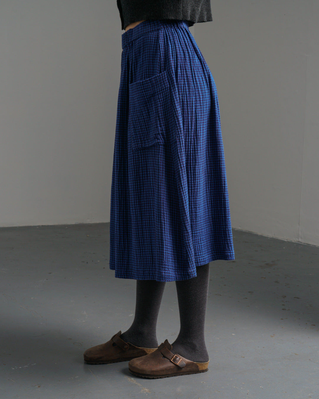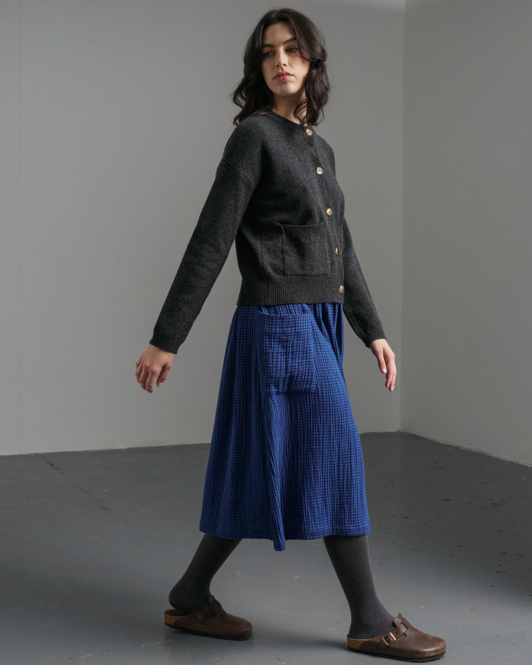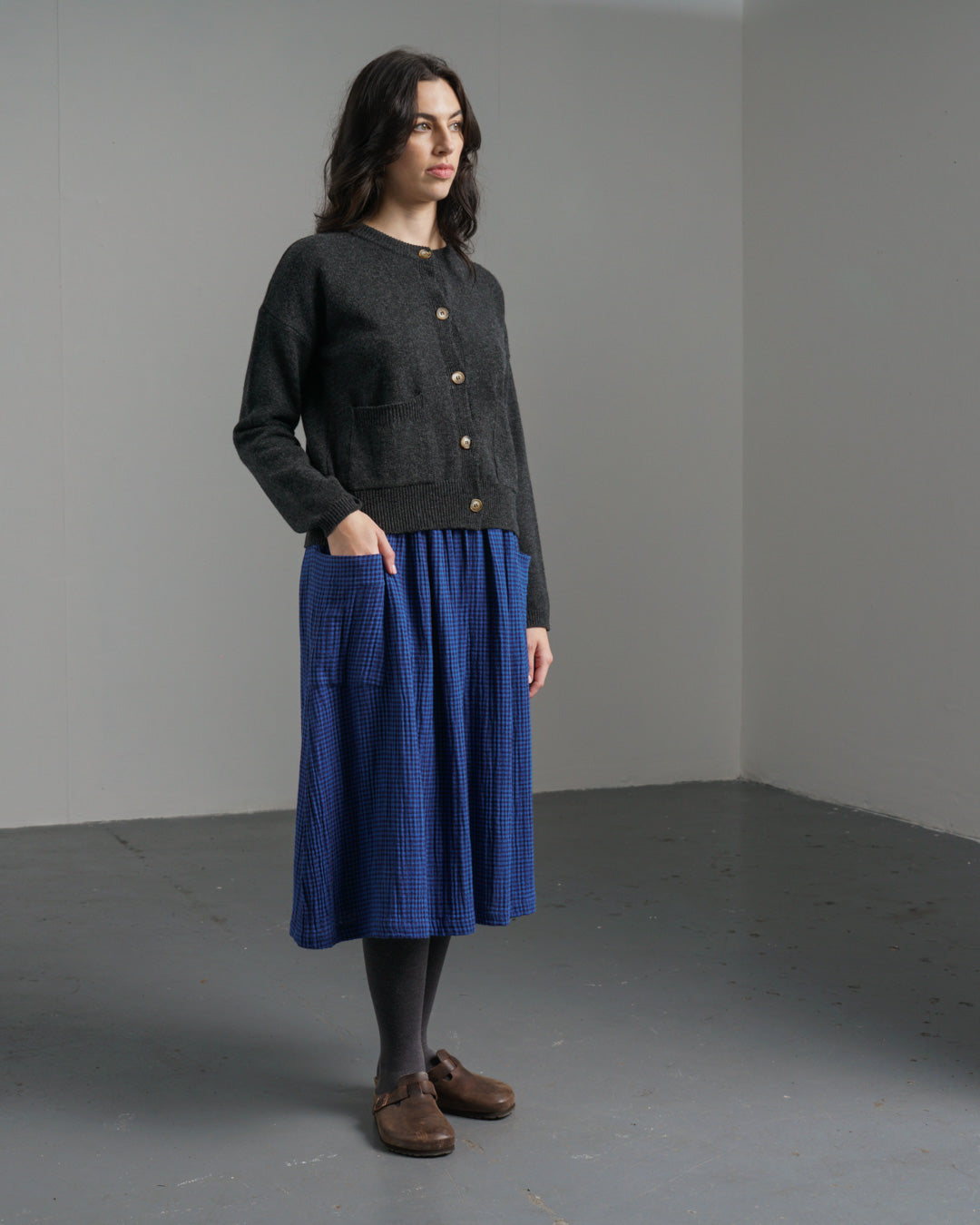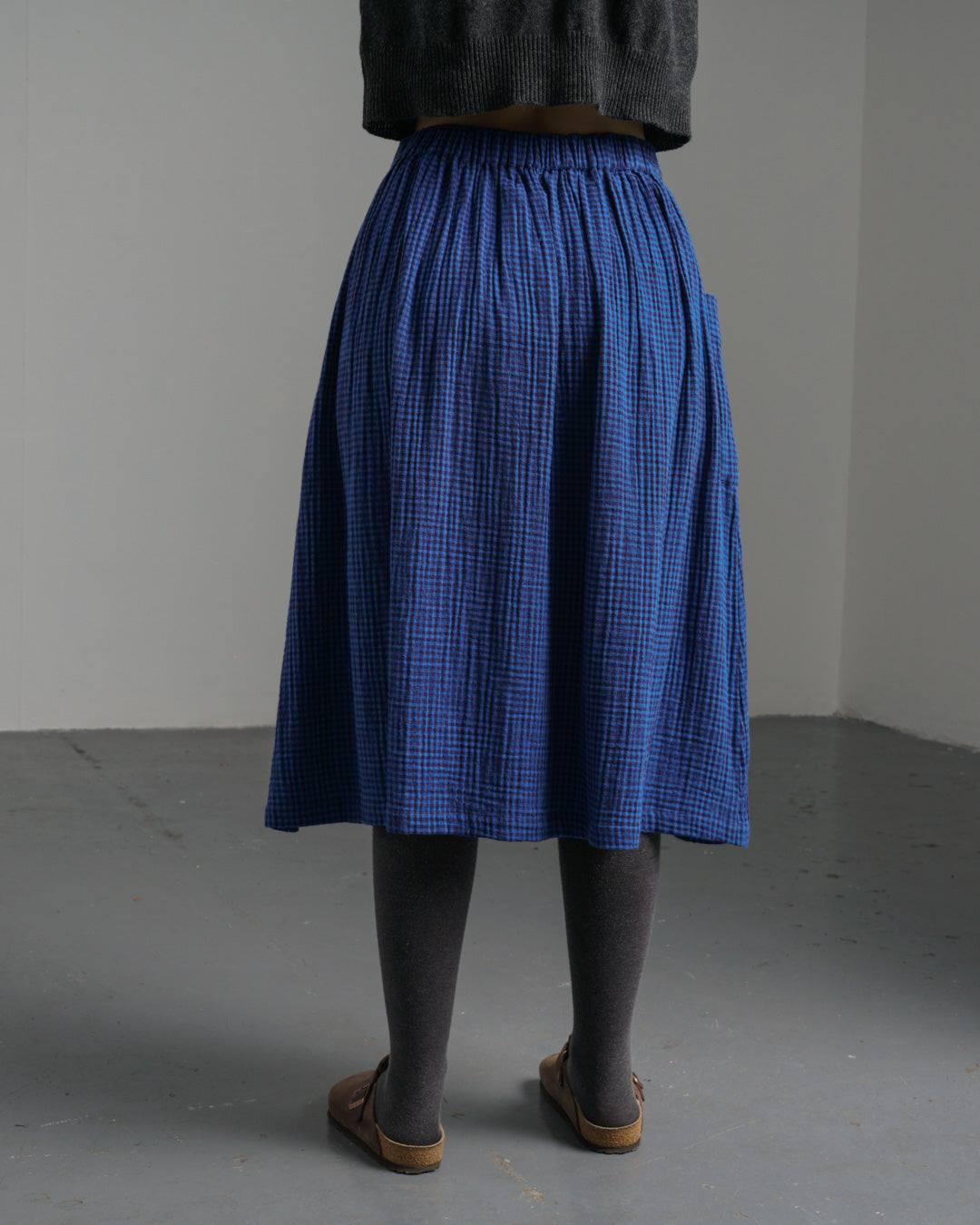 A simple pull-on cotton skirt designed to be an everyday favourite. Crafted from our soft double gauze cotton in a tiny petrol blue and black check—light, breathable, and beautifully textured. Fully elasticated waistband for comfort and an easy fit. The skirt is gently gathered for effortless movement and finished with two large, practical pockets. Falls to mid-calf, offering warmth and fluidity. A skirt to wear all year round. Style it with one of our fine knits for an easy, casual look.