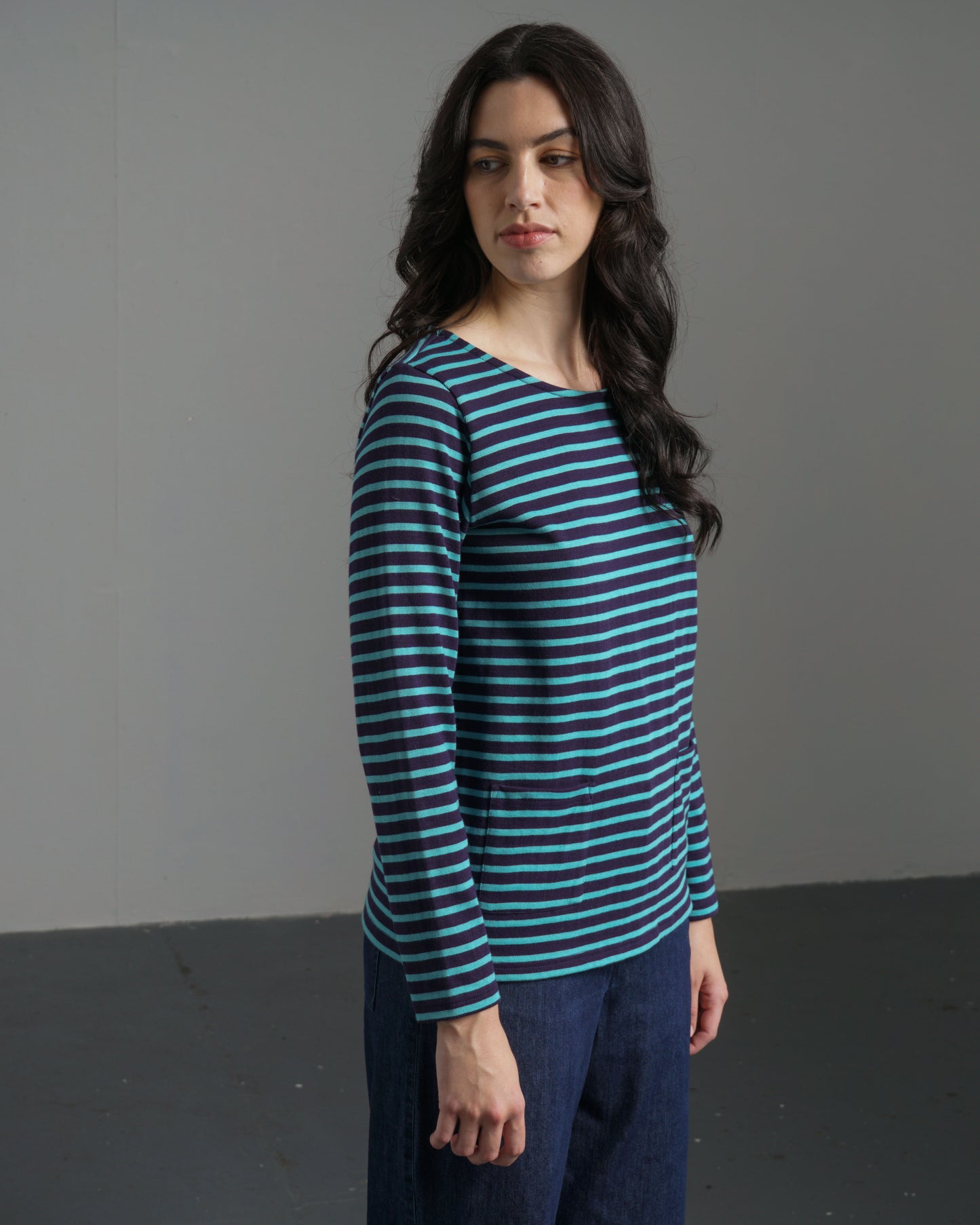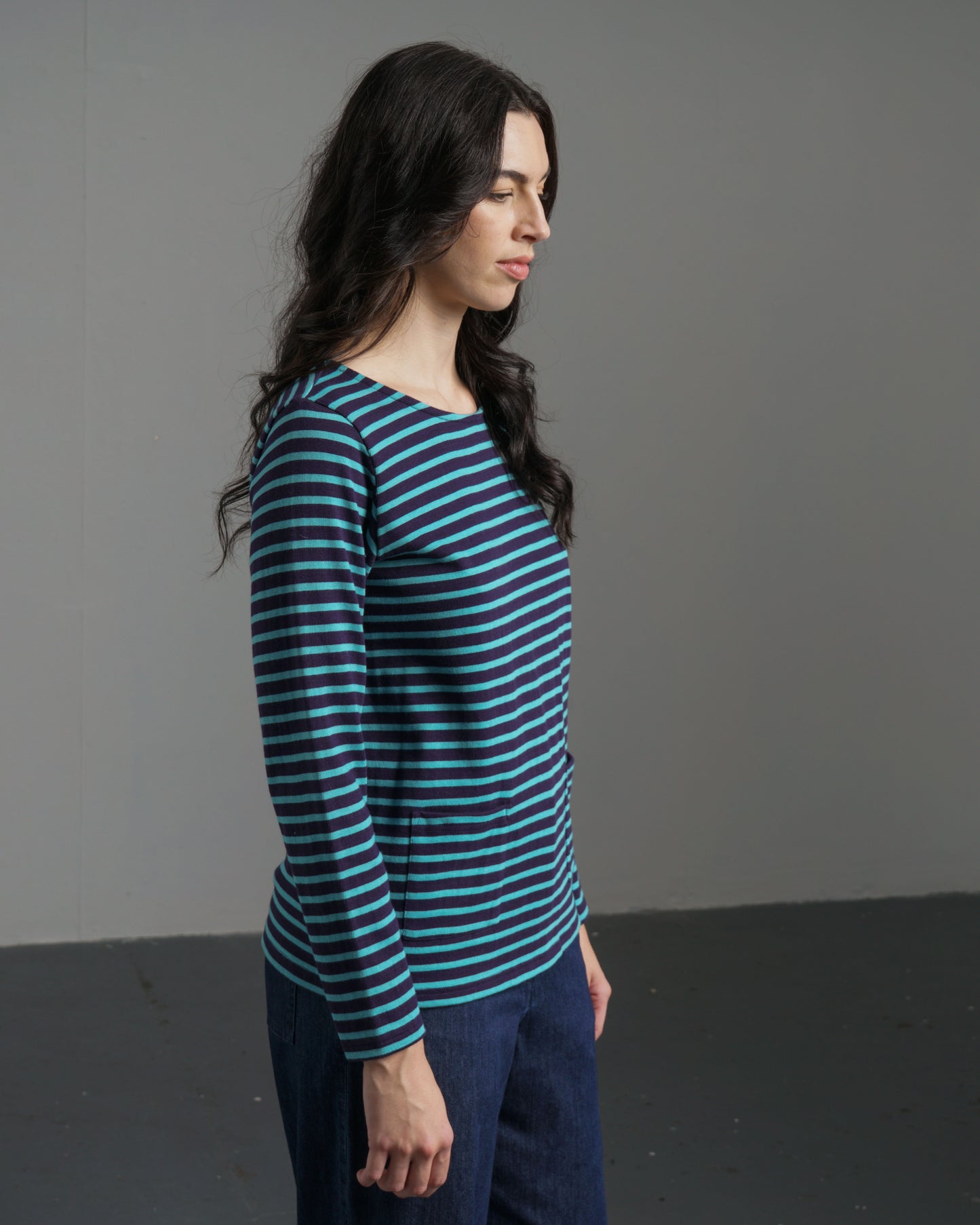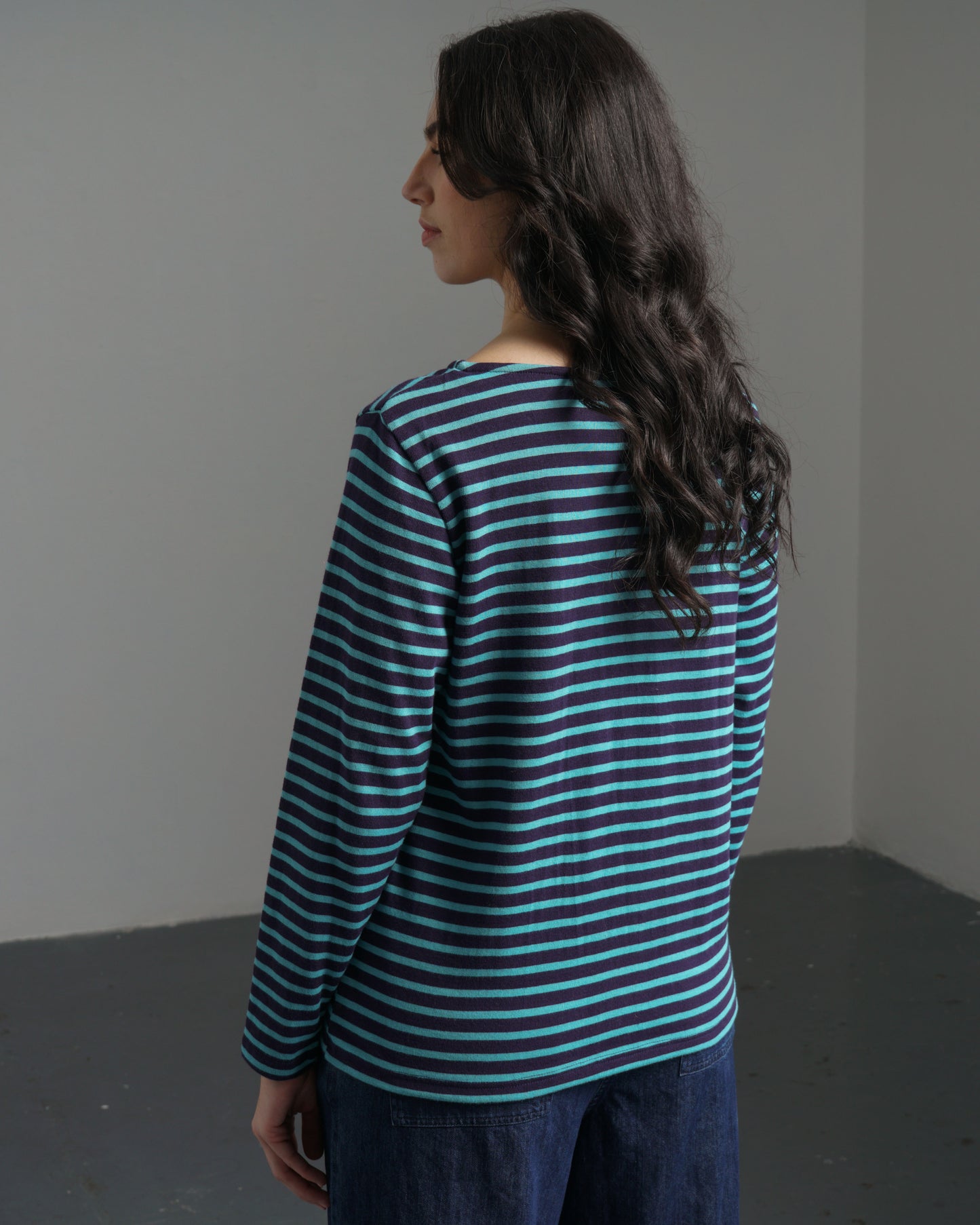 Our classic sailor T returns for Winter. Cut from rich, soft, organic cotton jersey, this timeless striped top is a true BIBICO staple. Designed with a boat neckline, twin-needle stitching, wrist-grazing sleeves and finished with two patch pockets. This season’s palette features two unique stripe combos: navy with retro blue, and navy with chartreuse — all custom-dyed and woven exclusively for us. The organic jersey cotton is mid-weight, soft and of a superior quality, making this a go-to layer with year-round appeal.