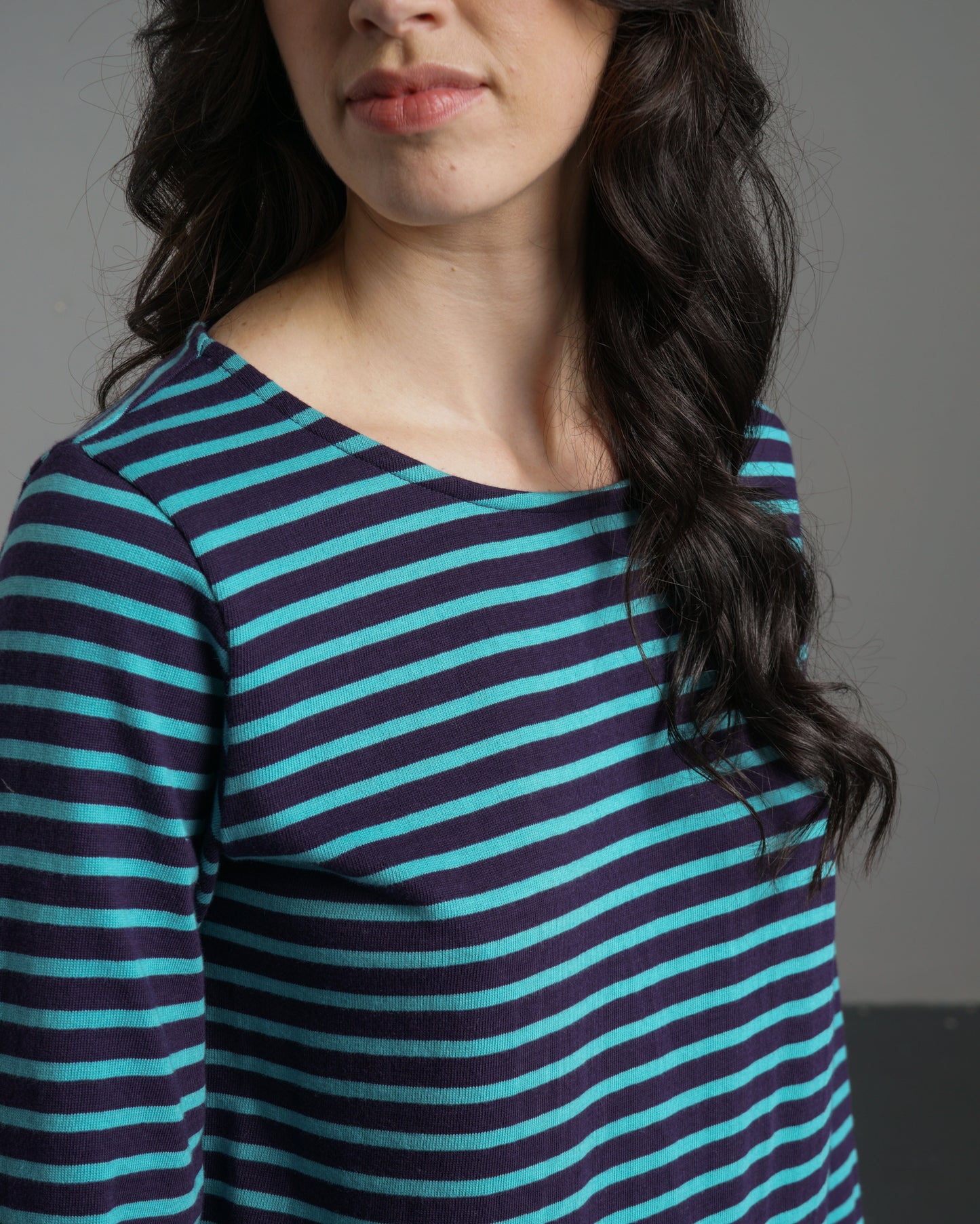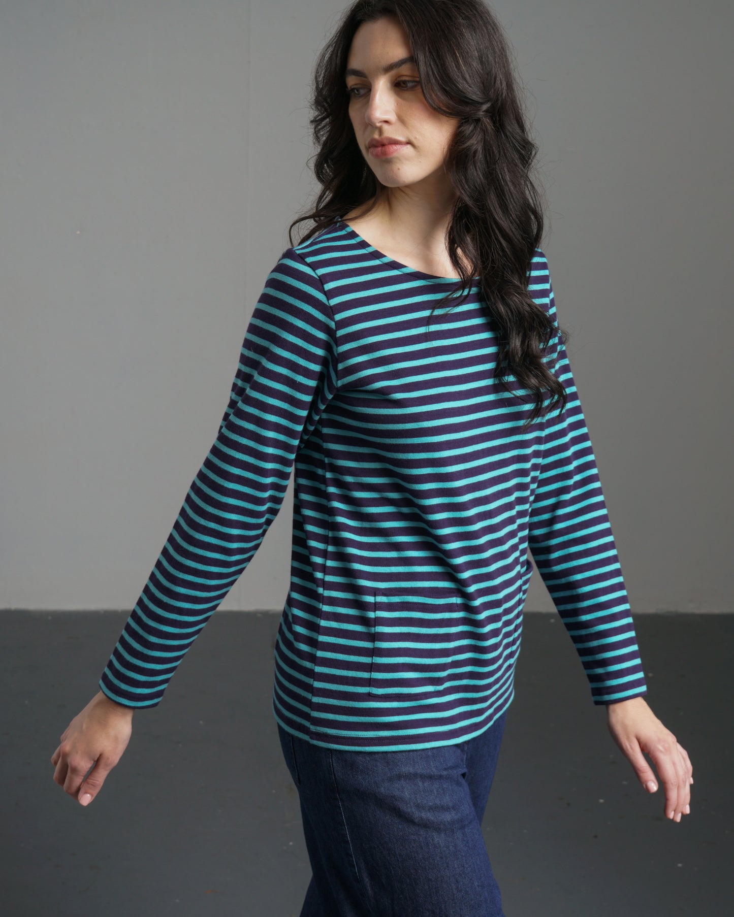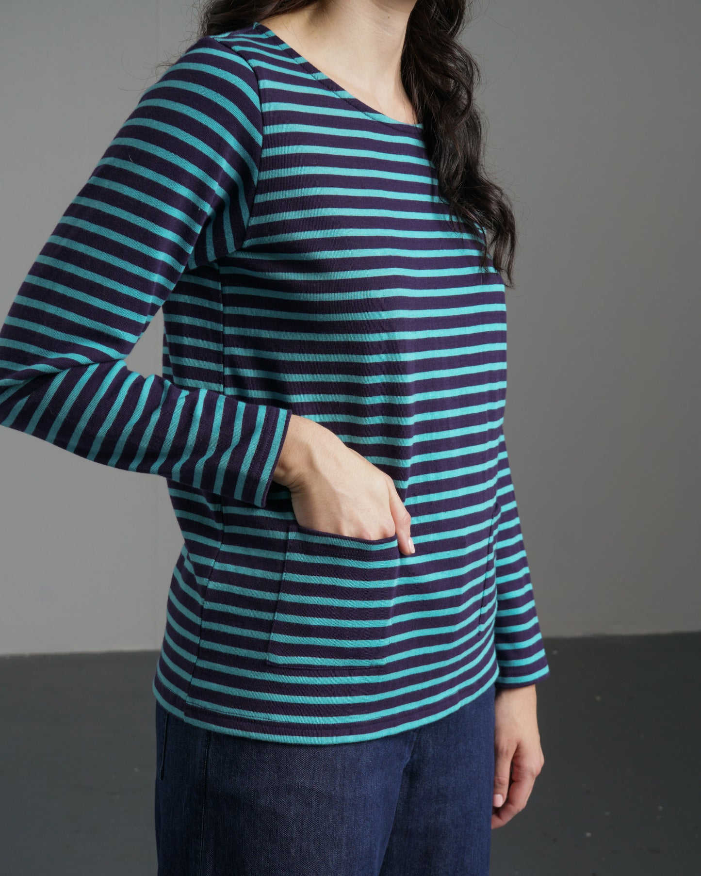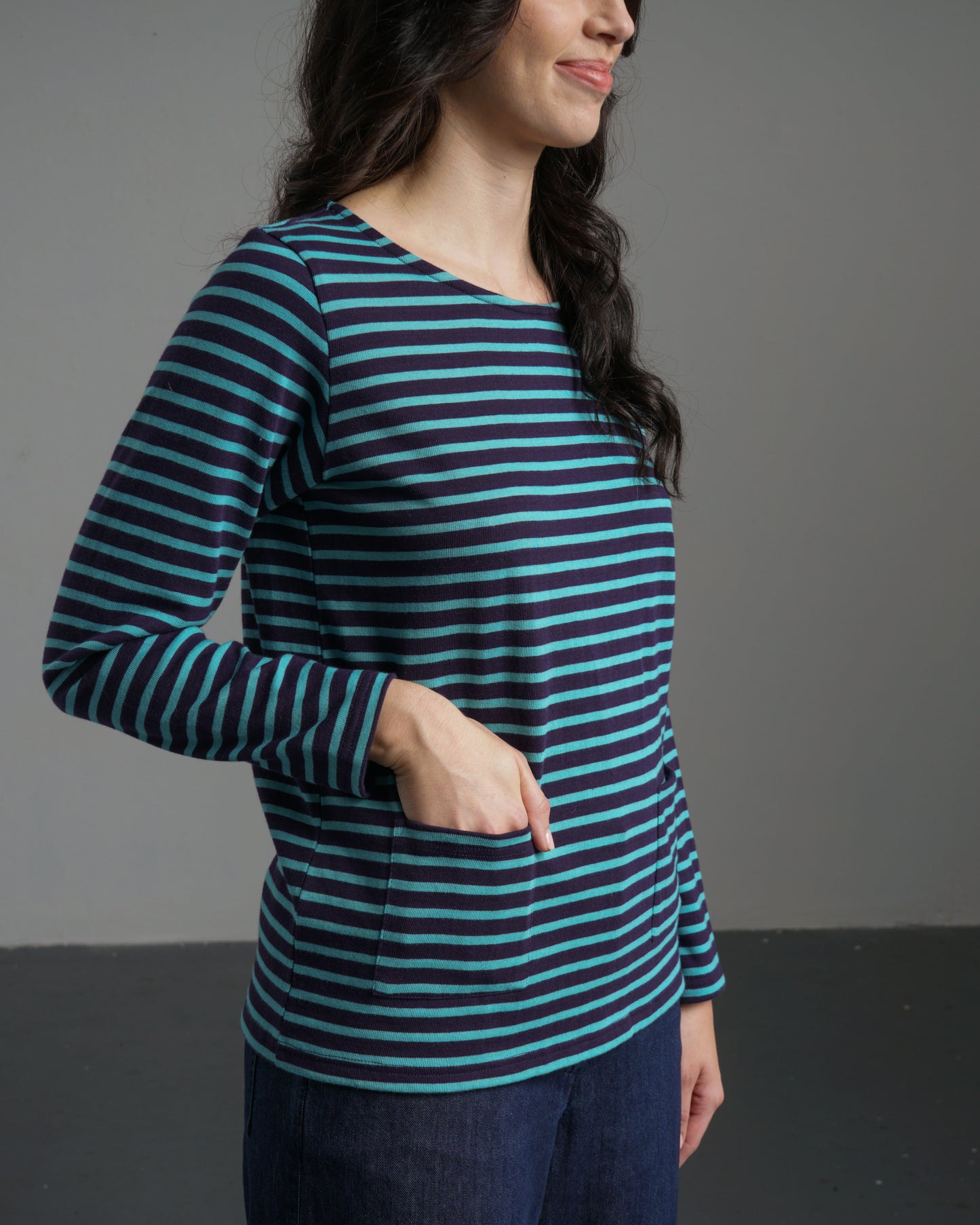 Our classic sailor T returns for Winter. Cut from rich, soft, organic cotton jersey, this timeless striped top is a true BIBICO staple. Designed with a boat neckline, twin-needle stitching, wrist-grazing sleeves and finished with two patch pockets. This season’s palette features two unique stripe combos: navy with retro blue, and navy with chartreuse — all custom-dyed and woven exclusively for us. The organic jersey cotton is mid-weight, soft and of a superior quality, making this a go-to layer with year-round appeal.
