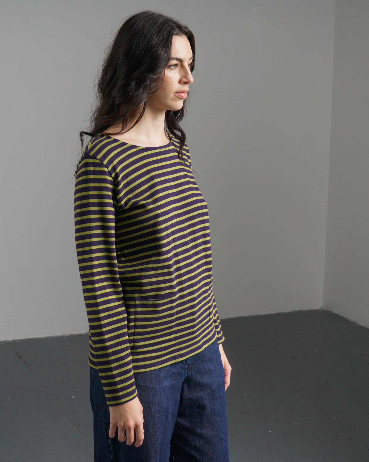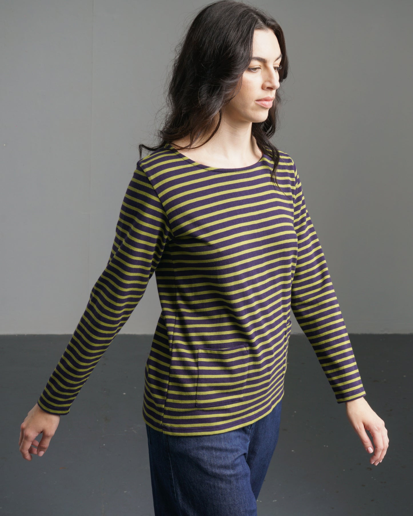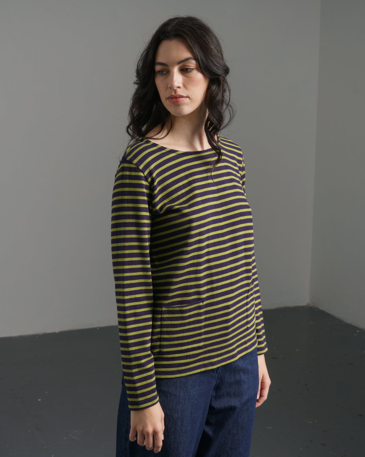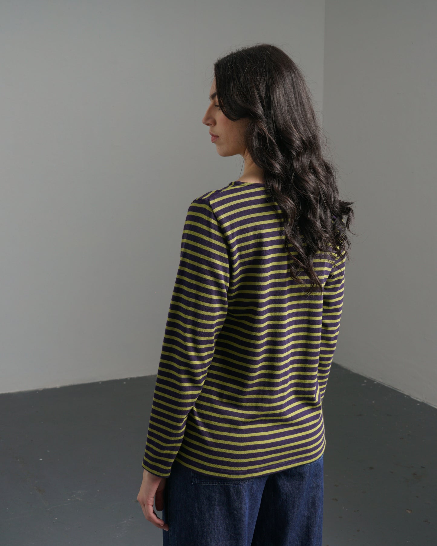 Our classic sailor T returns for Winter. Cut from rich, soft, organic cotton jersey, this timeless striped top is a true BIBICO staple. Designed with a boat neckline, twin-needle stitching, wrist-grazing sleeves and finished with two patch pockets. This season’s palette features two unique stripe combos: navy with retro blue, and navy with chartreuse — all custom-dyed and woven exclusively for us. The organic jersey cotton is mid-weight, soft and of a superior quality, making this a go-to layer with year-round appeal.