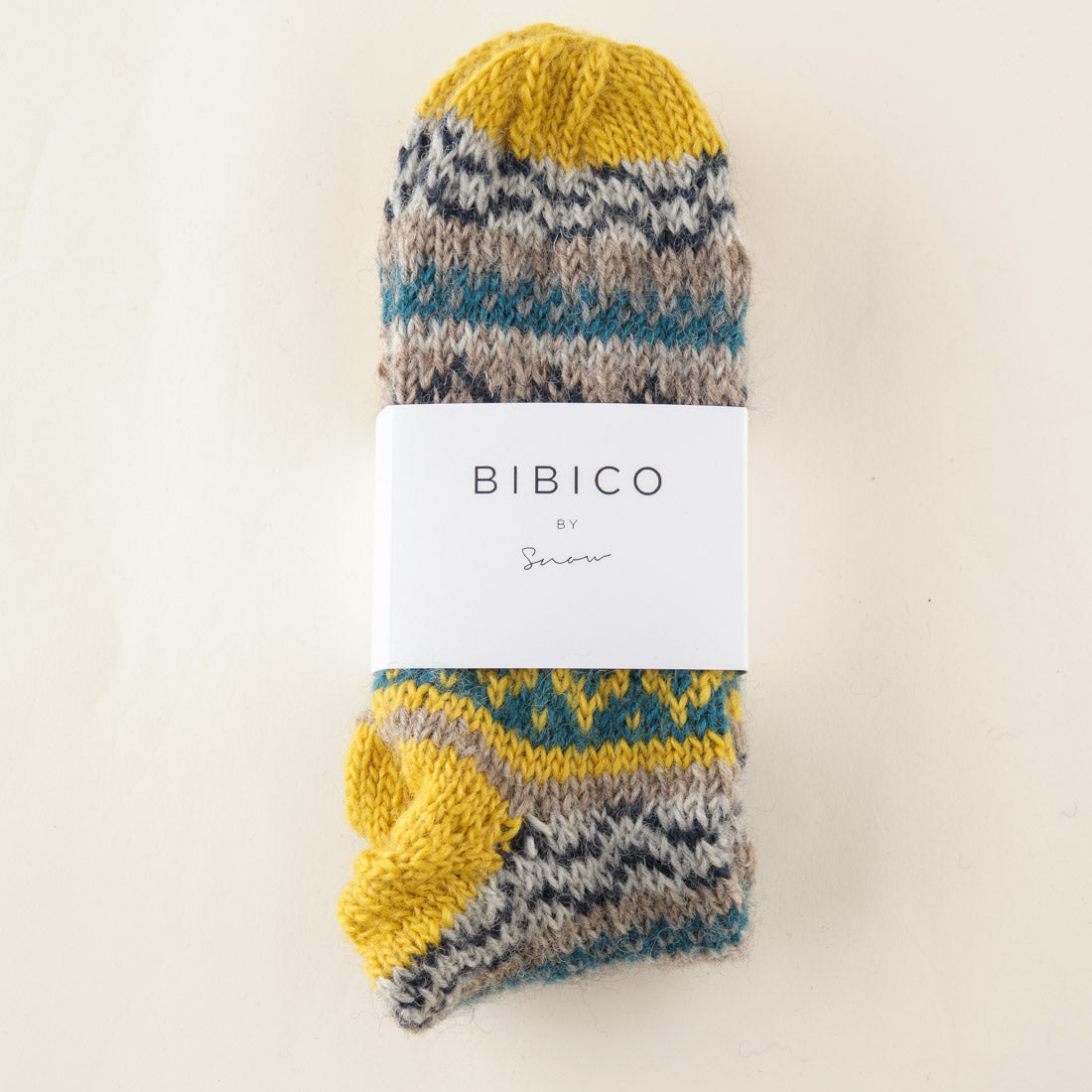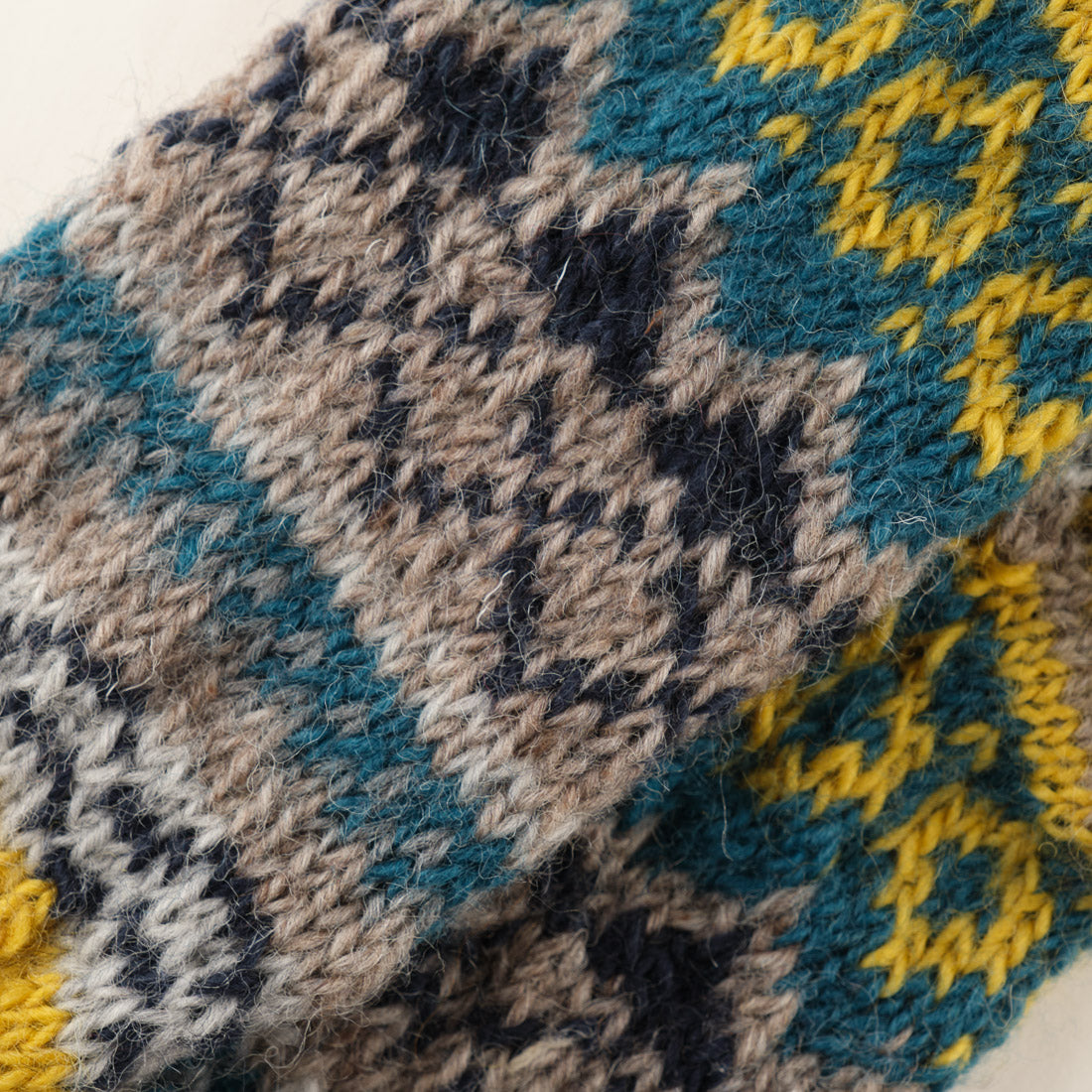 Colourful fair isle socks hand knitted in soft pure wool. Perfect for lounging at home or great to use as boot socks. Our best-selling hand knitted socks are the ultimate home accessory and come with a drawstring cotton bag, making them the perfect gift.