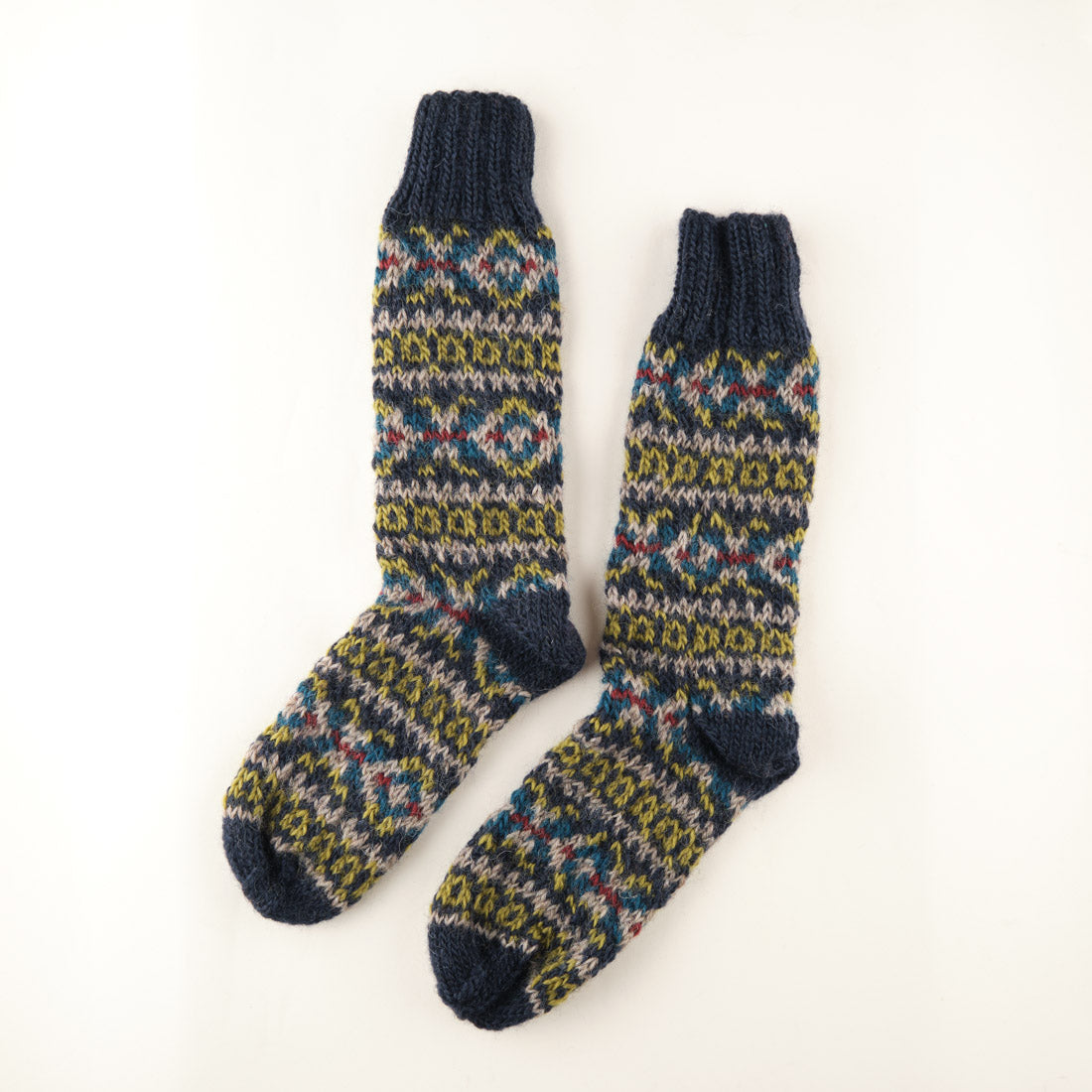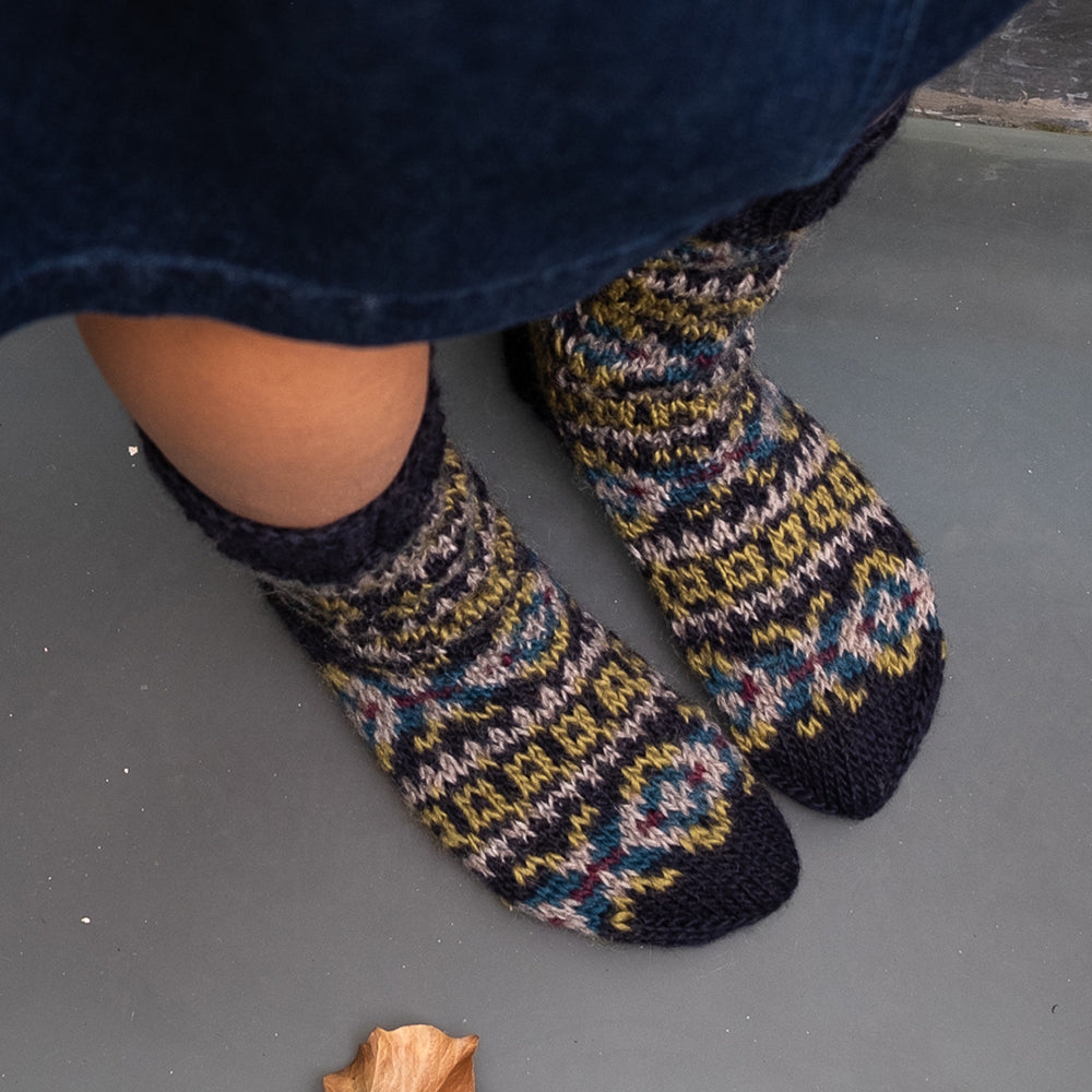 Colourful fair isle socks hand knitted in soft pure wool. Perfect for lounging at home or great to use as boot socks. Our best-selling hand knitted socks are the ultimate home accessory and come with a drawstring cotton bag, making them the perfect gift.