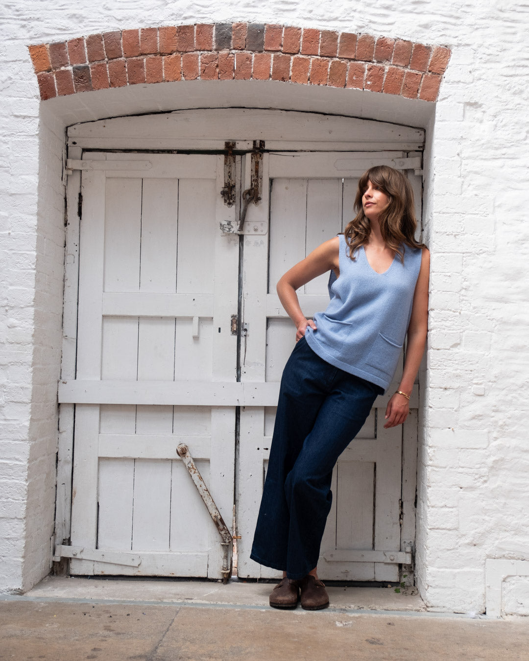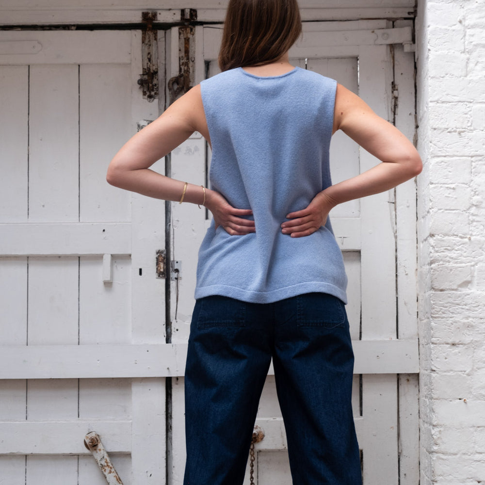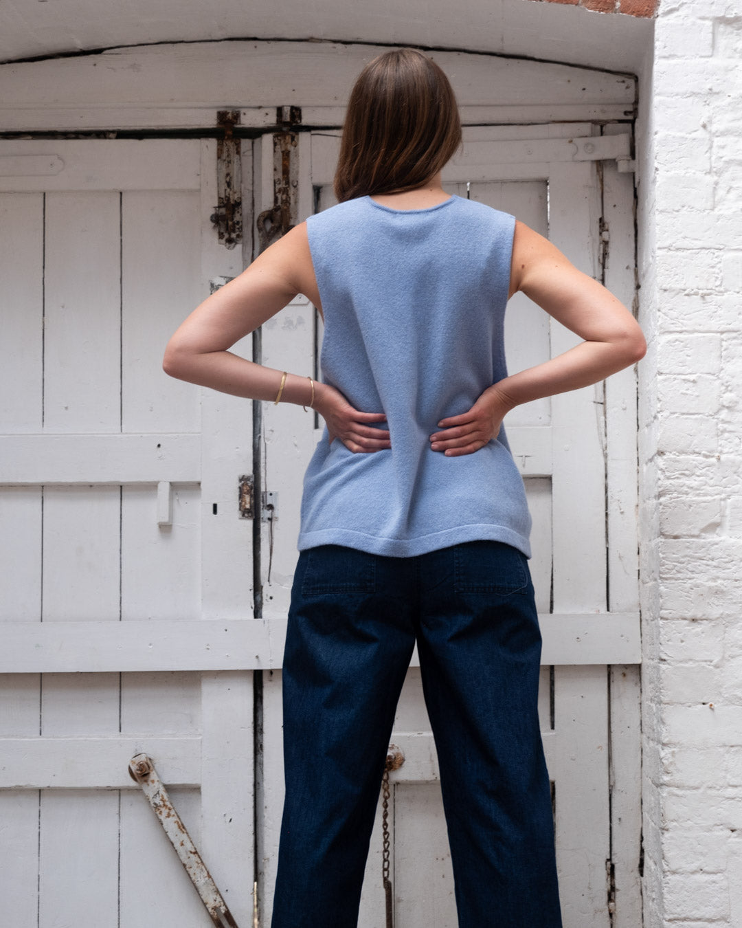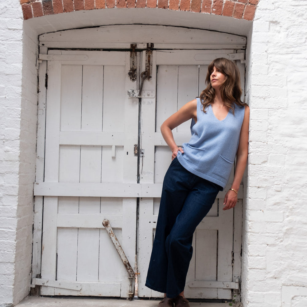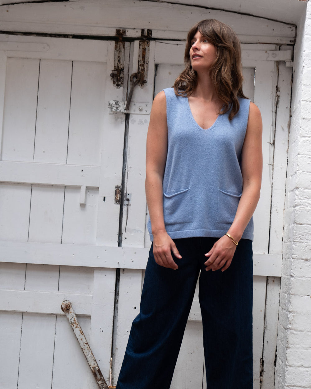 Regular price £59.00This sleeveless top is made from a very special mid-weight pure merino wool. Known for its softness and natural breathability, it will bring you warmth when it’s needed, but you won’t overheat. Featuring a deep V-neckline, it has a straight cut and sits at the lower waist. It is finished with two practical patch pockets.