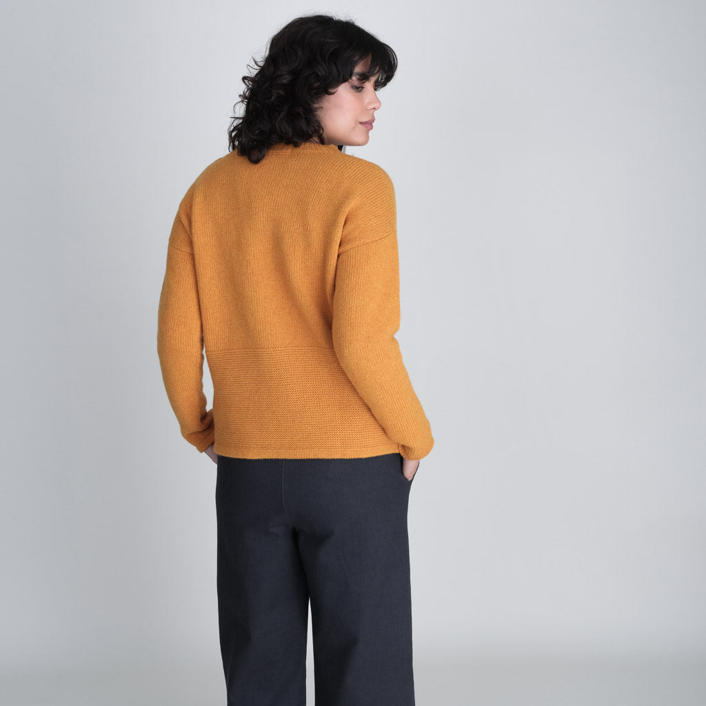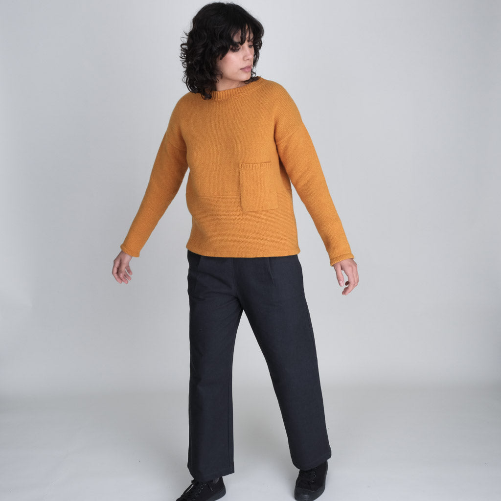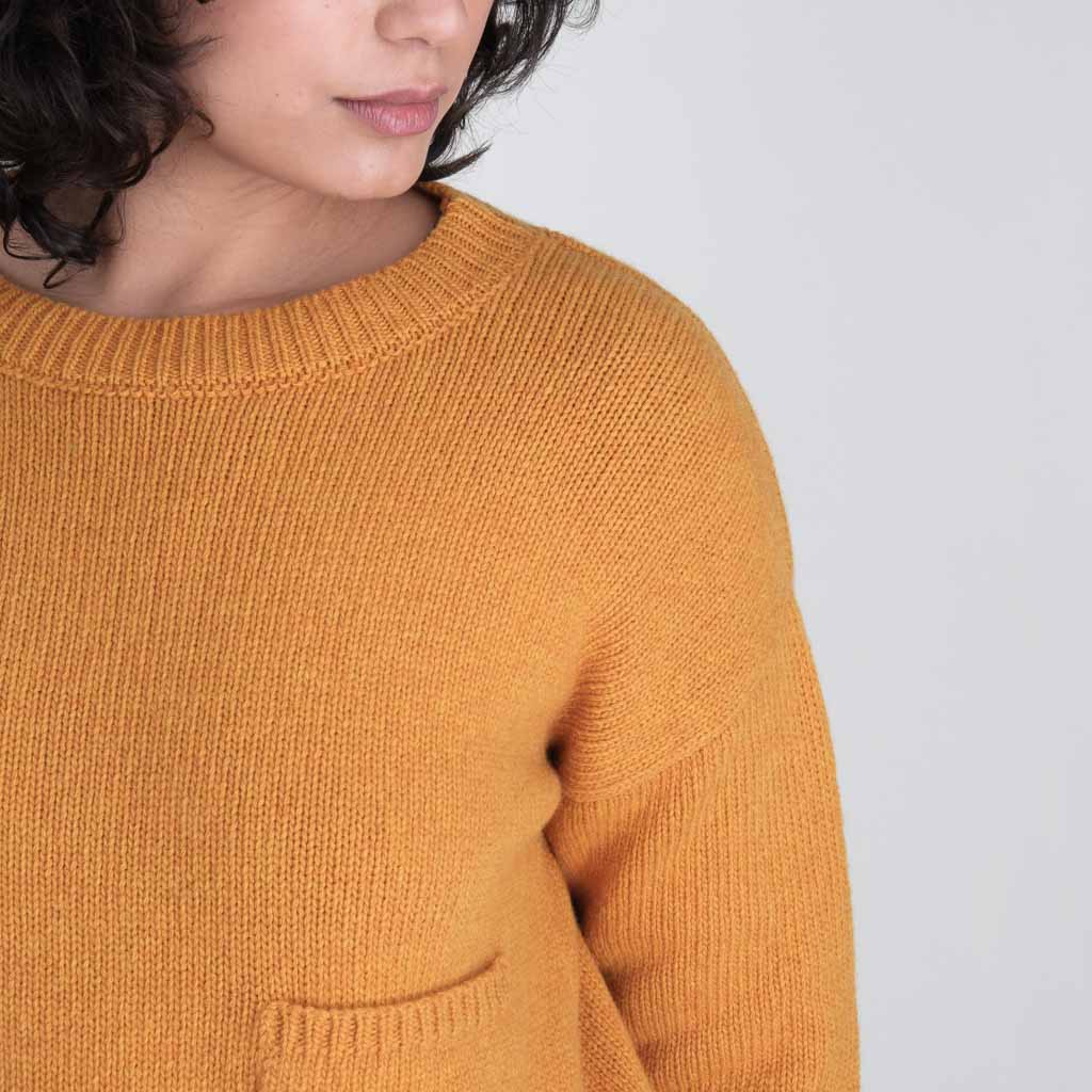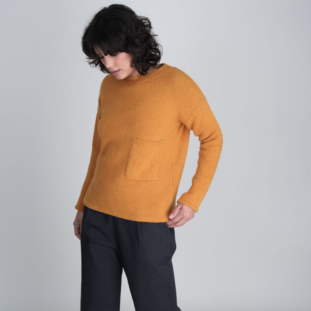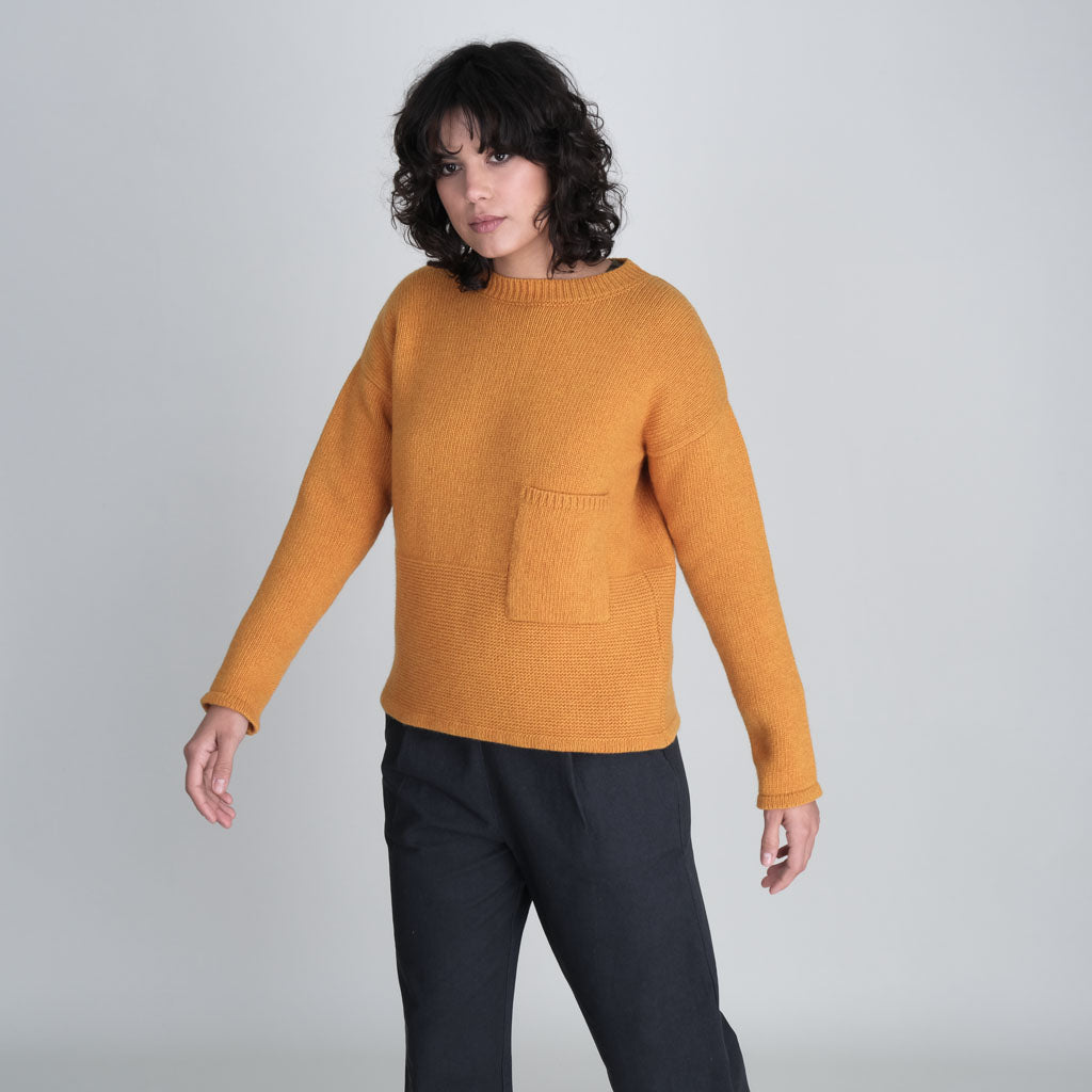 A Bibico favourite. Round necked jumper knitted in a soft, rich merino wool with textured knit detail. Made in a warm amber coloured yarn to bring a splash of colour to winter. A heavy-weight knit with a timeless shape. Slightly boxy fit. Relaxed cropped cut. Fine rib pattern at the hem. Large patch pocket.
