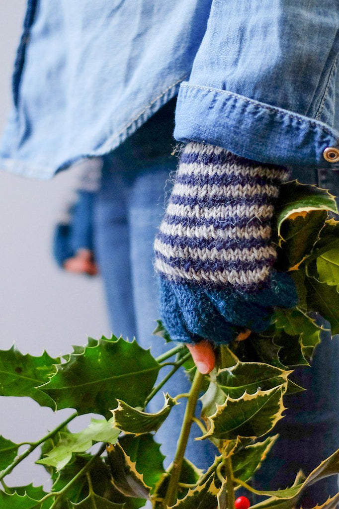 Classic hand knitted fingerless gloves with stripes. 100% Wool.