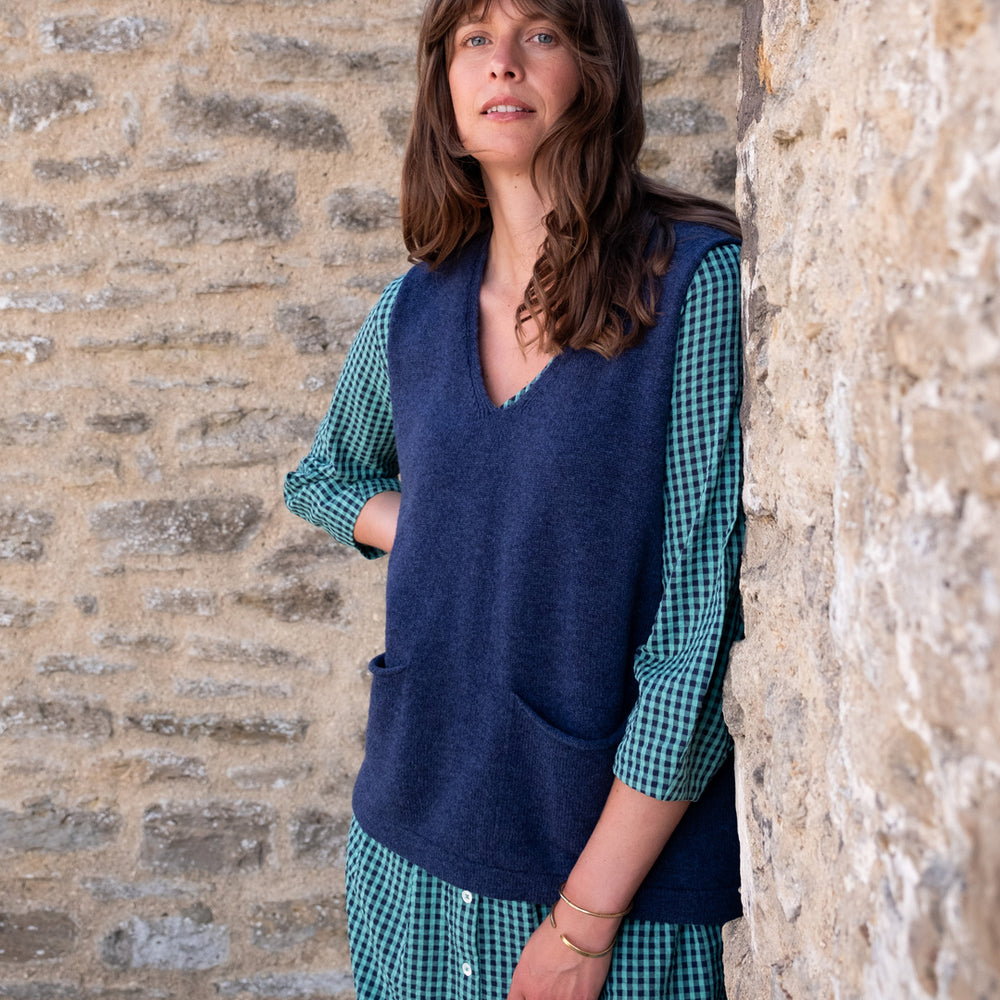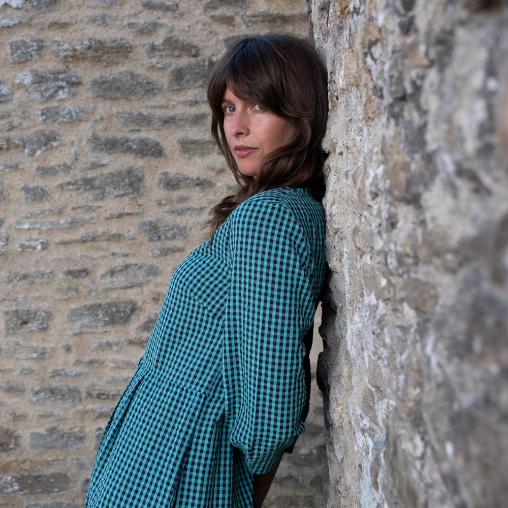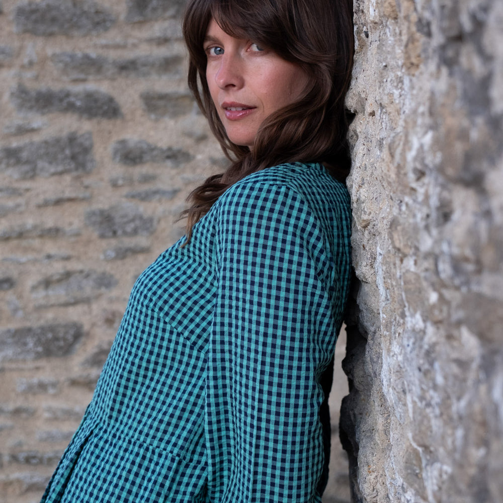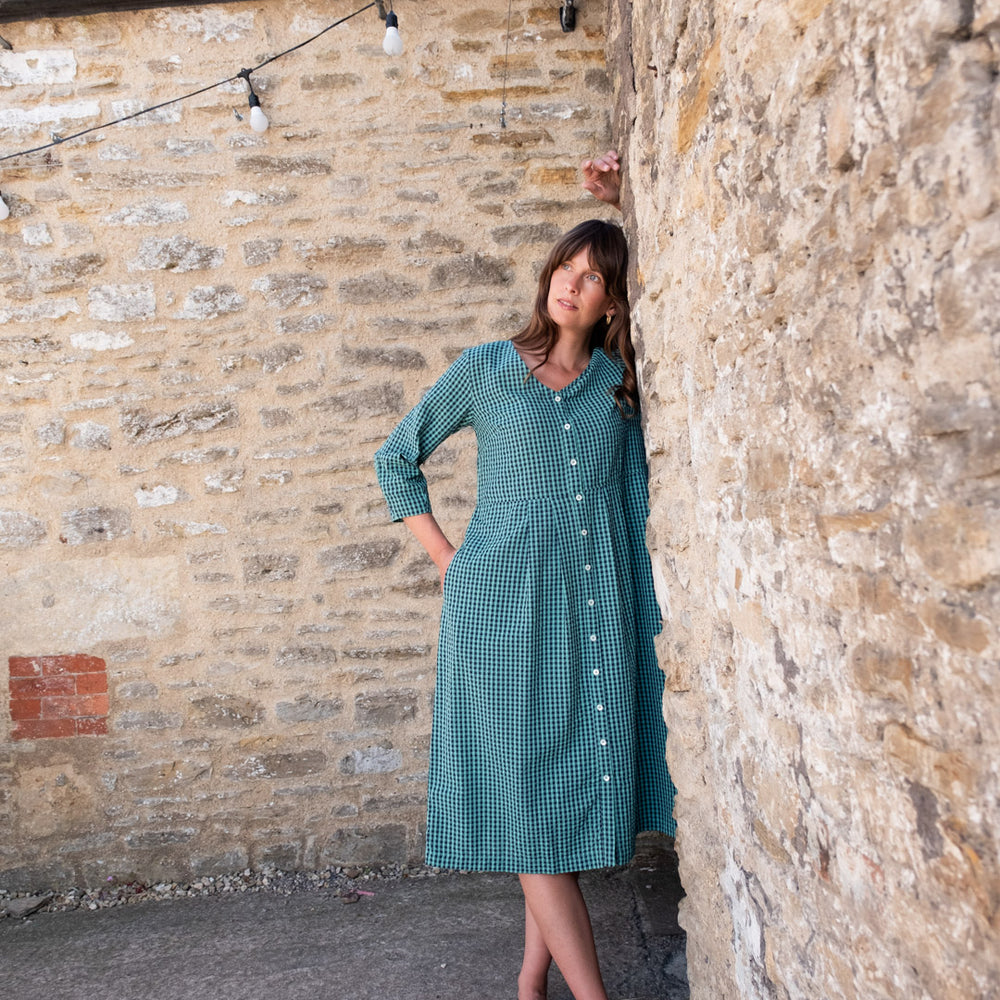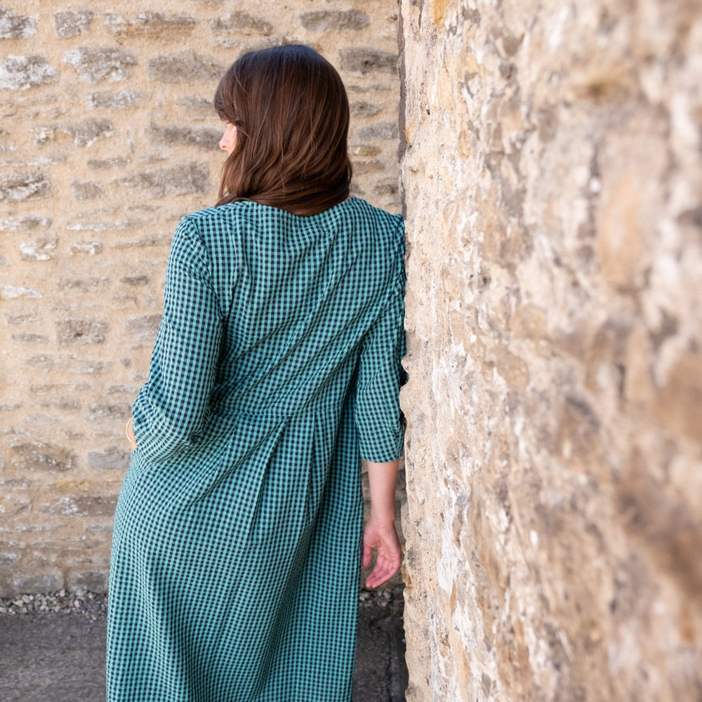 This easy-to-wear day dress is made in 100% cotton with a seersucker finish and a tiny check in duck egg and navy blue. It is a classic, simple style made from high-quality natural fibres.