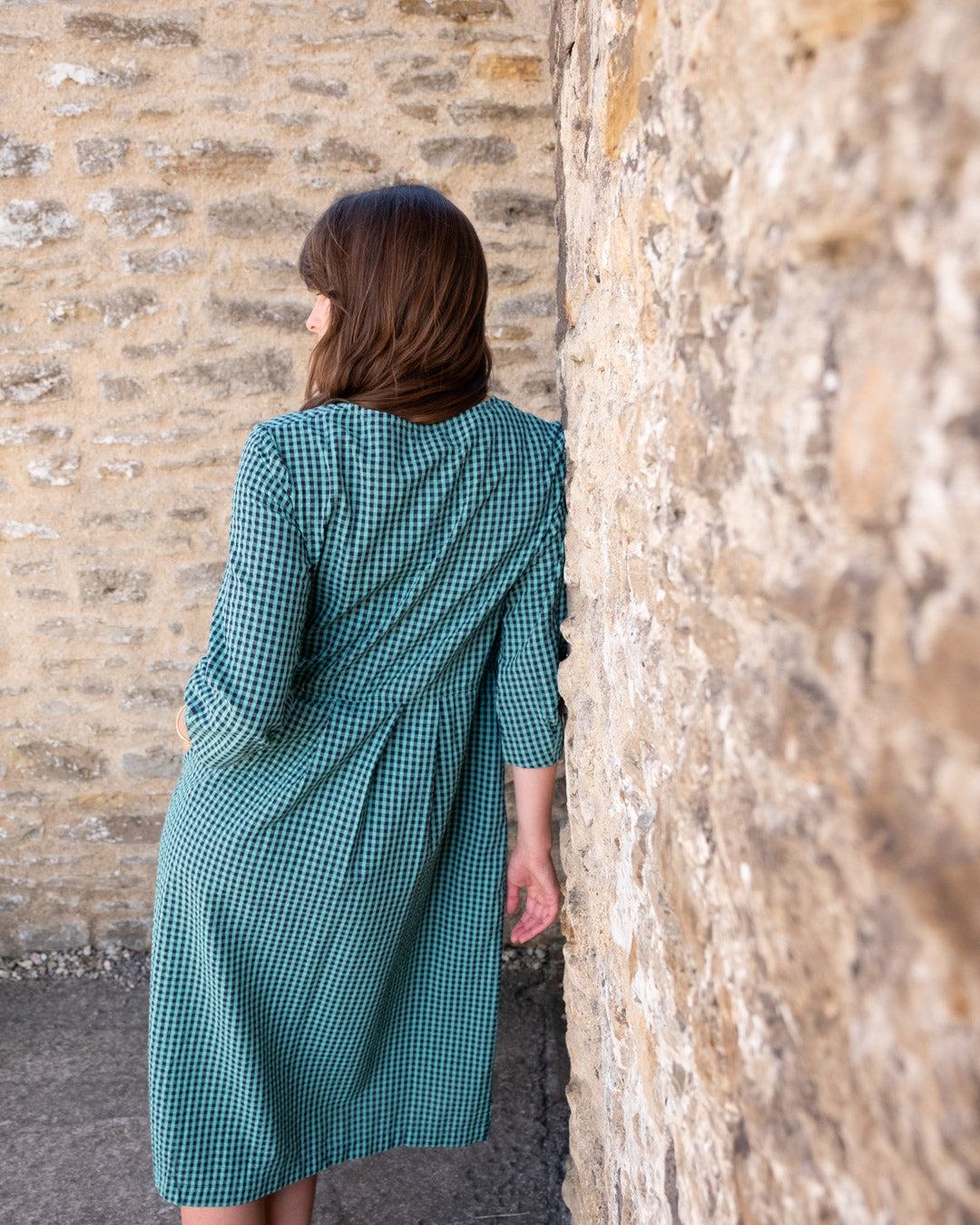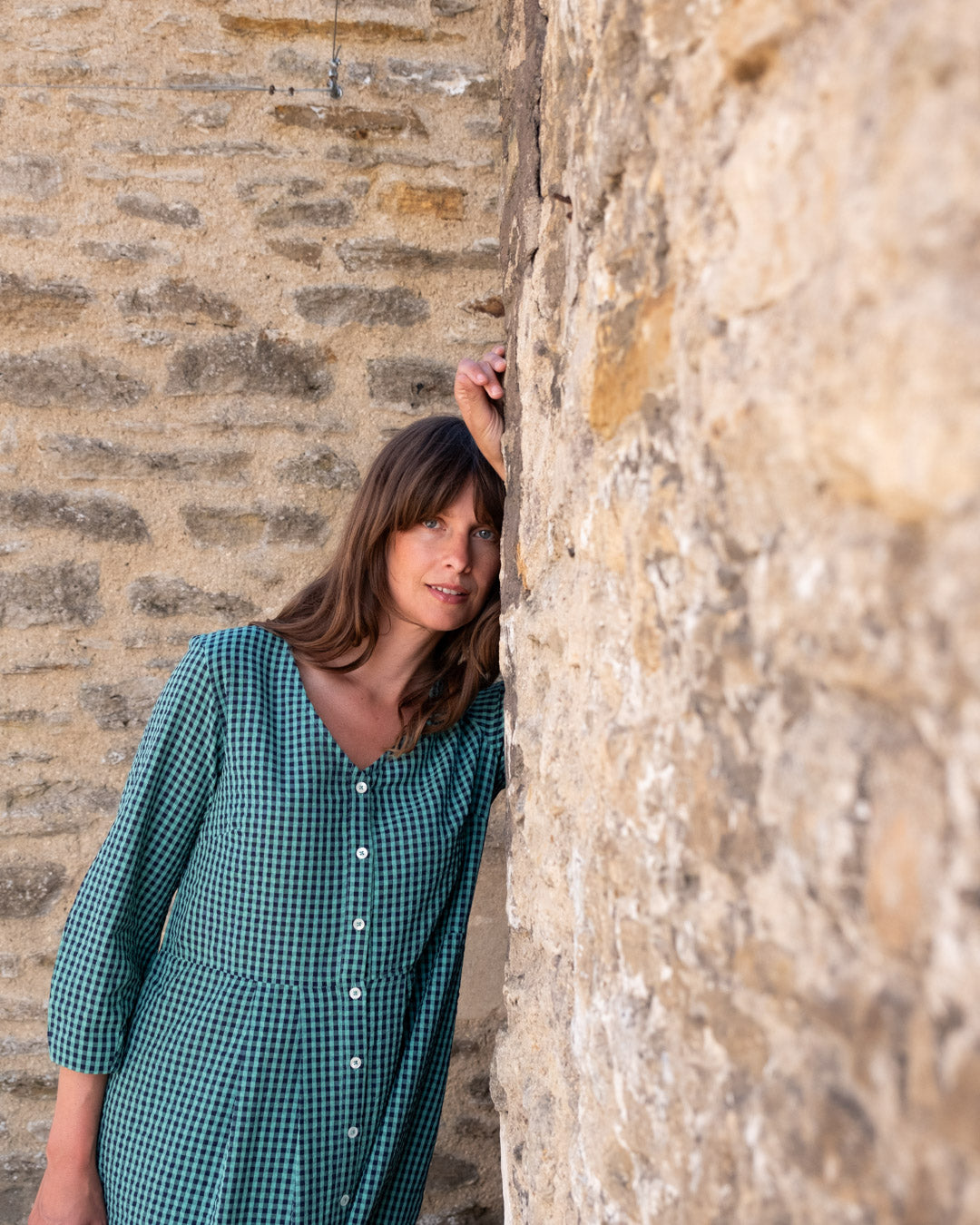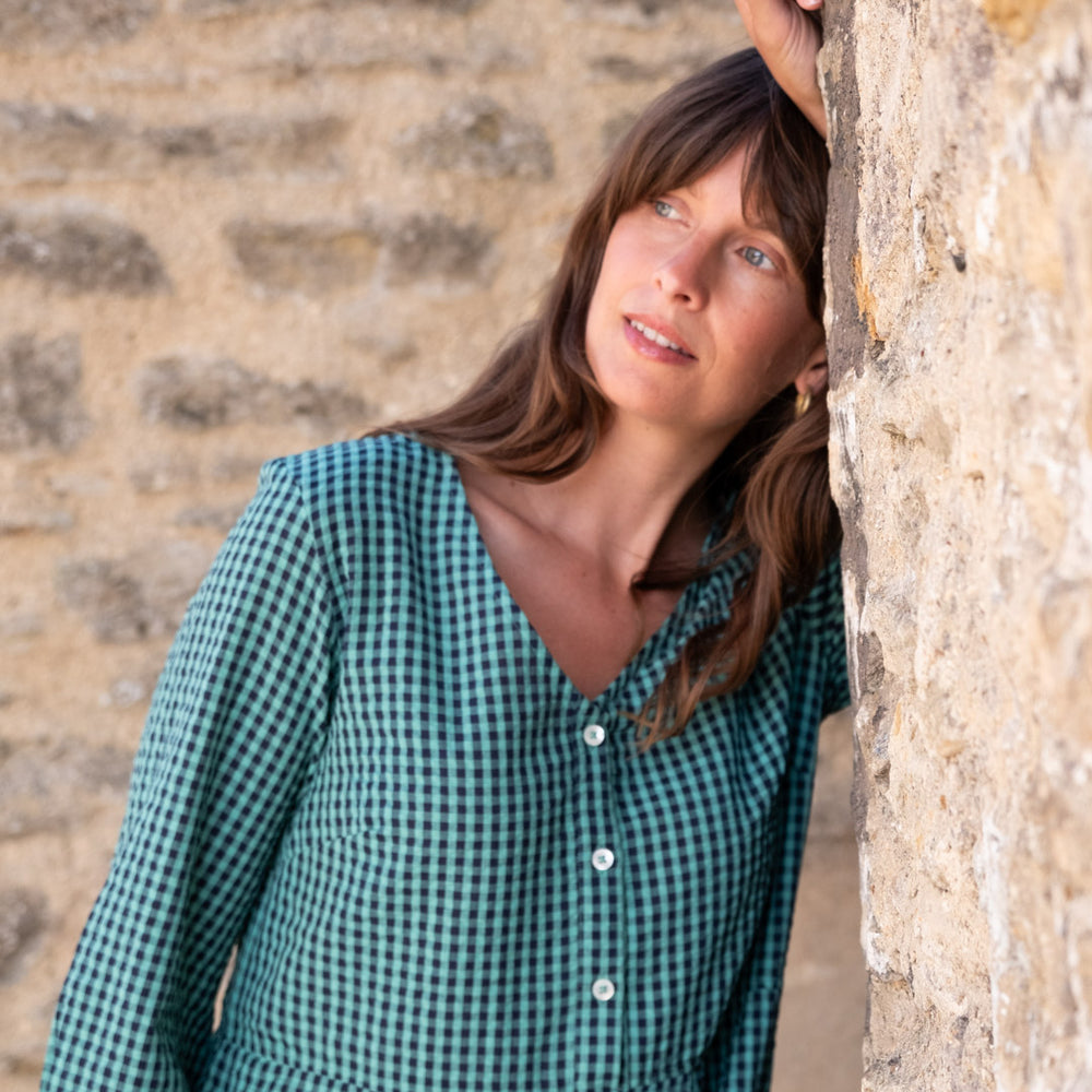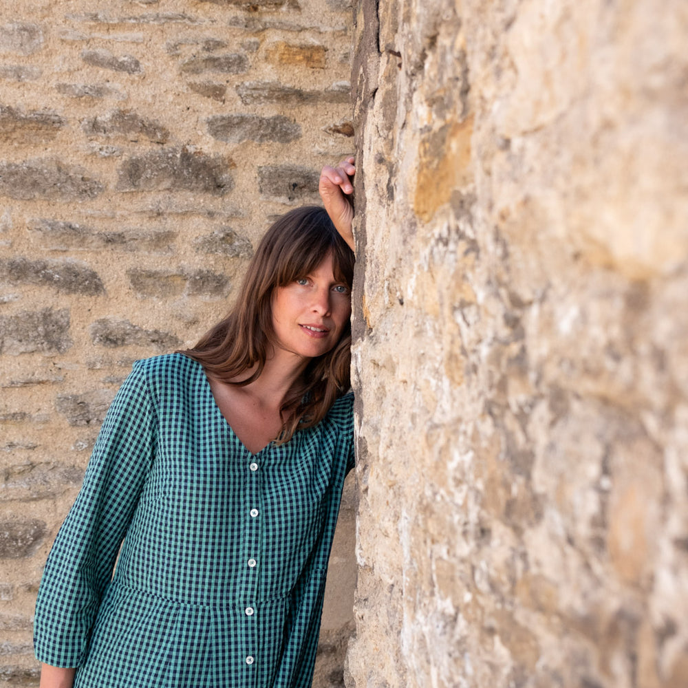 The Jane Midi dress is a new shape for this season, designed in response to requests for a loose-fitting V-neck dress. This relaxed button-down day dress features bracelet sleeves with a subtle balloon shape, a seam at the waist, and two side pockets.