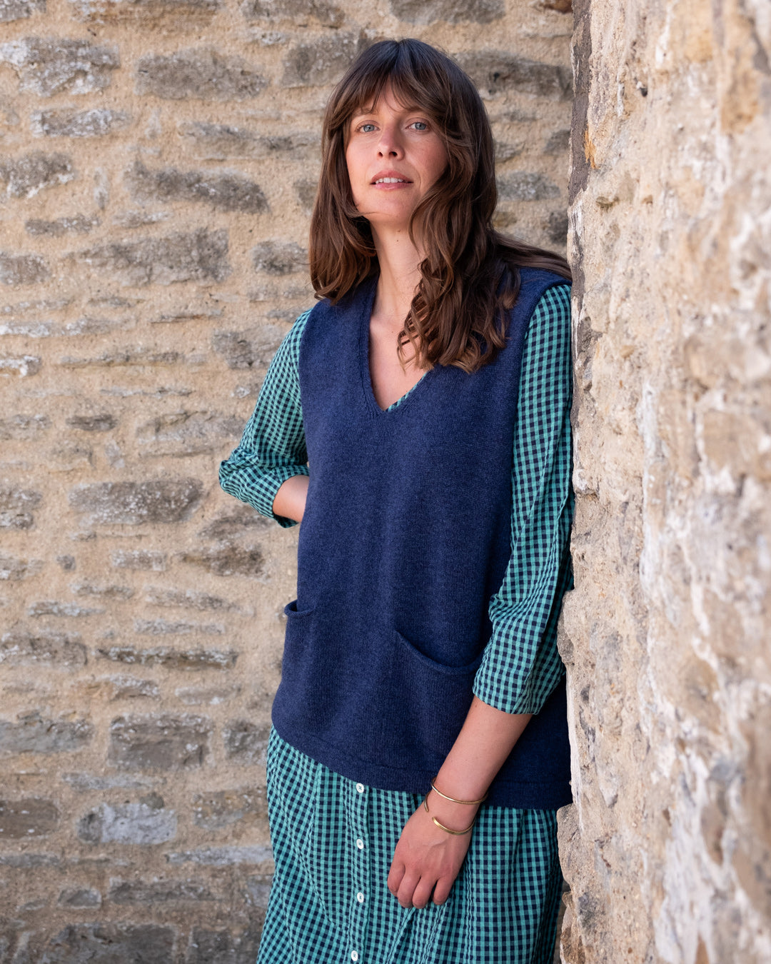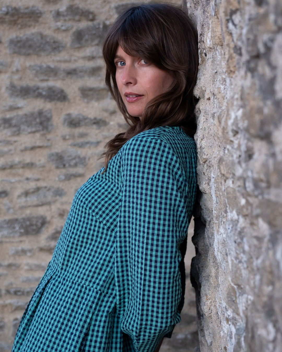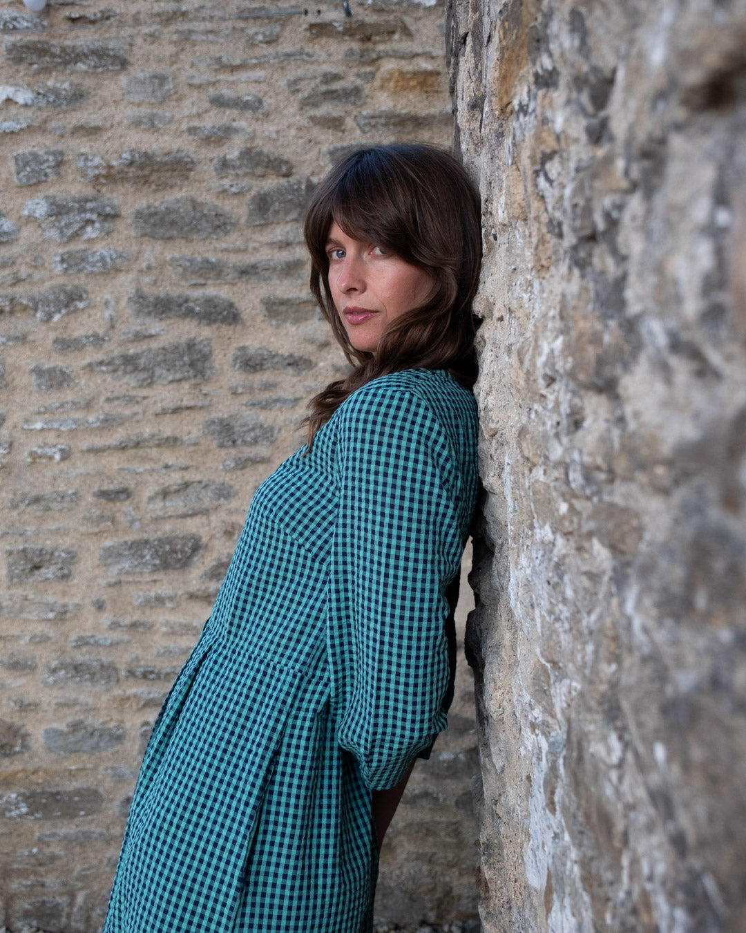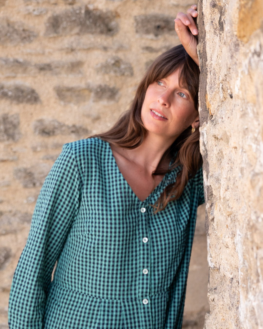 The Jane Midi dress is a new shape for this season, designed in response to requests for a loose-fitting V-neck dress. This relaxed button-down day dress features bracelet sleeves with a subtle balloon shape, a seam at the waist, and two side pockets.