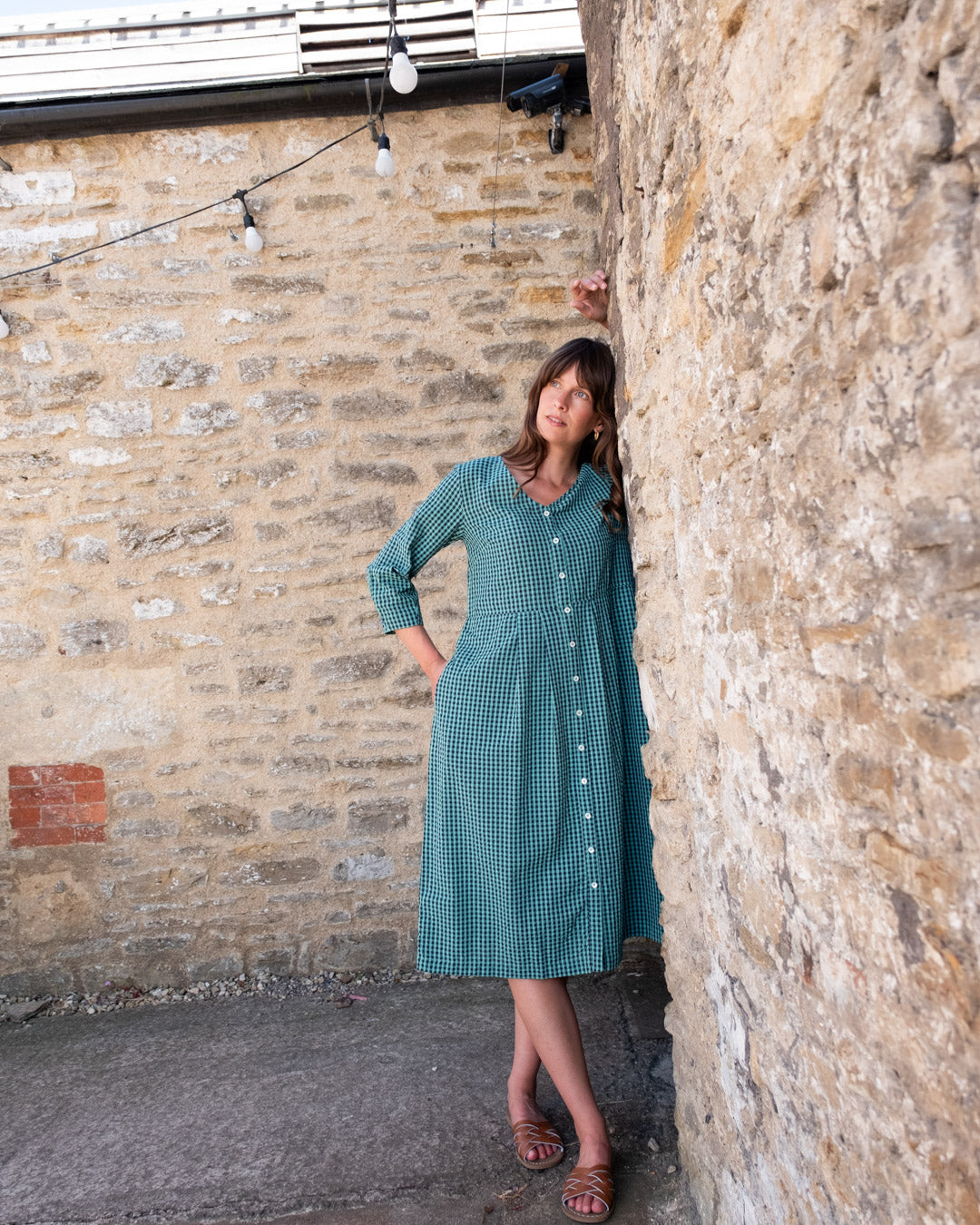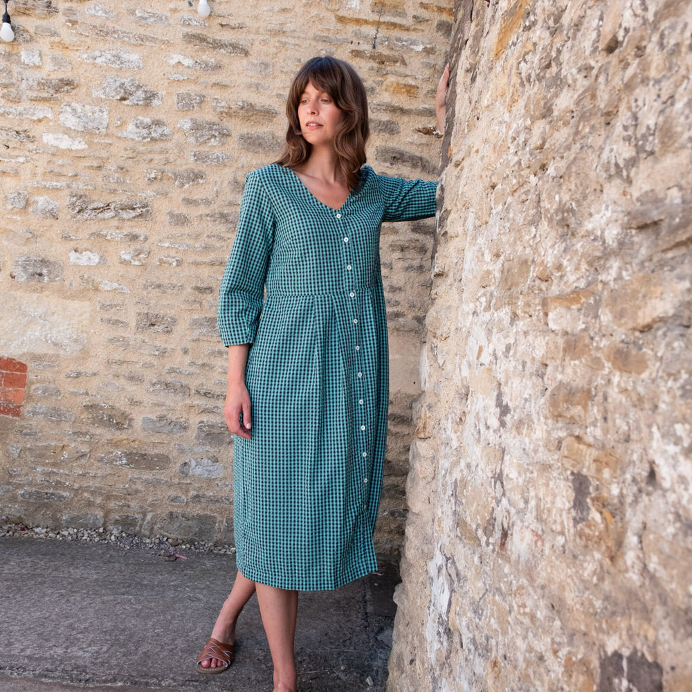 Regular price £59.00The Jane Midi dress is a new shape for this season, designed in response to requests for a loose-fitting V-neck dress. This relaxed button-down day dress features bracelet sleeves with a subtle balloon shape, a seam at the waist, and two side pockets.