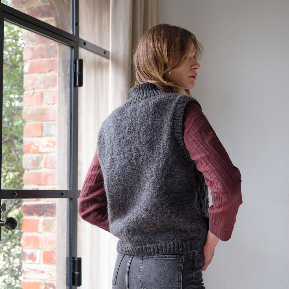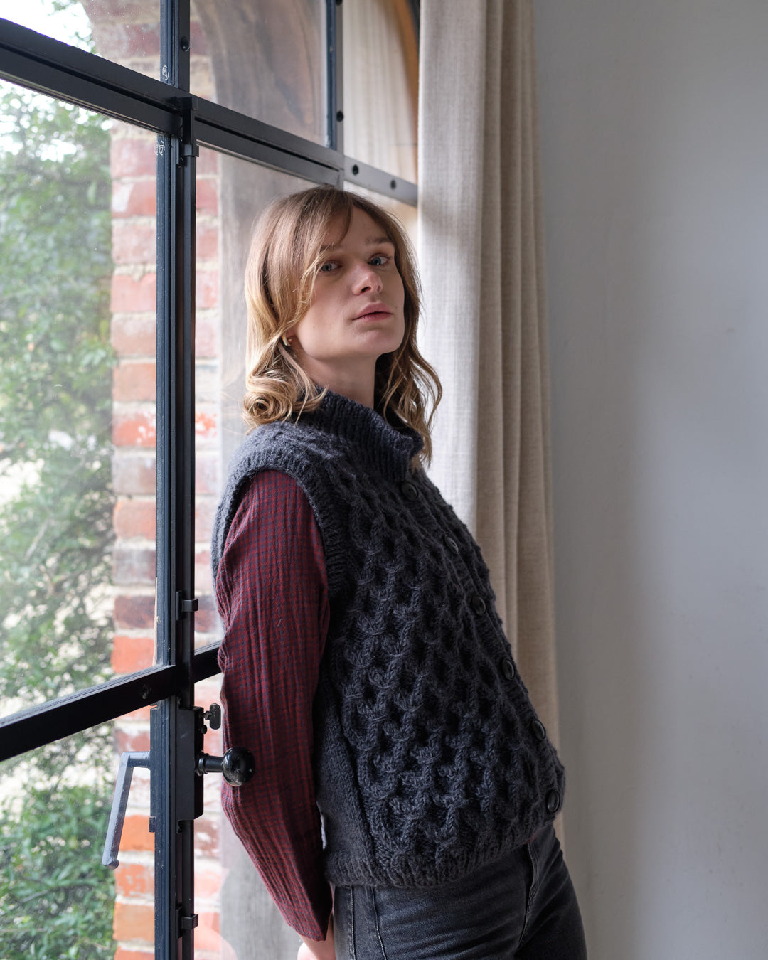 This gilet-style hand-knitted vest combines functionality and style in the cosiest way. Crafted from a special hand-spun, hand-dyed yarn blend of mohair and sheep wool, it wraps you in softness and warmth. The vest features intricate Aran pattern work on the front, a polo collar, and sustainable engraved buttons. It's a versatile layering piece you'll treasure and wear all season long; made in an autumnal whiskey hue, it will add a rich, earthy tone to your winter wardrobe. What makes these knits truly special is the artistry behind them. Each one is meticulously crafted by skilled artisans, often in their own homes, taking a week to complete – they are the essence of slow fashion. We honour their exceptional craftsmanship with a signature on the label, making each vest a unique piece that blends quality and personal touch.
