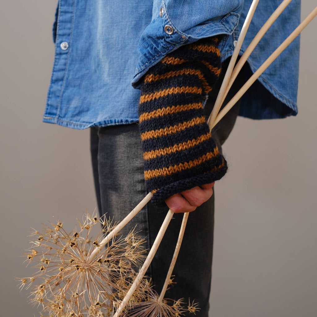 Long and cosy fingerless gloves with an contrast stripe. Roll edge at cuffs and fingers opening. Hand knitted in a ladies cooperative in Nepal. 25cm long. 100% Wool.